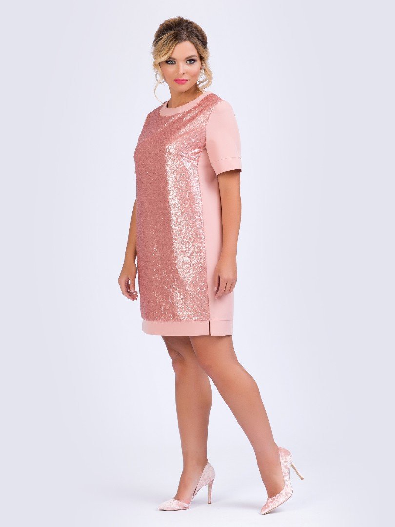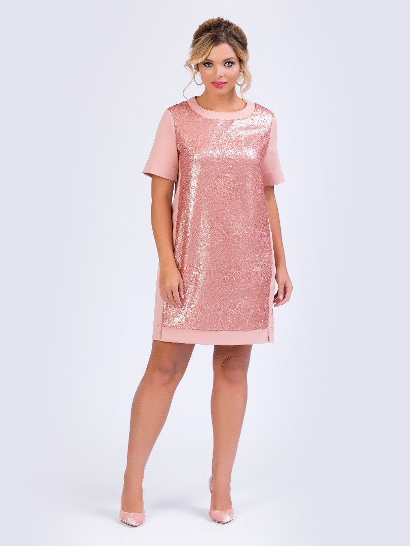 Эффектное платье прямого силуэта. Выполнено из комбинированных тканей – костюмной и пайеточной пудрового цвета. Круглый вырез горловины обработан внешней обтачкой. Короткие втачные рукава деликатно прикрывают плечи. Передняя часть с пайетками делает образ нарядным. Низ с притачной манжетой и аккуратными разрезами.Характеристики: