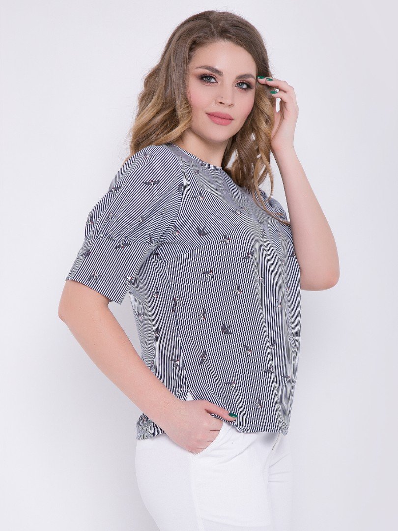 Романтичная блузка их нежного крепа в полоску с принтом “птички" и рукавом на сборке.