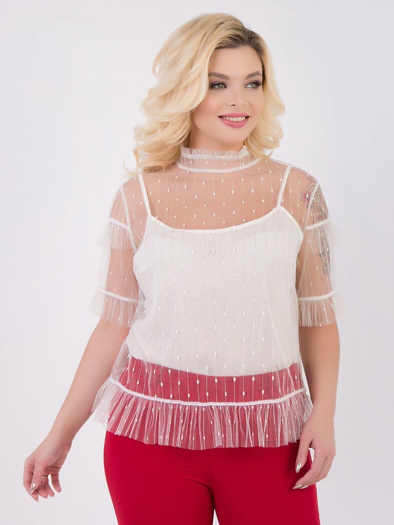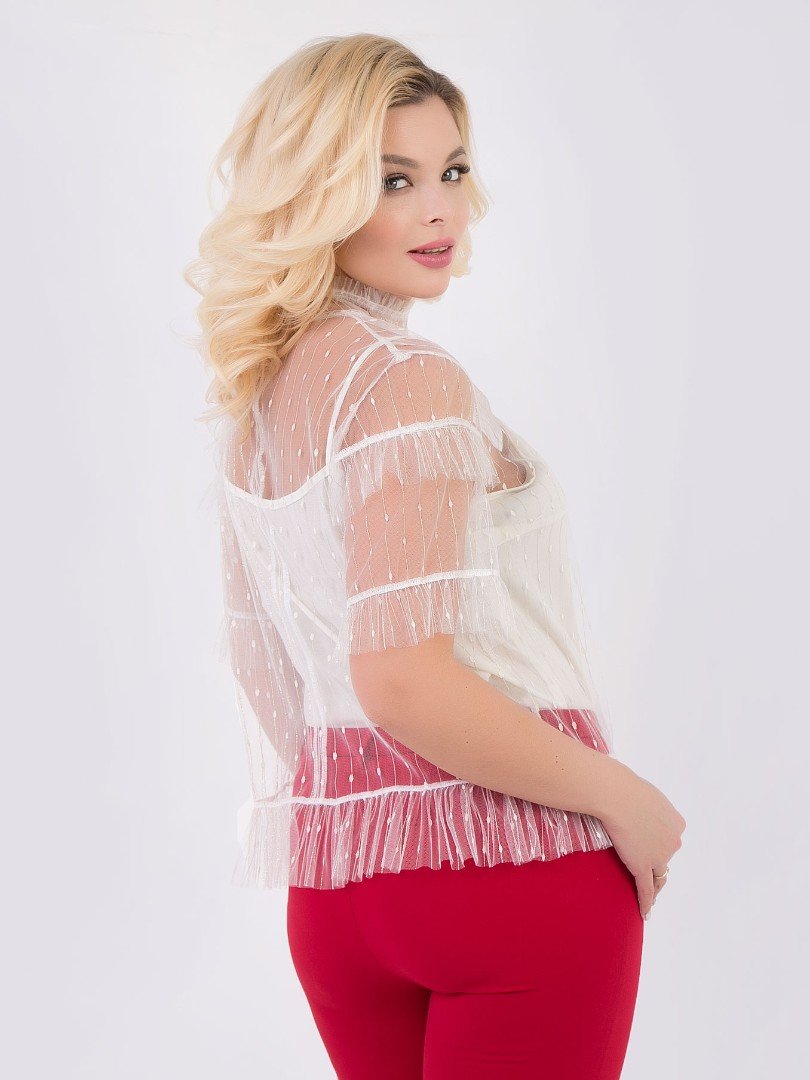 Романтическая блузка прямого силуэта выполнена из прозрачной сетки с узором.