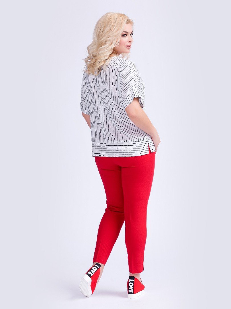 Удобная блуза прямого силуэта из вискозного штапеля с принтом "полоска". Горловина оформлена круглым вырезом. Короткие цельнокроеные рукава дополнены отворотами и патами на пуговицах. По линии бедер широкий притачной пояс с разрезами по бокам. Блуза прекрасно сочетается с повседневными брюками и юбками.Характеристики: