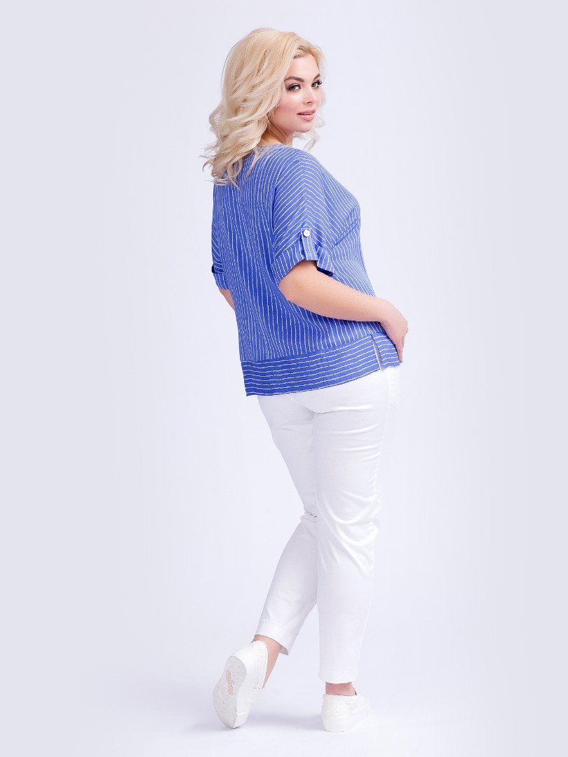 Удобная блуза прямого силуэта из вискозного штапеля с принтом "полоска". Горловина оформлена круглым вырезом. Короткие цельнокроеные рукава дополнены отворотами и патами на пуговицах. По линии бедер широкий притачной пояс с разрезами по бокам. Блуза прекрасно сочетается с повседневными брюками и юбками.