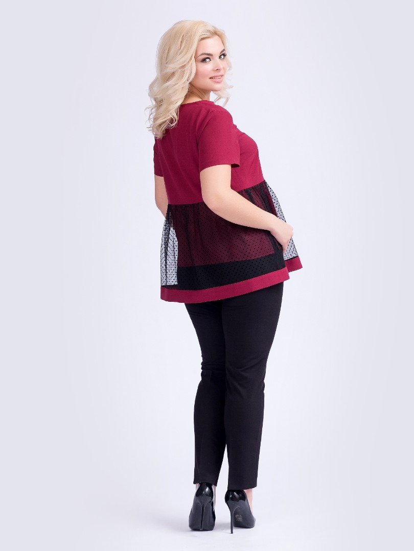 Женственная блуза А-силуэта выполнена из однотонного крепа винного оттенка. Круглая горловина оформлена косой бейкой. Короткие втачные рукава прикрывают плечи. Линия талии завышена и акцентирована баской из контрастной сетки с набивным рисунком и с широкой полосой крепа по краю. Низ блузы ровный, с небольшими разрезами по бокам. Блуза без застежки.Характеристики: