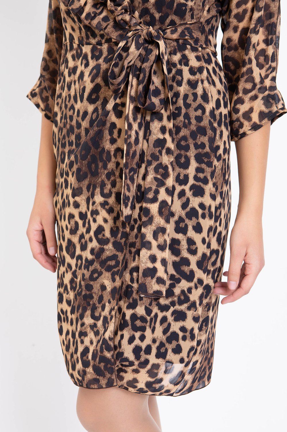 Комплект женский состоит из двух платьев : верхнее выполнено из шифона, нижнее из вискозы и используется в качестве подкладки. Платье верхнее прямого силуэта, отрезное по линии талии, с запахом, с завязывающимися полупоясами. Рукав цельнокроеный, 3/4.По горловине переда с правой стороны выполнен декор в виде заложенных складок из основной ткани.Характеристики: