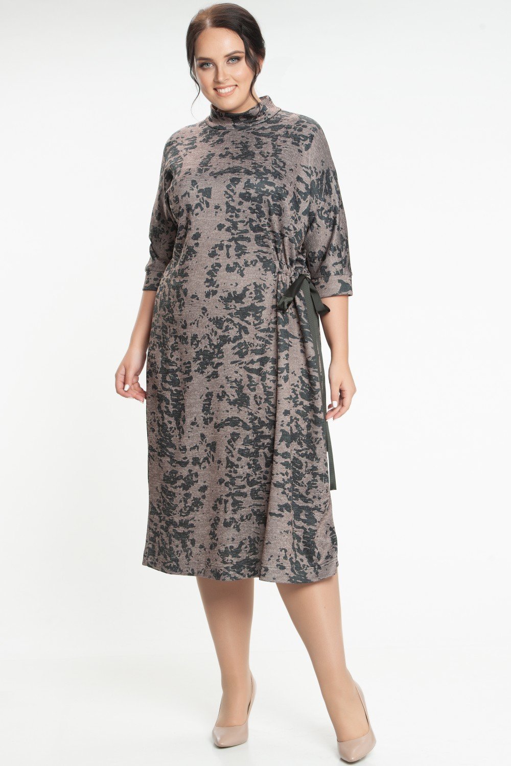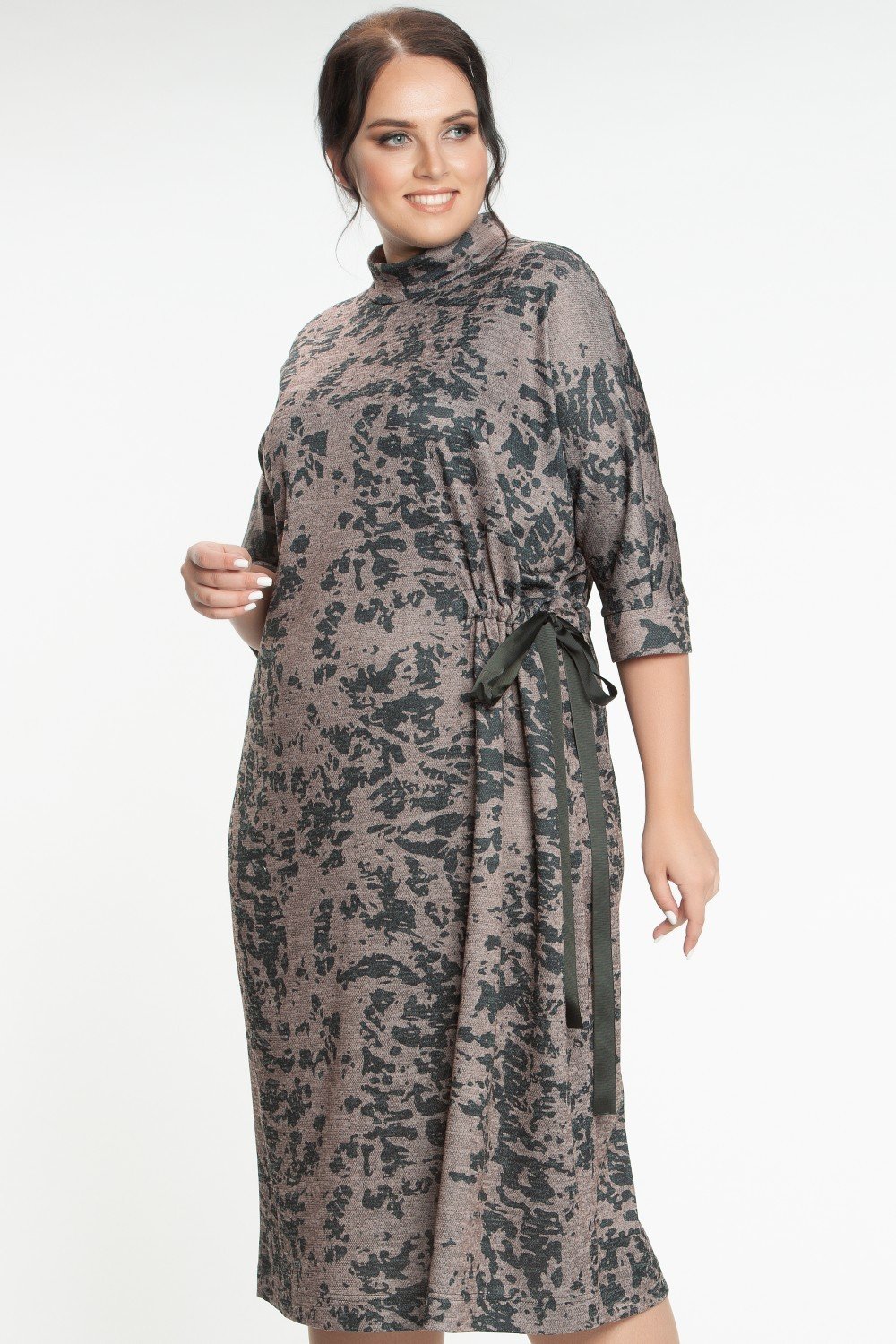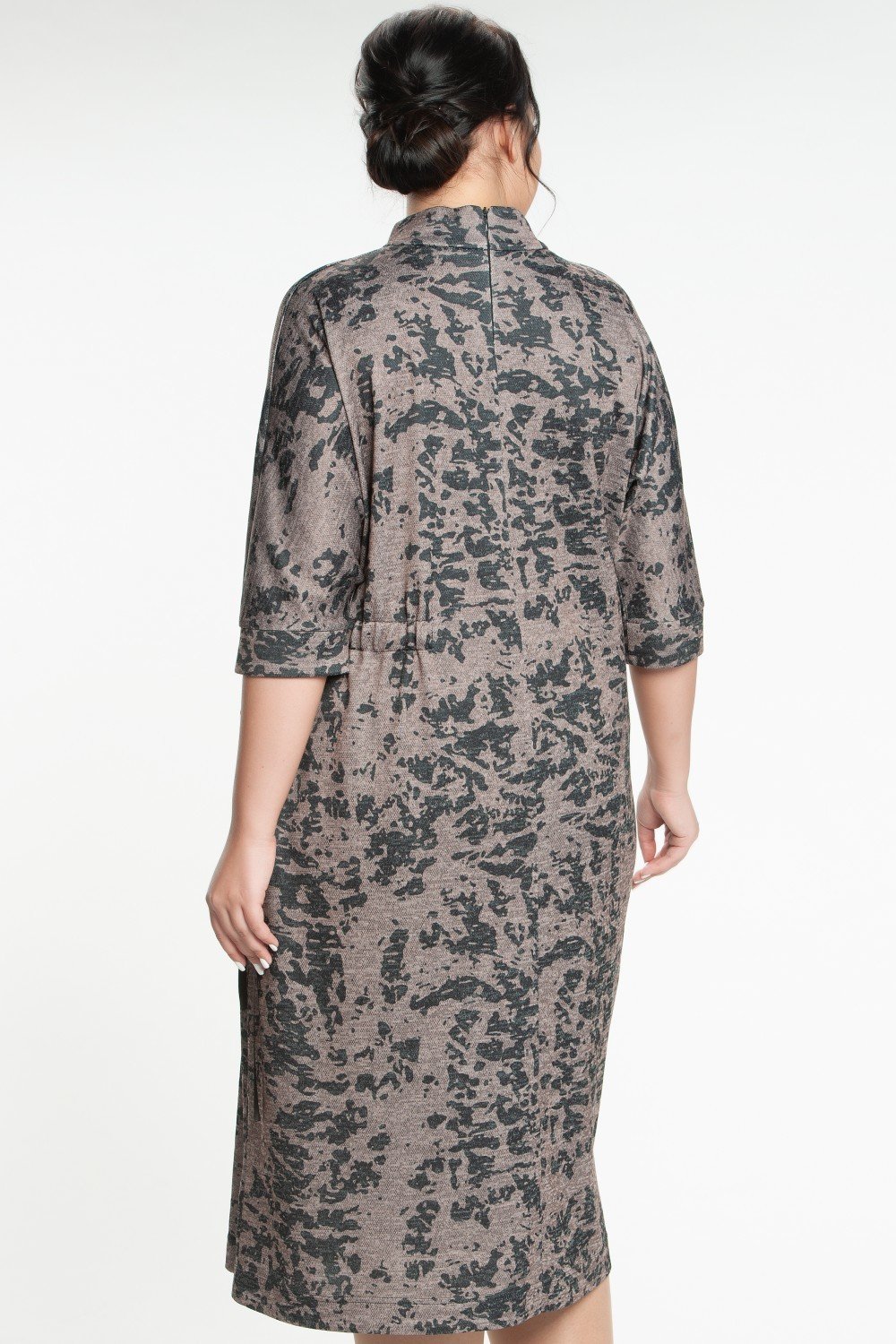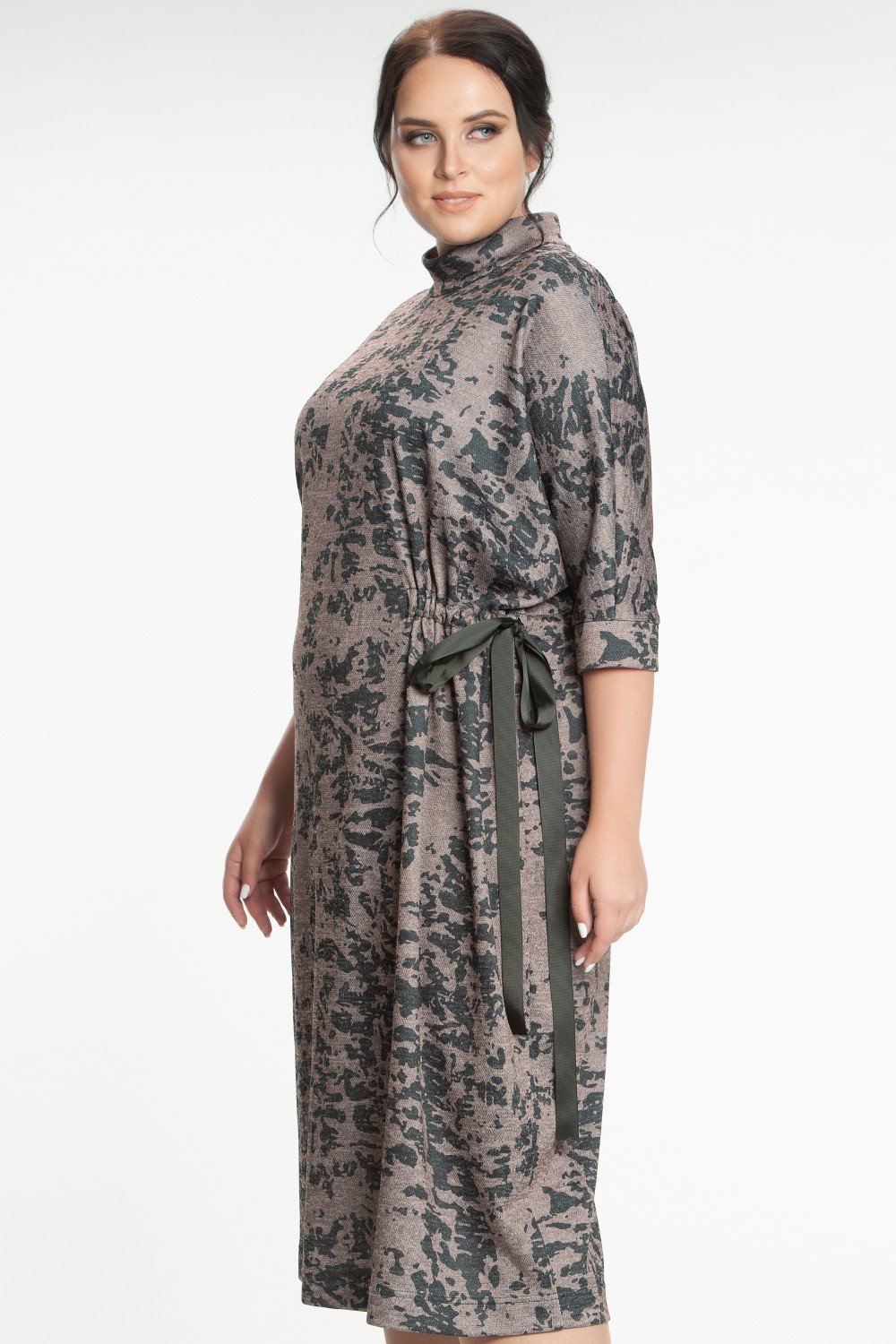 Платье прямого силуэта, с кулисой по талии. В кулису продета репсовая лента. Рукав цельнокроеный,3/4. Воротник стойка, спинка со средним швом и застежкой на тесьму молния. Трикотажное полотно.
