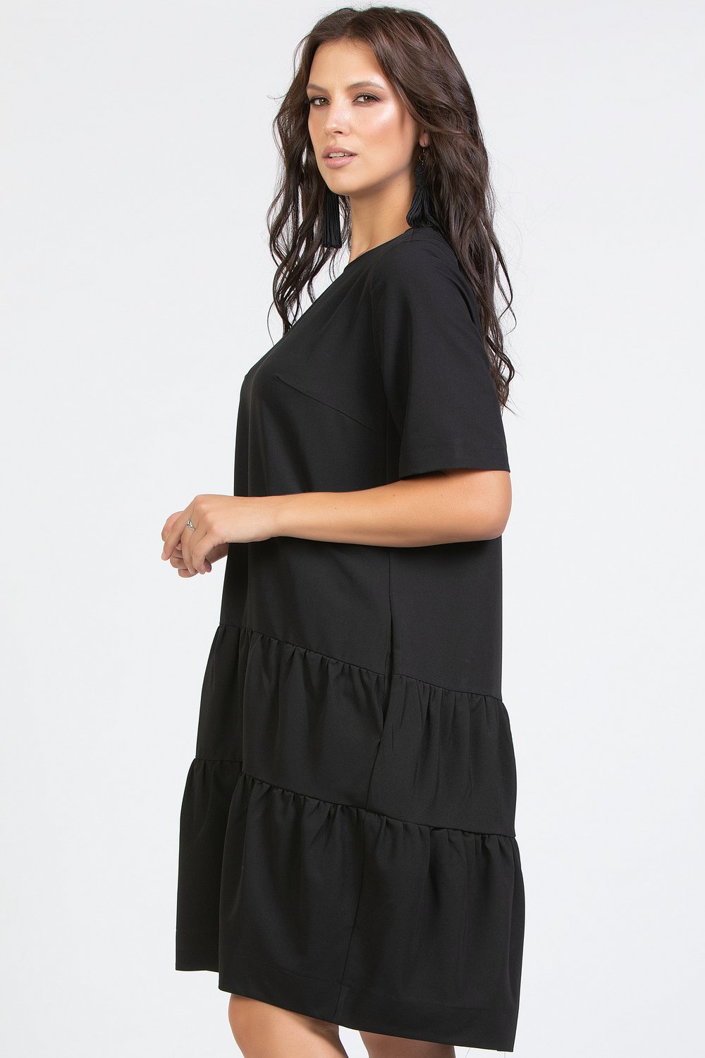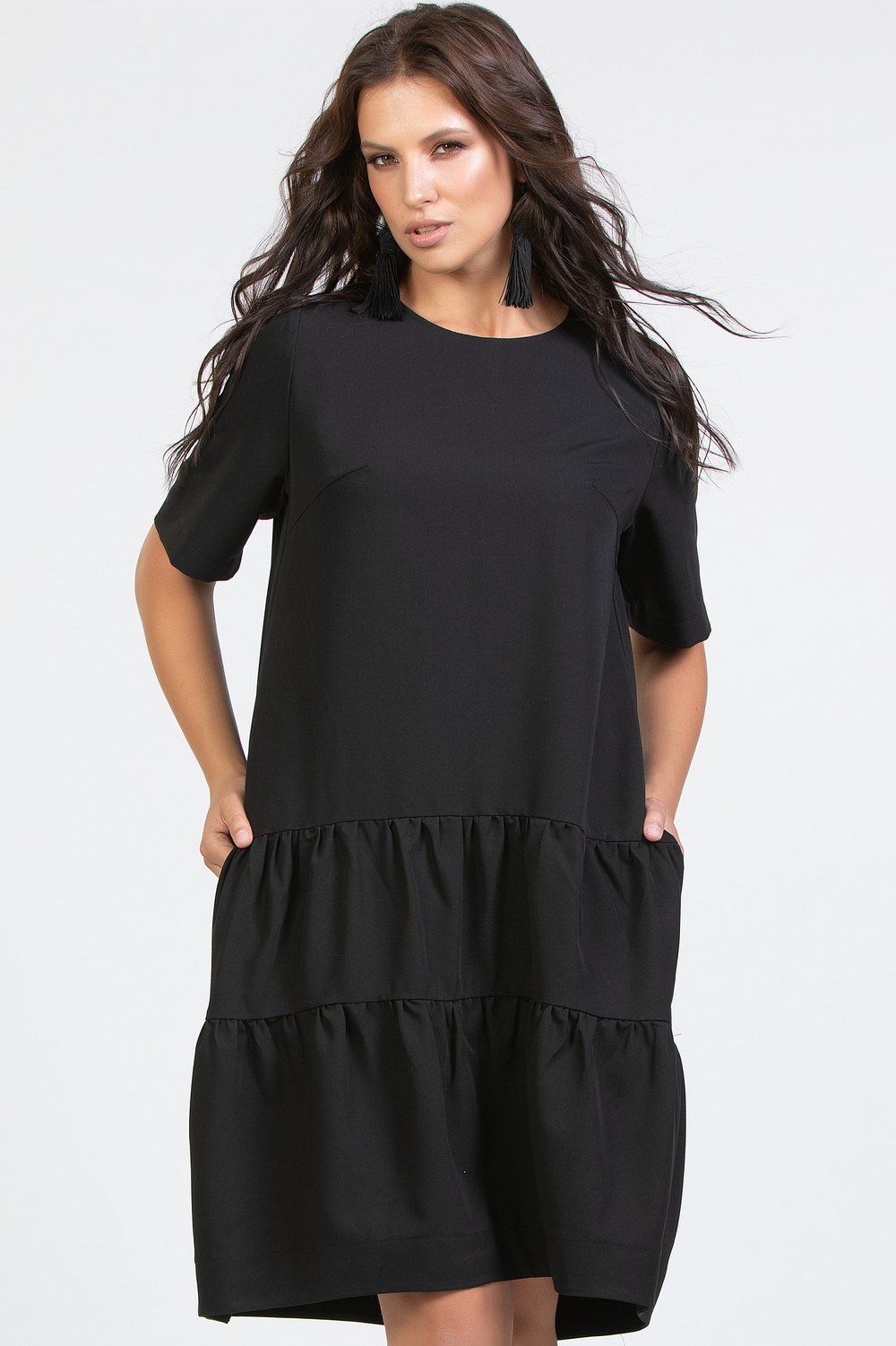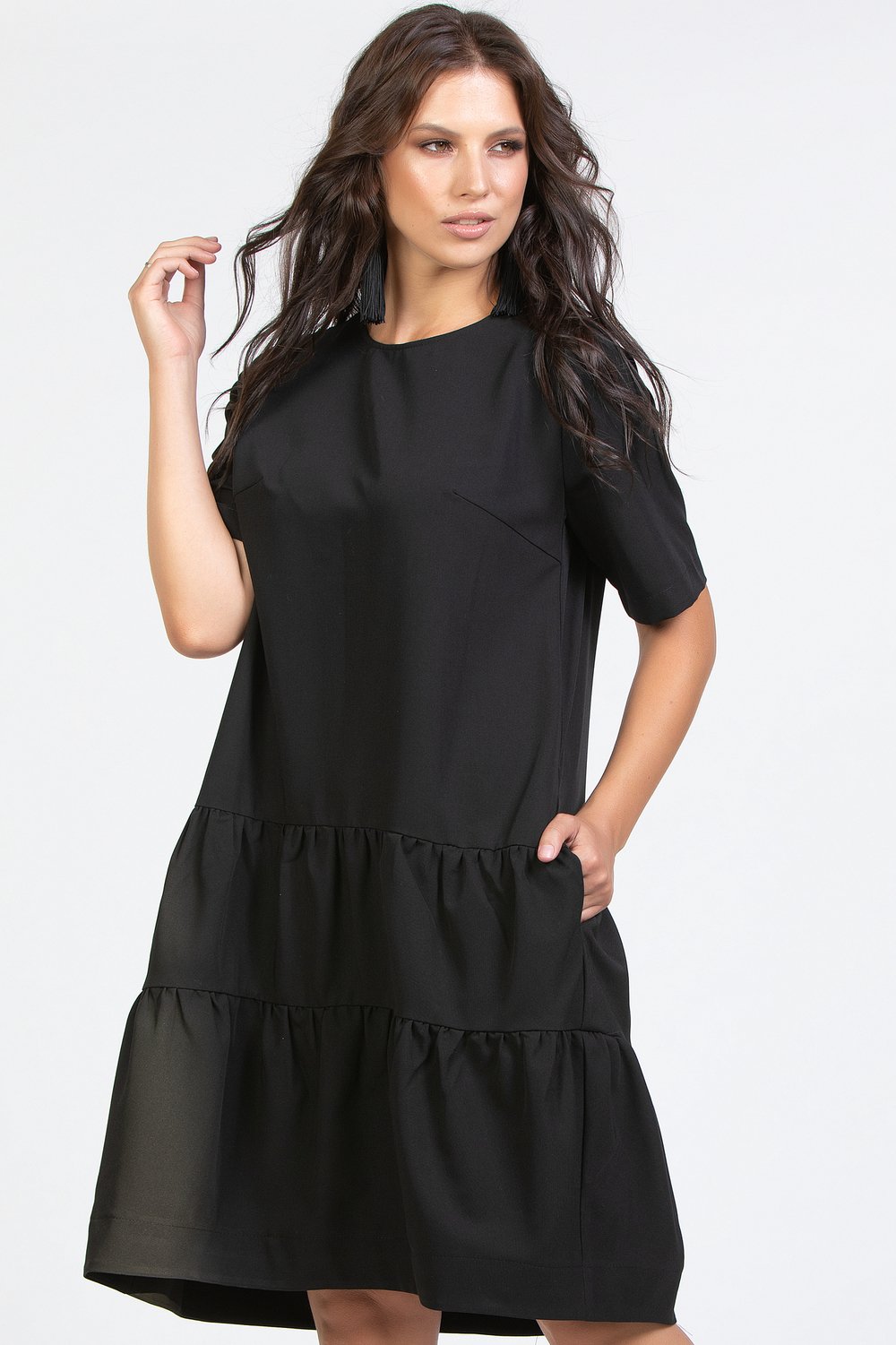 Платье трапециевидного силуэта, отрезное по линии бедер, с карманами в рельефных швах переда. Горловина круглая, рукав втачной, короткий. Спинка с застежкой в среднем шве на длинную тесьму молнию. Нижняя часть переда и спинки с воланами в два ряда, собранными в сборку. Низ платья на обтачке. Черная плательная ткань.Характеристики: