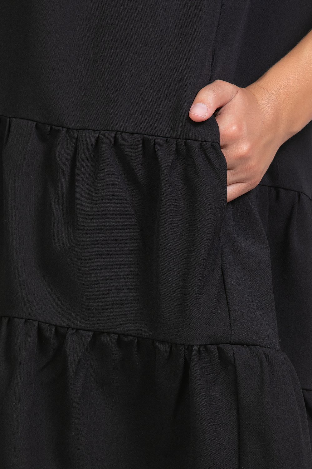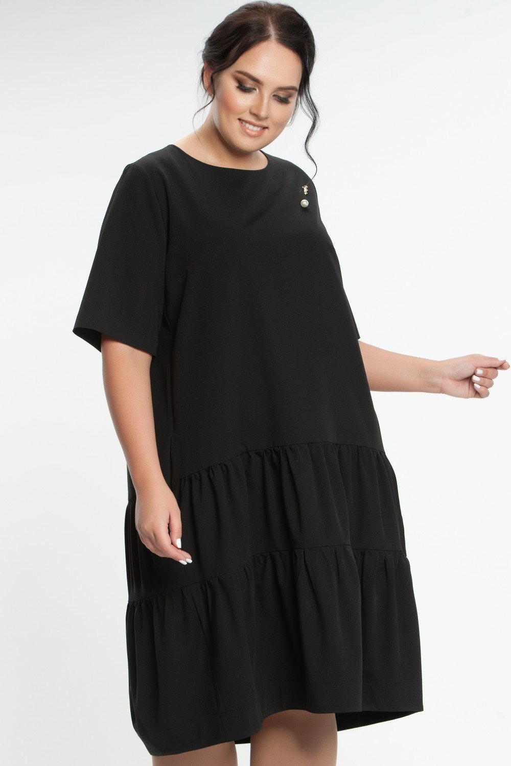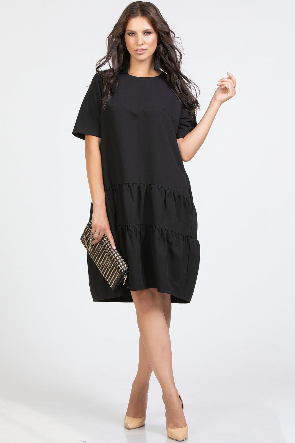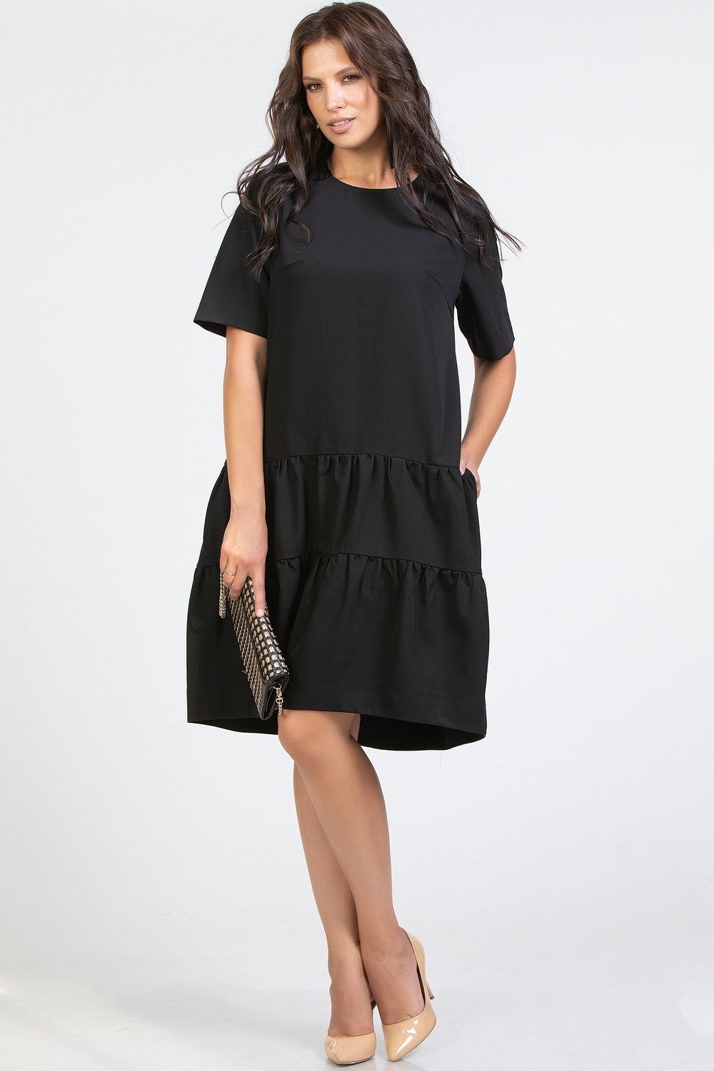 Платье трапециевидного силуэта, отрезное по линии бедер, с карманами в рельефных швах переда. Горловина круглая, рукав втачной, короткий. Спинка с застежкой в среднем шве на длинную тесьму молнию. Нижняя часть переда и спинки с воланами в два ряда, собранными в сборку. Низ платья на обтачке. Черная плательная ткань.Характеристики: