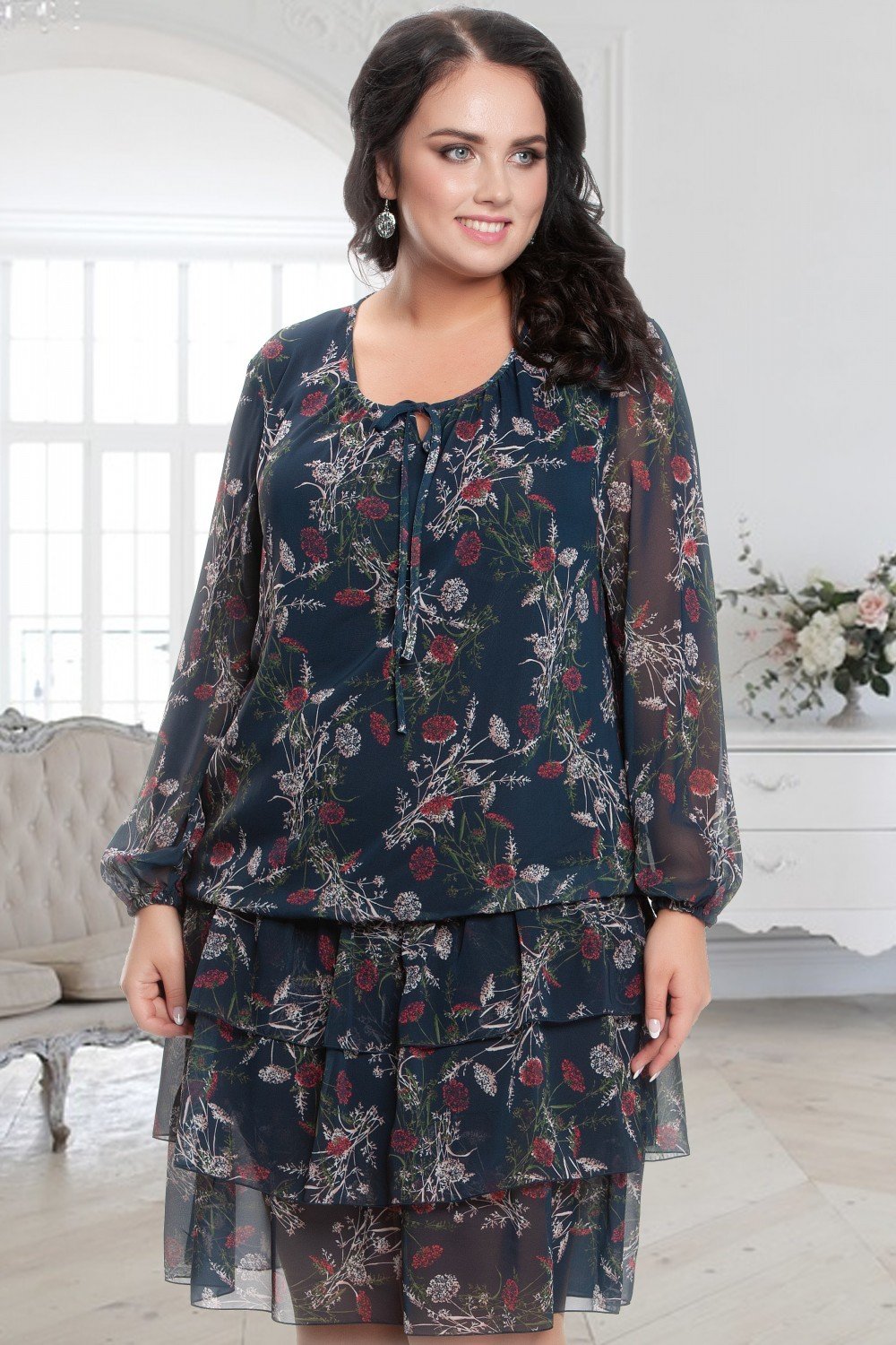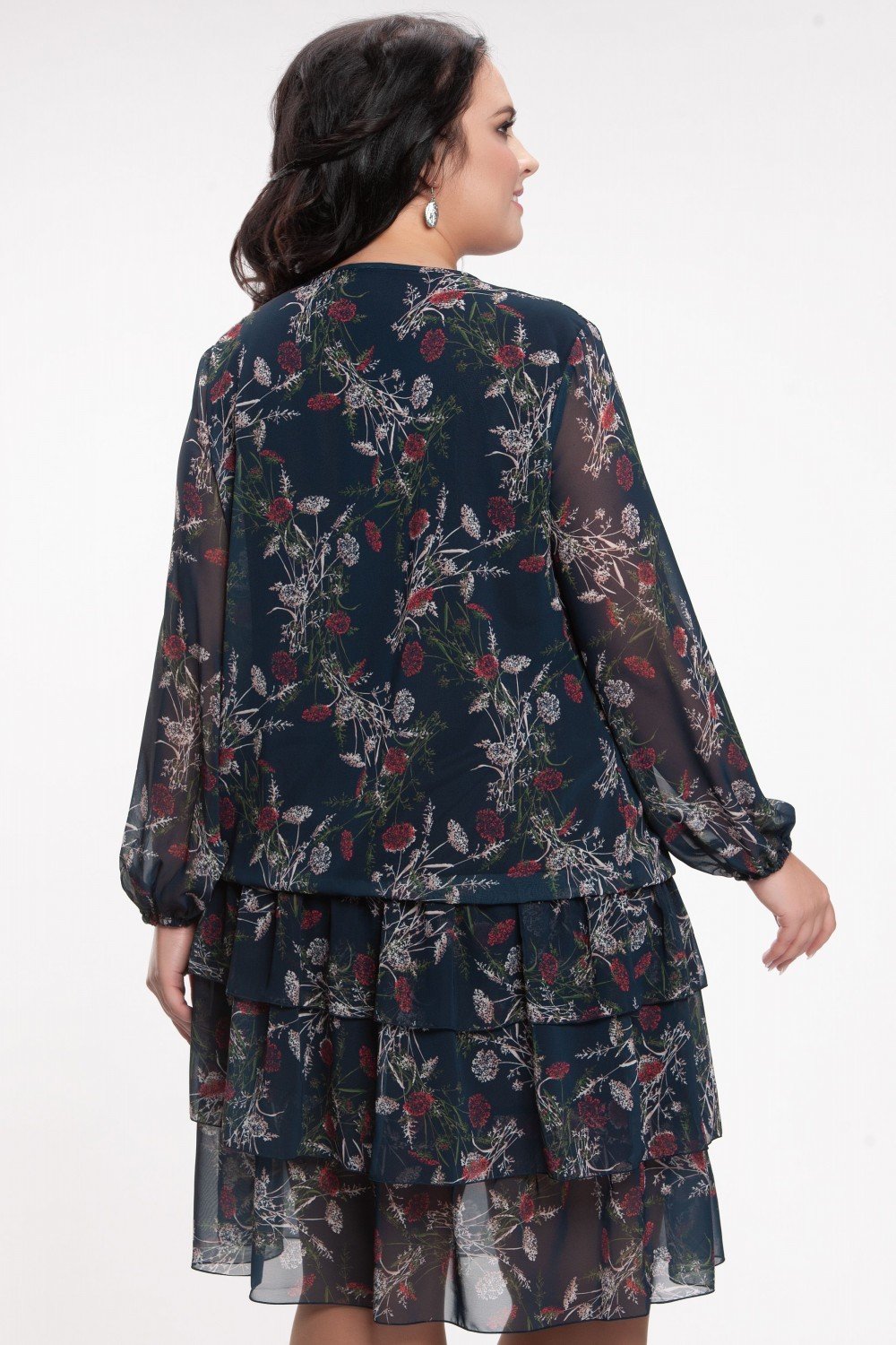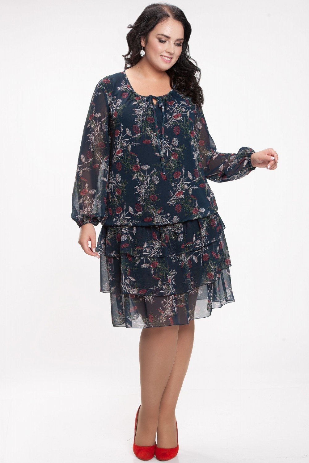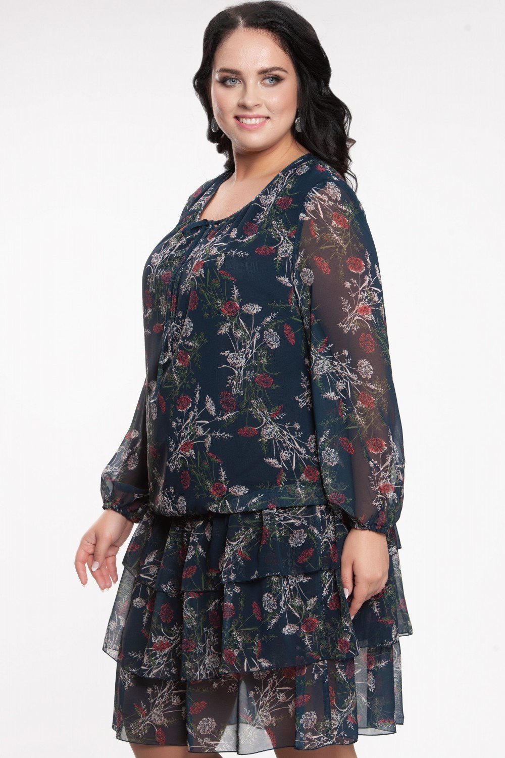 Нарядное платье из набивного шифона на темно-синей основе. Длинный рукав расширен к низу и собран на тоненькую резину, трехъярусная юбка, заниженная линия талии выделяют эту модель из традиционных силуэтов. Эффектный дизайн платья понравится любой целевой аудитории, так как вносит в образ некую игривость. Горловина оформлена на окантовку и завязывается в бантик. Подкладка из тонкого трикотажного полотна. Платье фиксируется на бедрах тонкой резинкой.Характеристики: