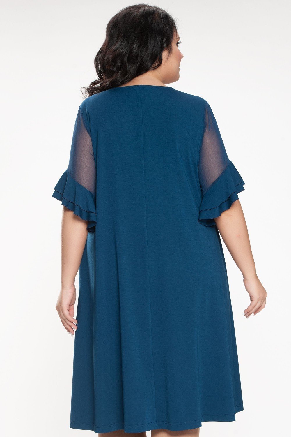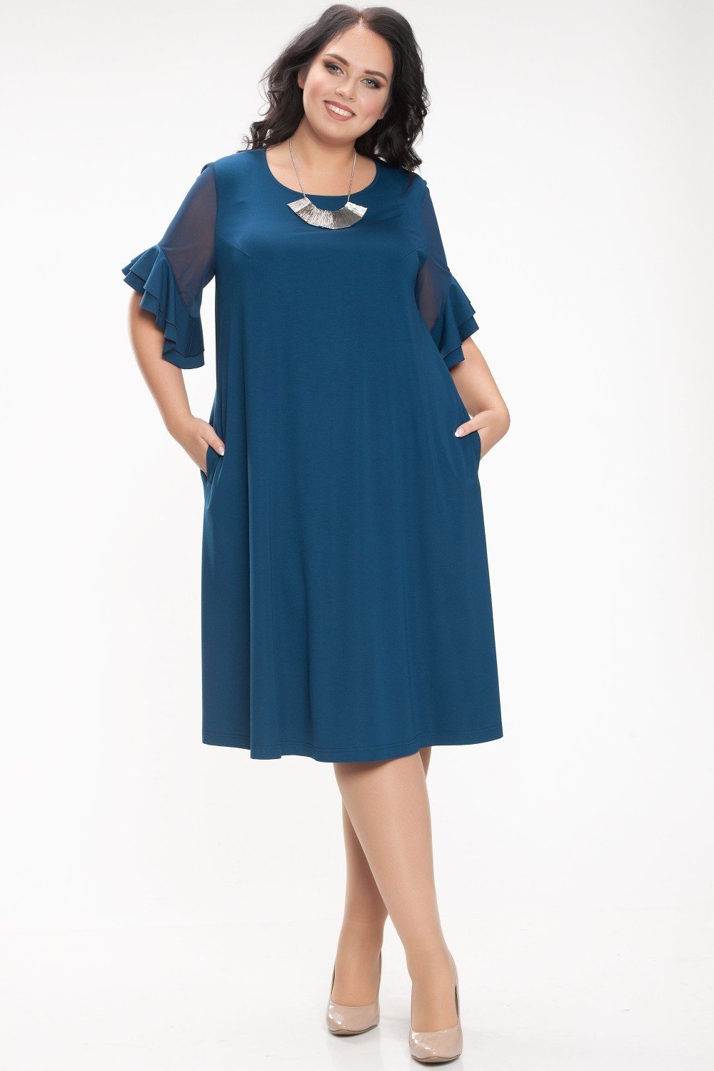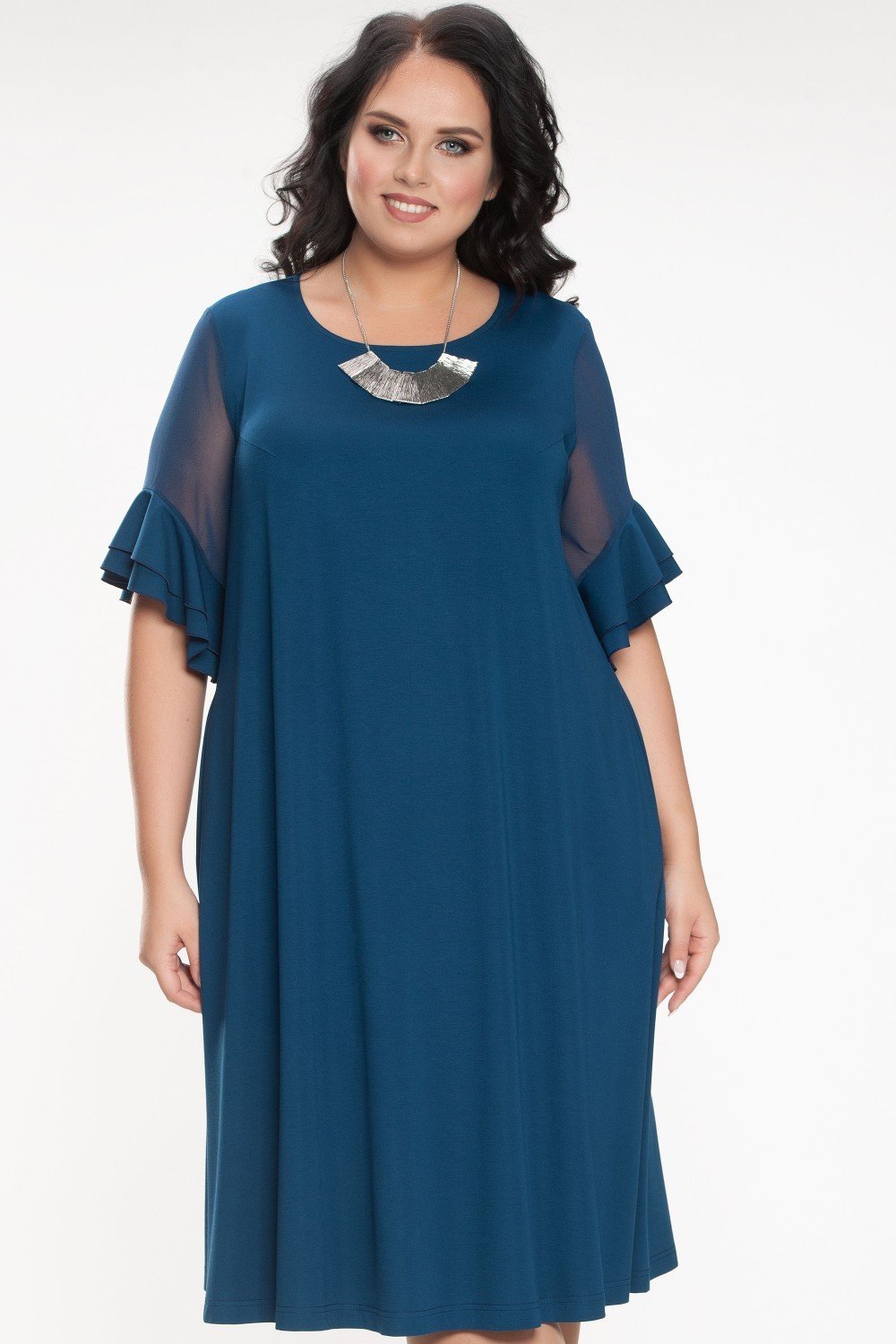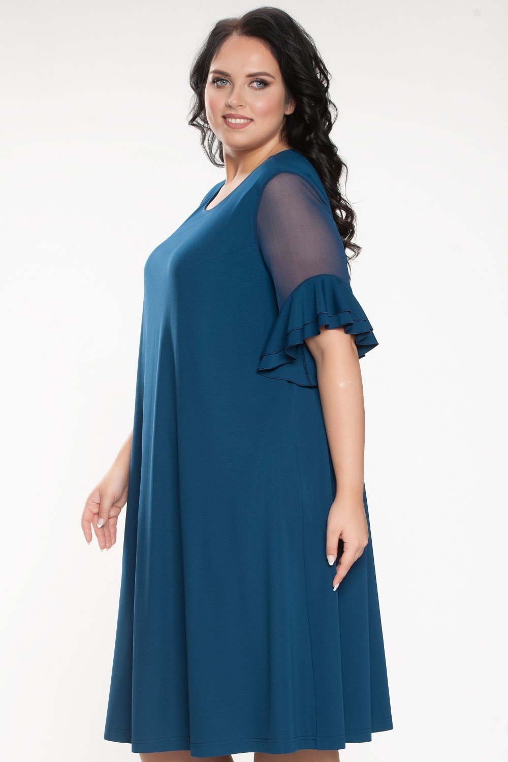 Платье трапециевидного силуэта. Горловина круглая. Рукав втачной, до локтя, по низу с двумя воланами. Вискозное плотное полотно.Характеристики: