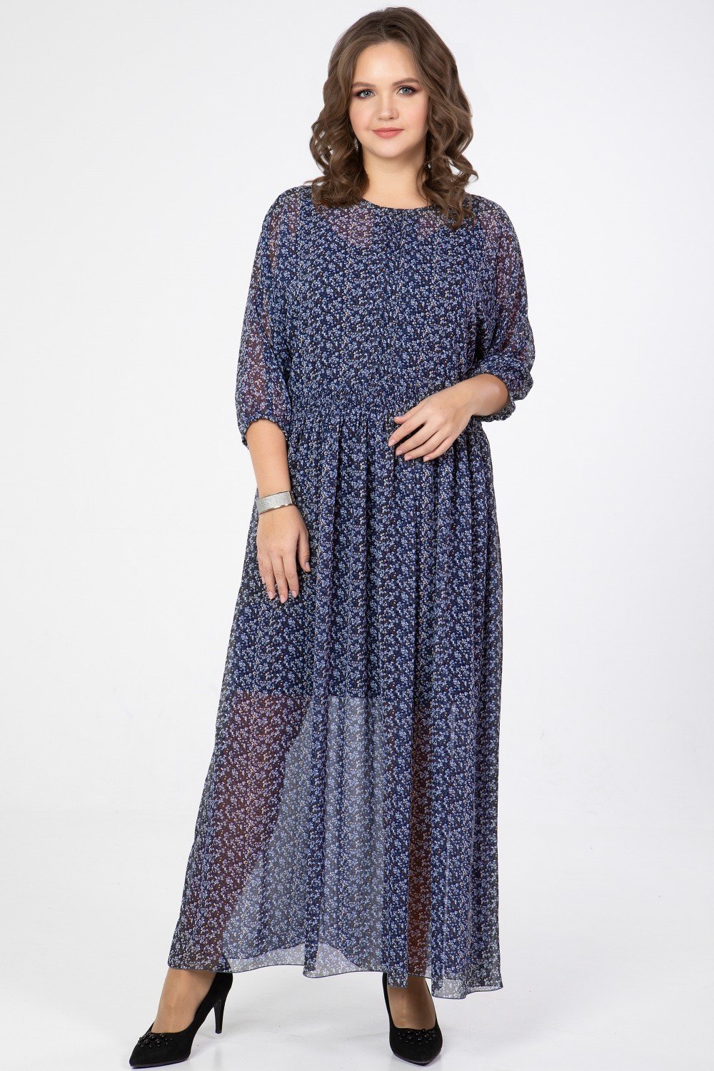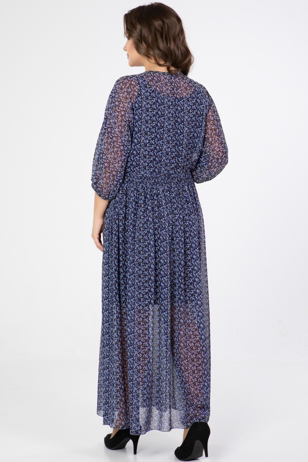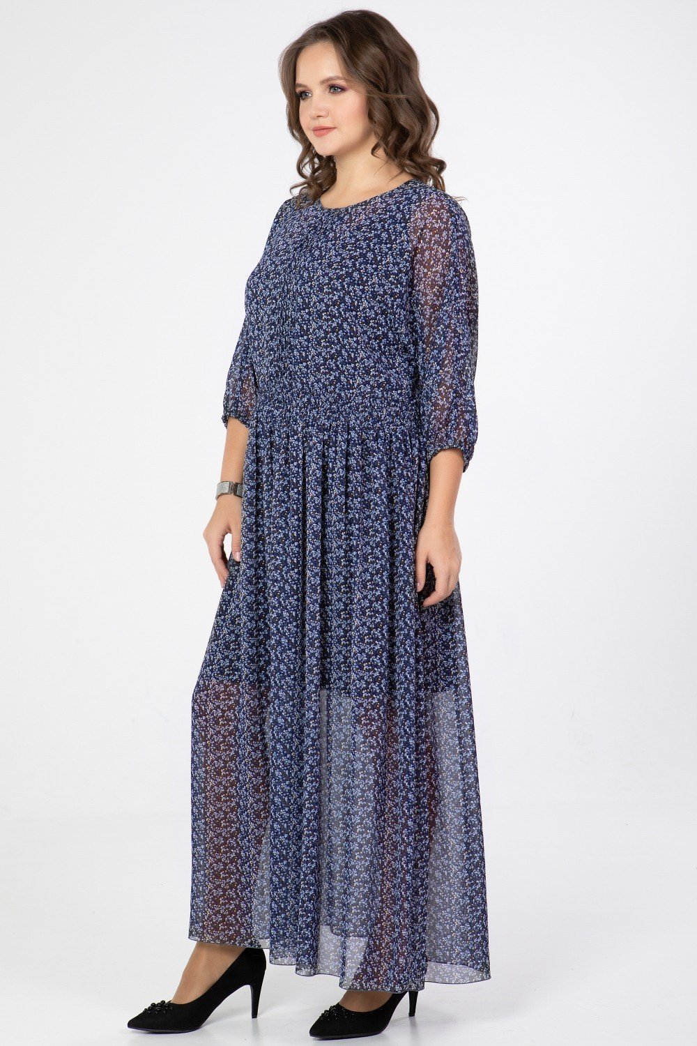 Платье полуприлегающего силуэта, отрезное по линии талии, длинное, с притачным поясом, собранным на шпульную резину в пять рядов с расстоянием в 1,0 см между строчками. Рукав цельнокроеный, по низу собран на эластичную тесьму. Горловина круглая. Перед по центру с планкой из основной ткани, планка с за строчеными складками (глубина складки 0,1 см). К платью прилагается съемный футляр на бретелях из вискозного полотна (95% Вискоза, 5% Лайкра).Характеристики: