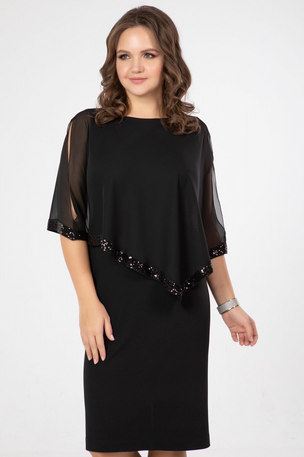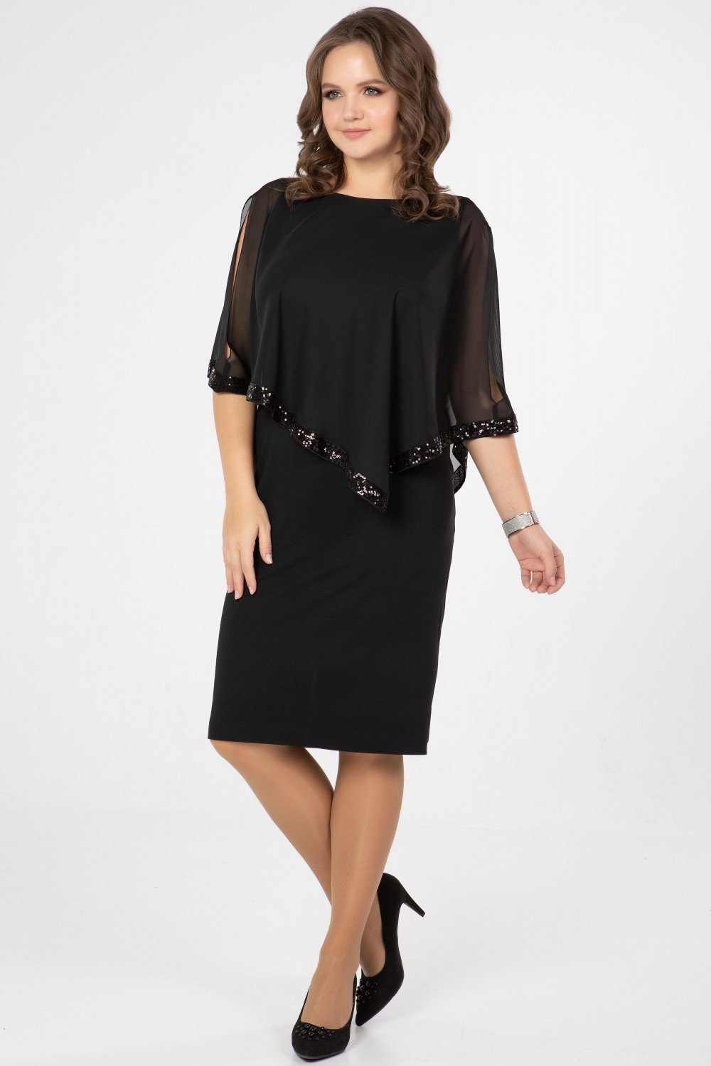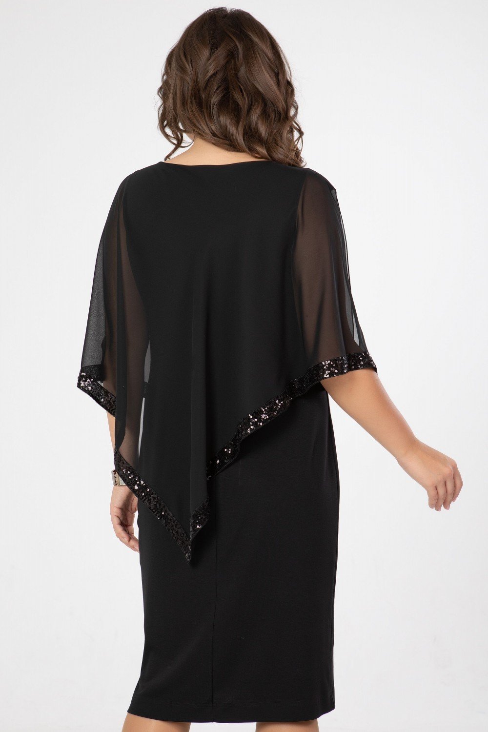 Платье выполнено из двух тканей. Пелерина переда и спинки асимметричная с углом по переду и спинке, с частично стачным плечевым швом вверху и внизу, выполнена из однотонного шифона. По нижнему срезу пелерины настрочена декоративная тесьма с пайеткой шириной 2,5 и 3,0 см. Нижнее платье прилегающего силуэта из однотонного вискозного полотна средней плотности. Горловина круглая.Характеристики: