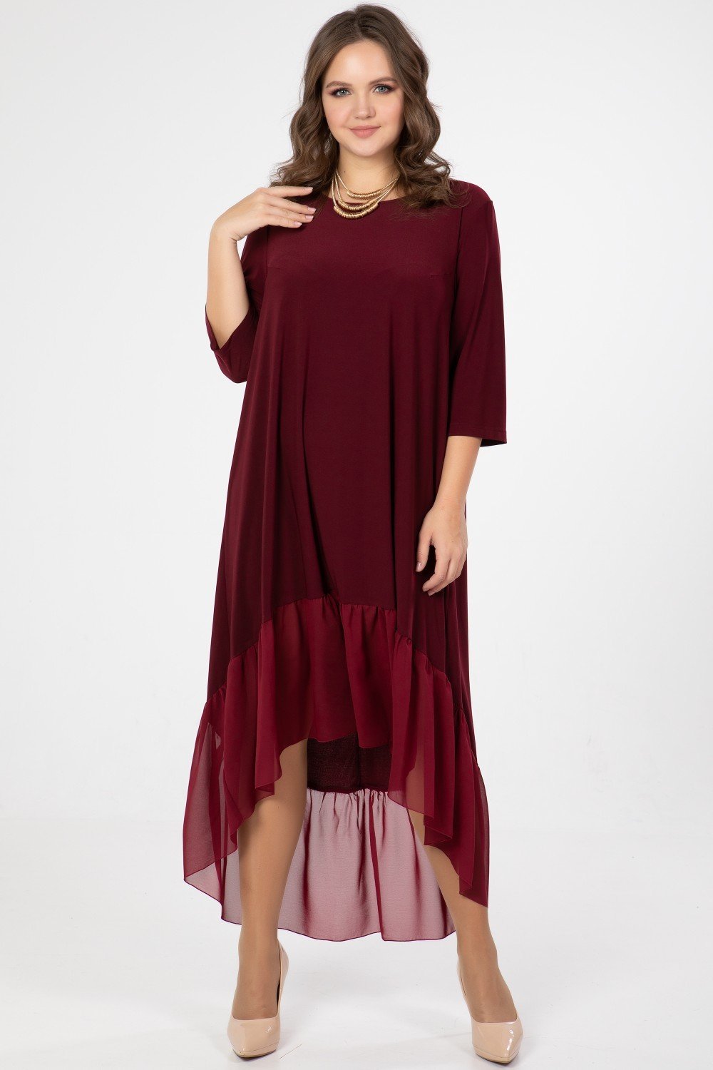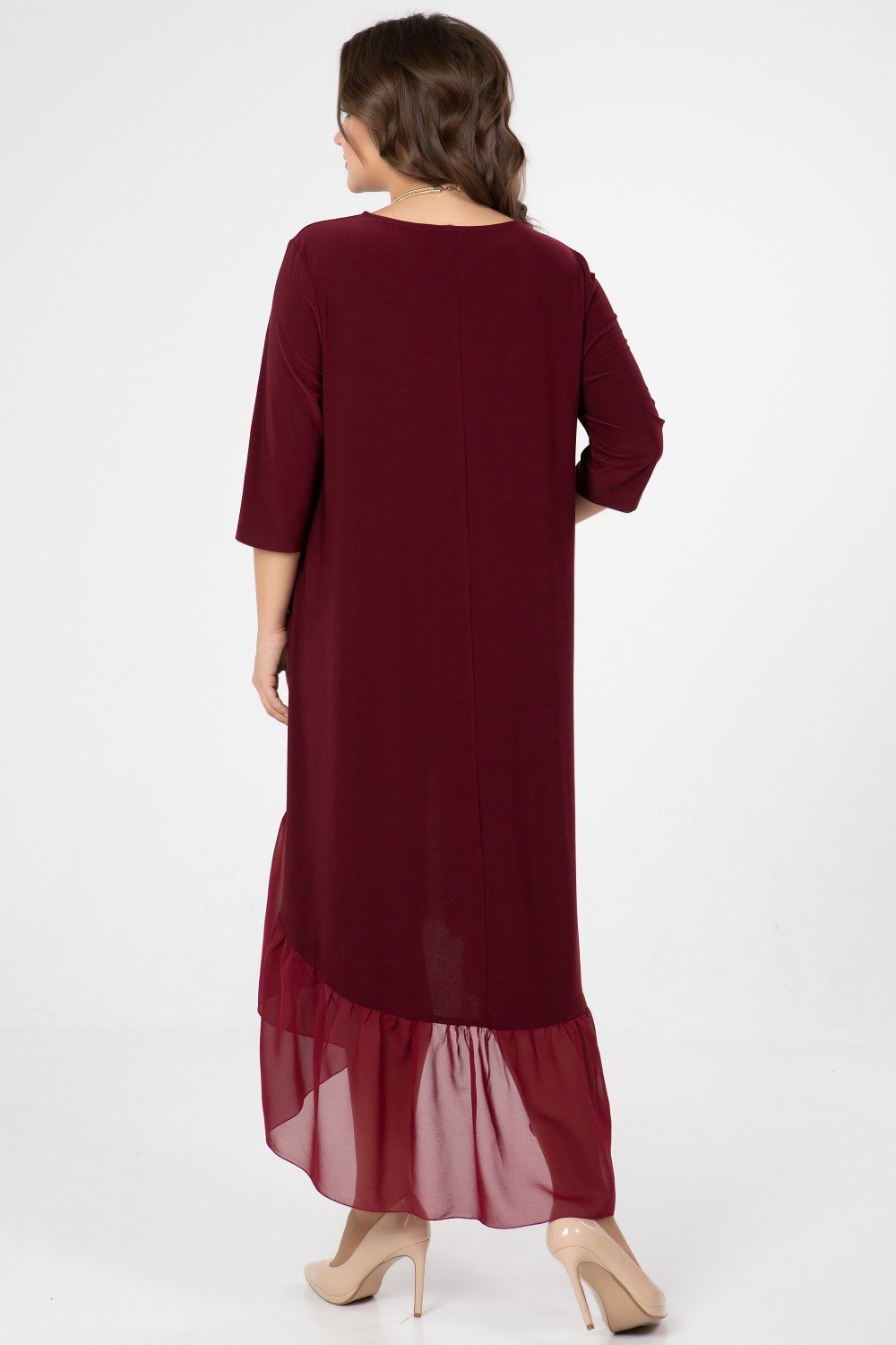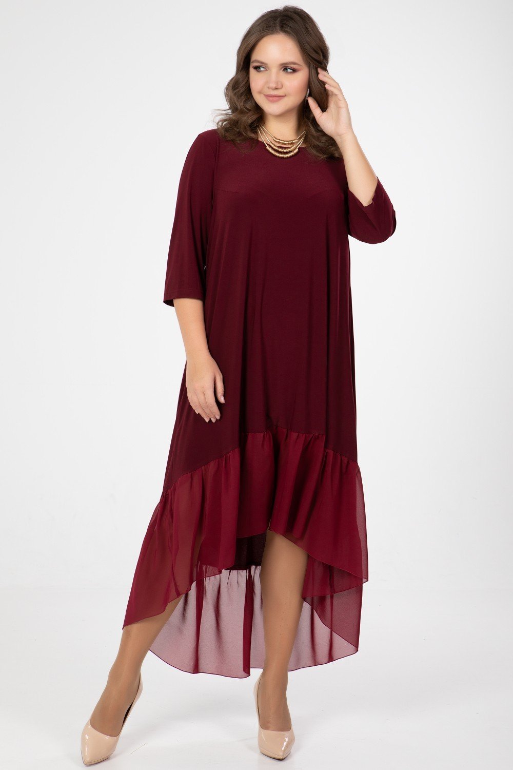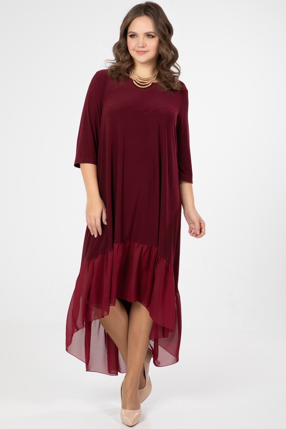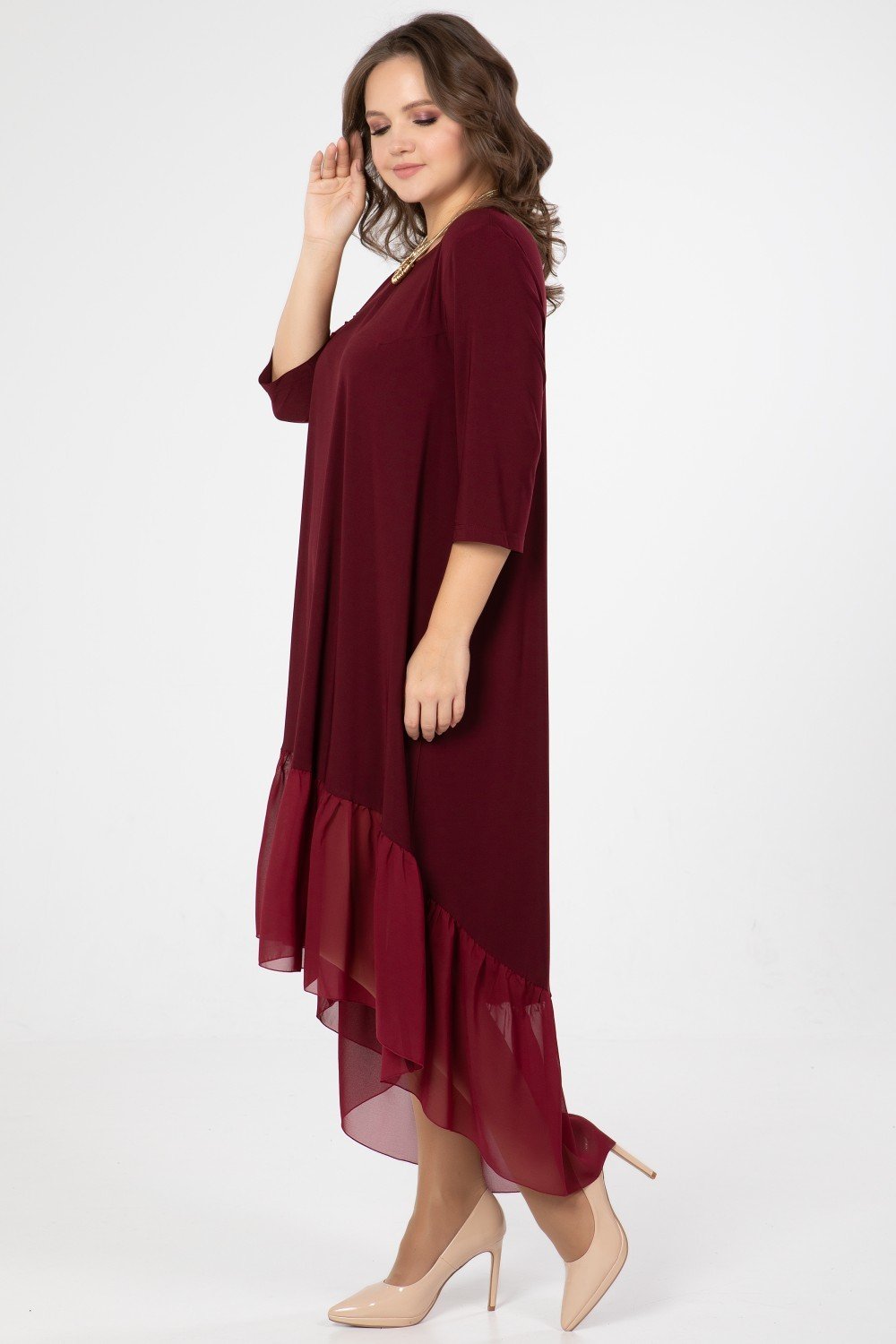 Платье трапециевидного силуэта, разноуровневое. Горловина круглая, рукав втачной, 3/4.По низу платья широкий притачной волан из отделочной ткани (шифон). Волан по шву притачивания собран в сборку. Платье из тонкого трикотажа, "холодок", цвет бордо.Характеристики: