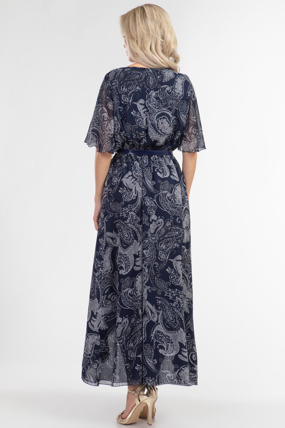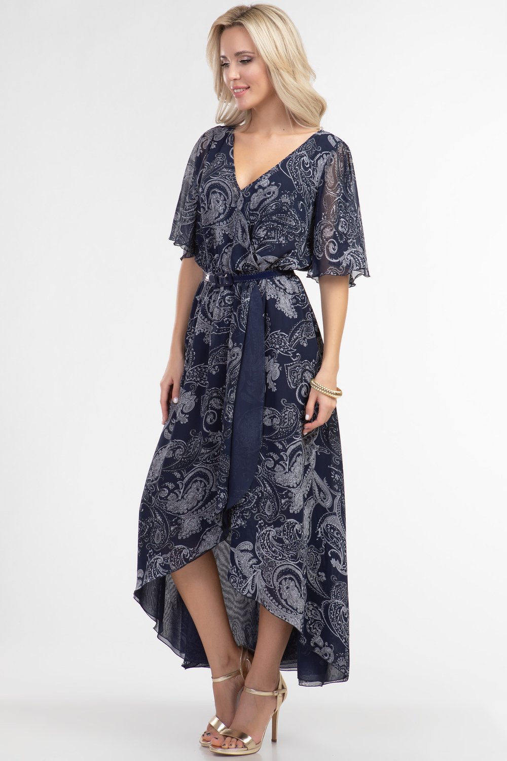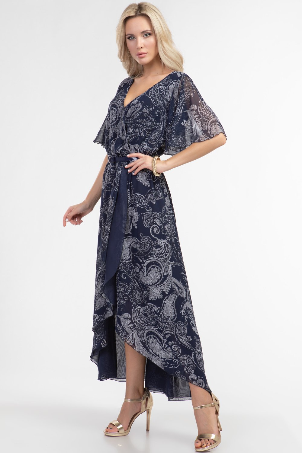 Платье полуприлегающего силуэта, отрезное по линии талии, с запахом в верхней и нижней части переда. Нижняя часть переда с закруглением. Рукав втачной, крылышко. Верхняя и нижняя части переда и спинки на подкладке из однотонного шифона. По припуску шва талии настрочена эластичная тесьма.Характеристики: