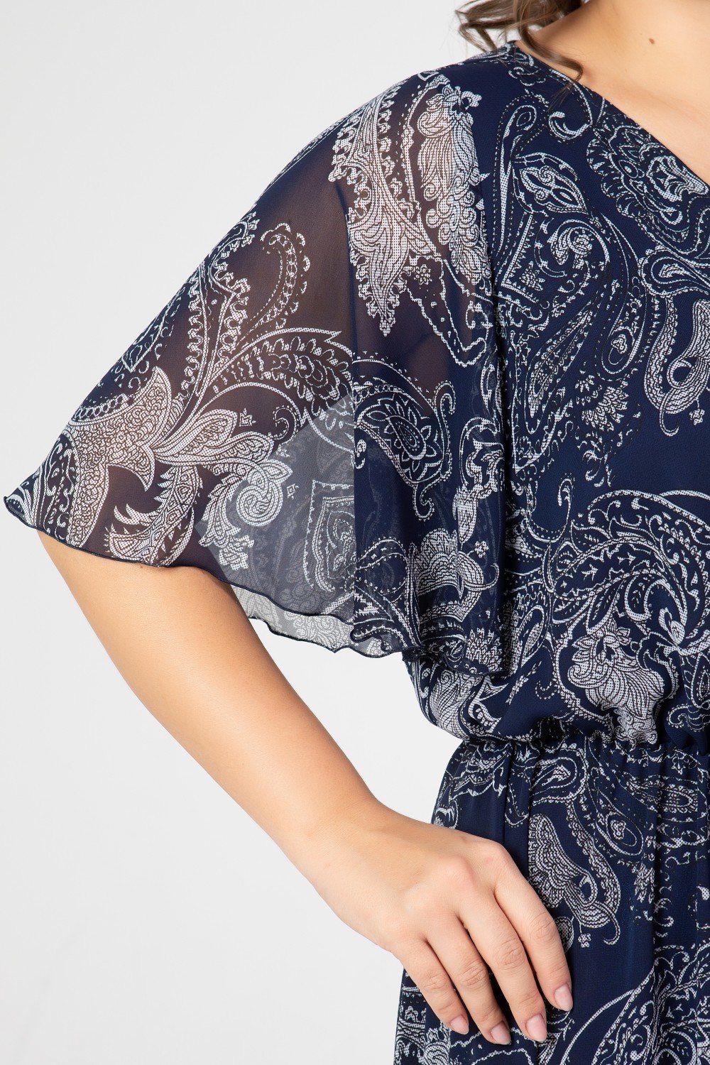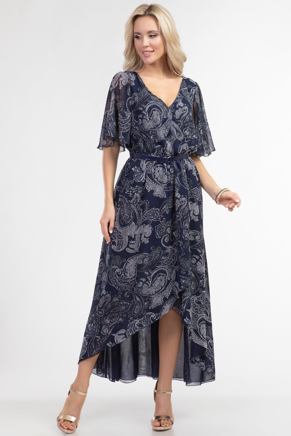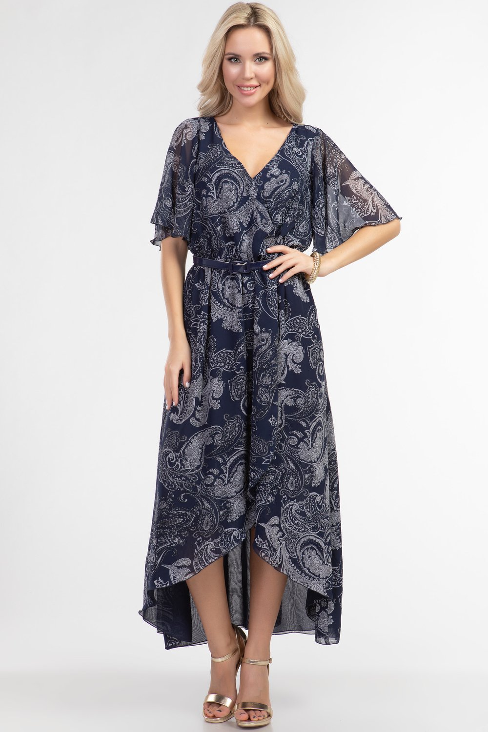 Платье полуприлегающего силуэта, отрезное по линии талии, с запахом в верхней и нижней части переда. Нижняя часть переда с закруглением. Рукав втачной, крылышко. Верхняя и нижняя части переда и спинки на подкладке из однотонного шифона. По припуску шва талии настрочена эластичная тесьма.Характеристики: