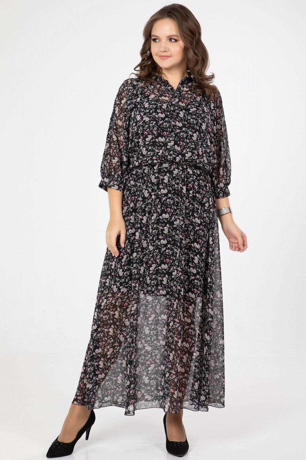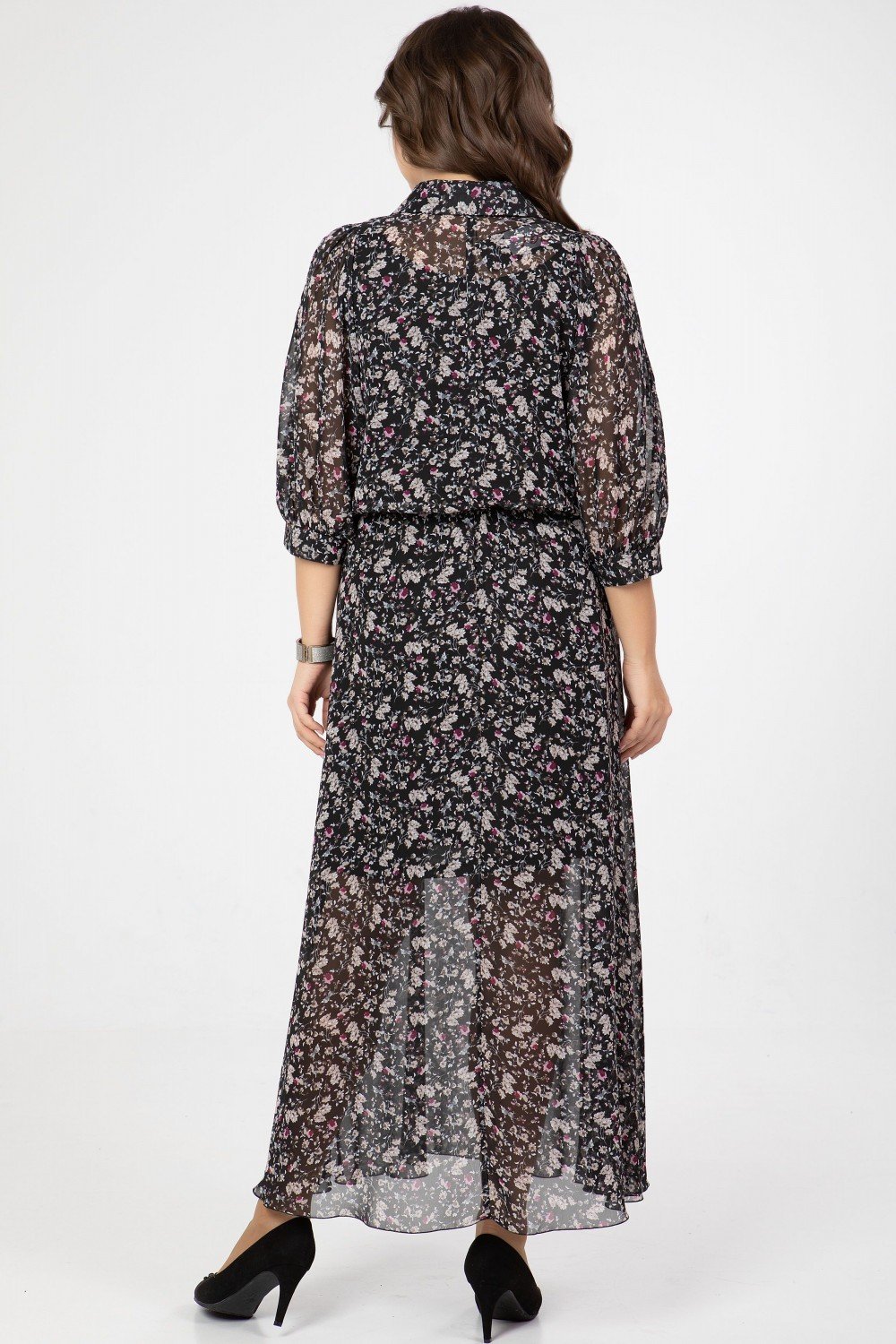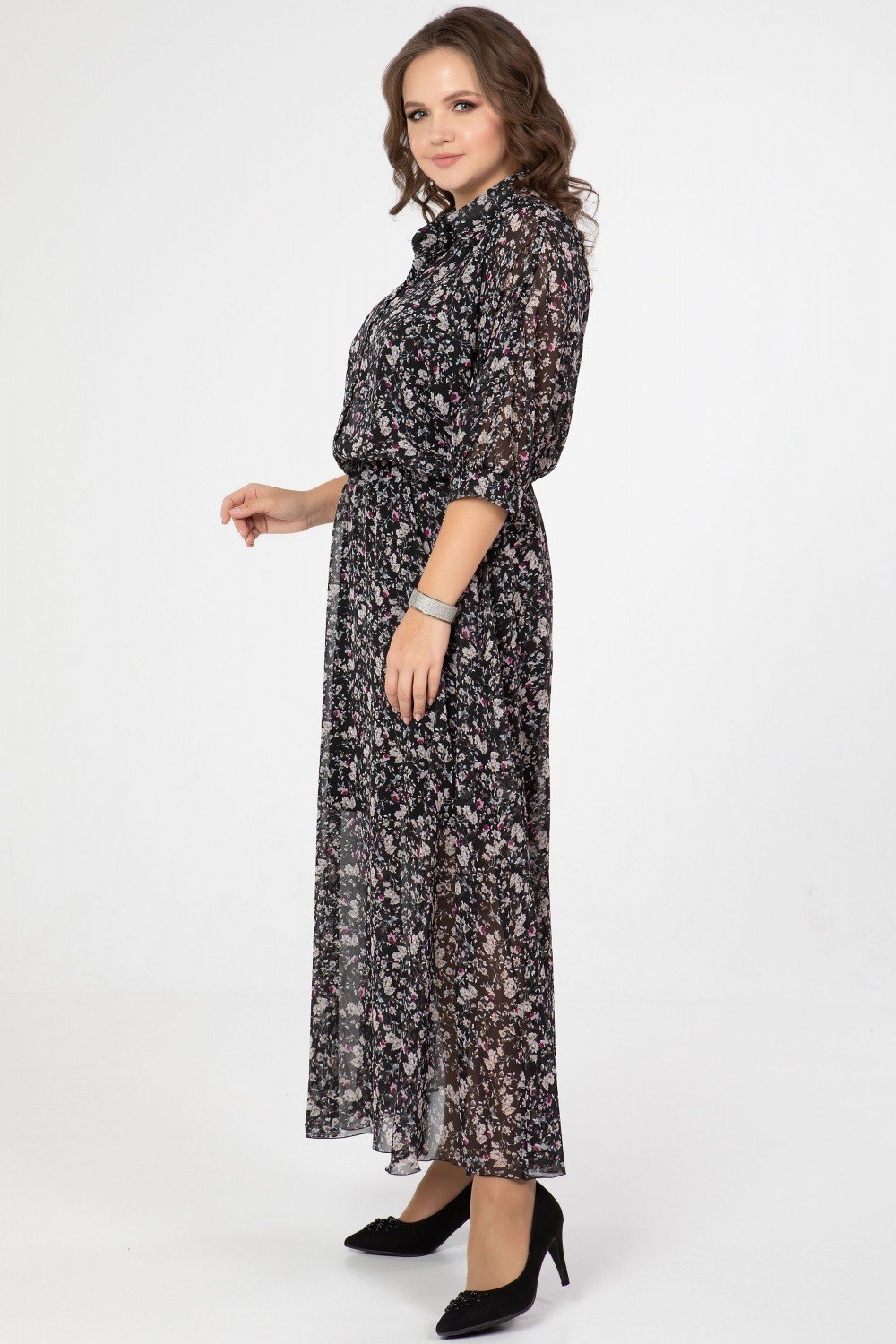 Платье полуприлегающего силуэта, отрезное по линии талии, с цельнокроеным рукавом из мягкого шифона. Верхняя часть переда с центральной застежкой на петли и пуговицы. Нижняя часть переда и спинки - полусолнце. По низу рукава сборка и притачная манжета. Воротник с острыми концами на стойке, застегивающейся на петлю и пуговицу. По шву талии - эластичная тесьма. К платью прилагается футляр на тонких бретелях ( состав сырья 65% Полиэстер, 30% Вискоза, 5% Лайкра ).Характеристики: