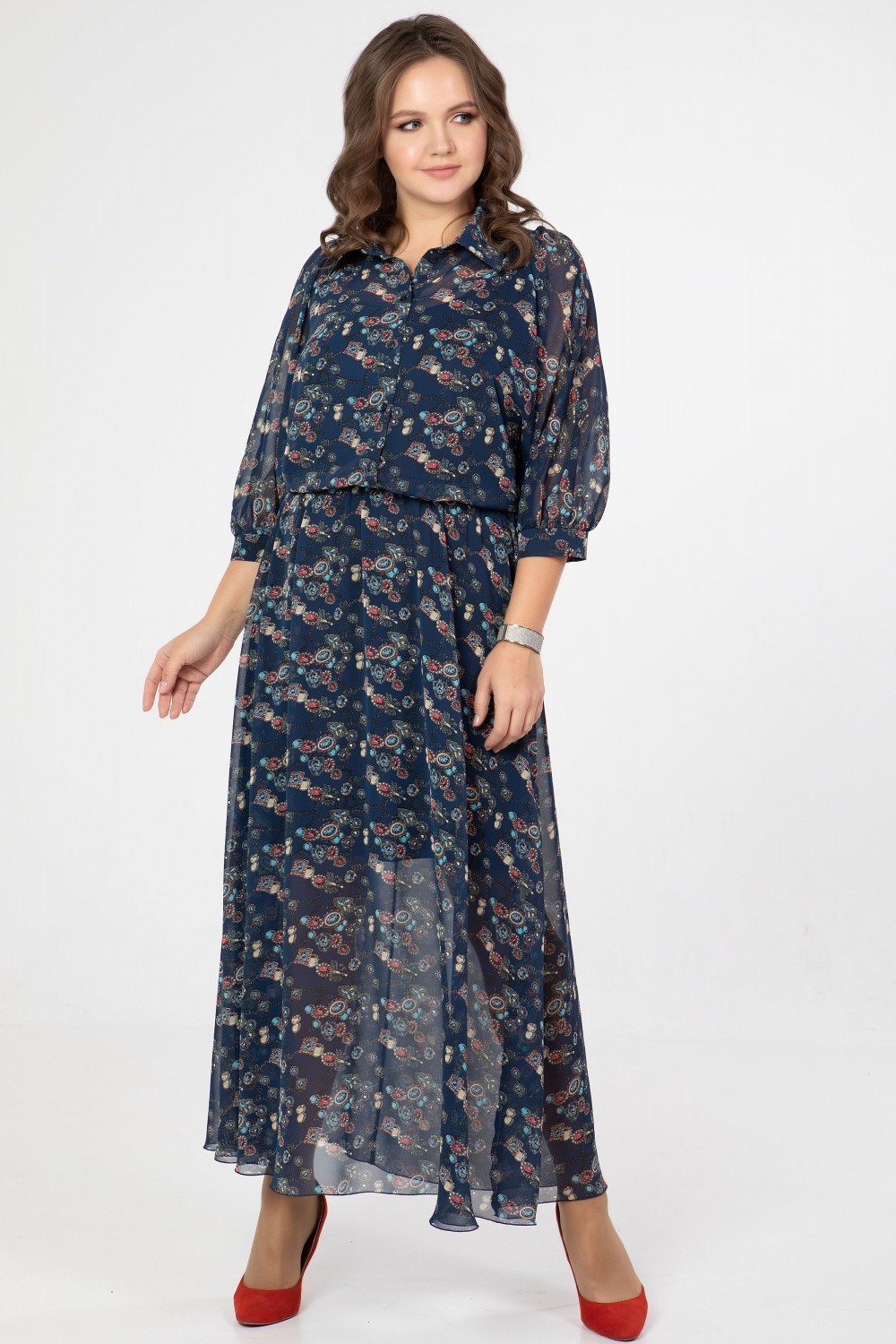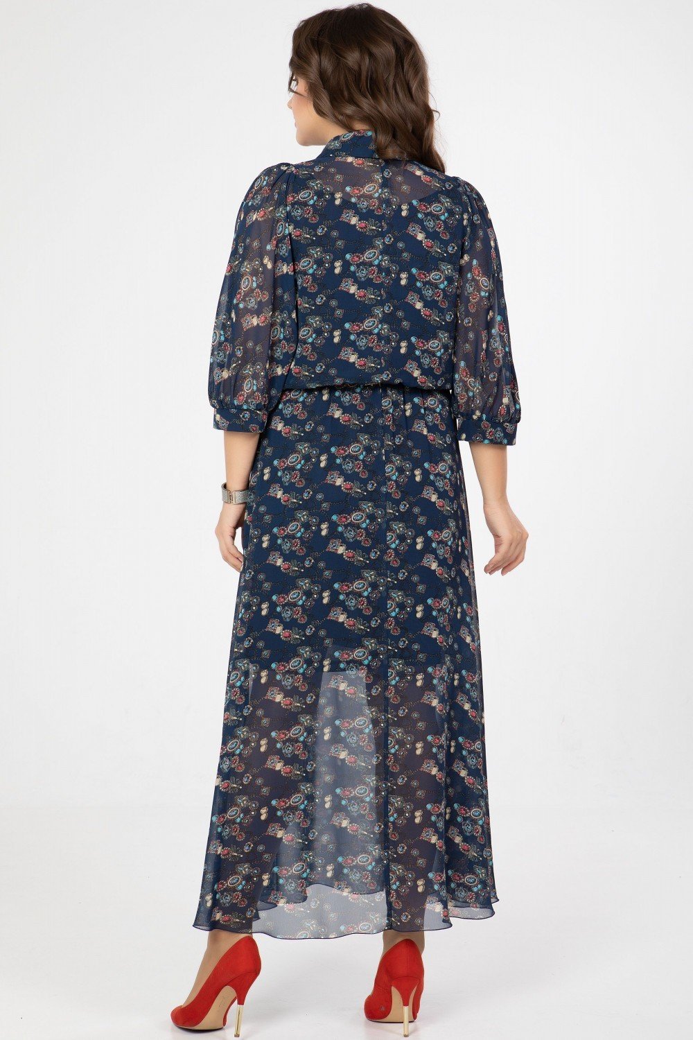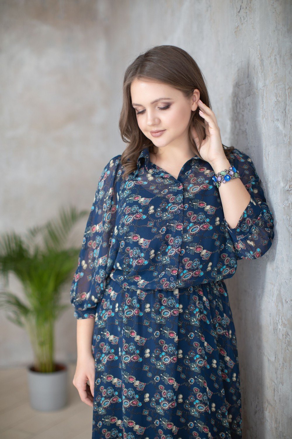 Платье полуприлегающего силуэта, отрезное по линии талии, с цельнокроеным рукавом и нежного шифона. Верхняя часть переда с центральной застежкой на петли и пуговицы. Нижняя часть переда и спинки - полусолнце. По низу рукава сборка и притачная манжета. Воротник с острыми концами на стойке, застегивающейся на петлю и пуговицу. По шву талии - эластичная тесьма. К платью прилагается футляр на тонких бретелях ( состав сырья 65% Полиэстер, 30% Вискоза, 5% Лайкра ).Характеристики: