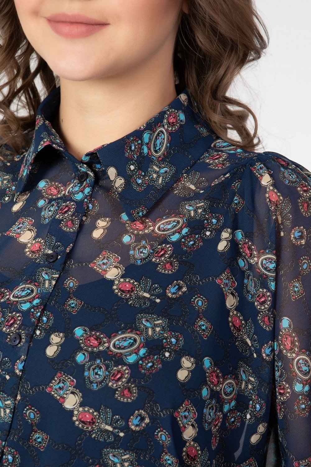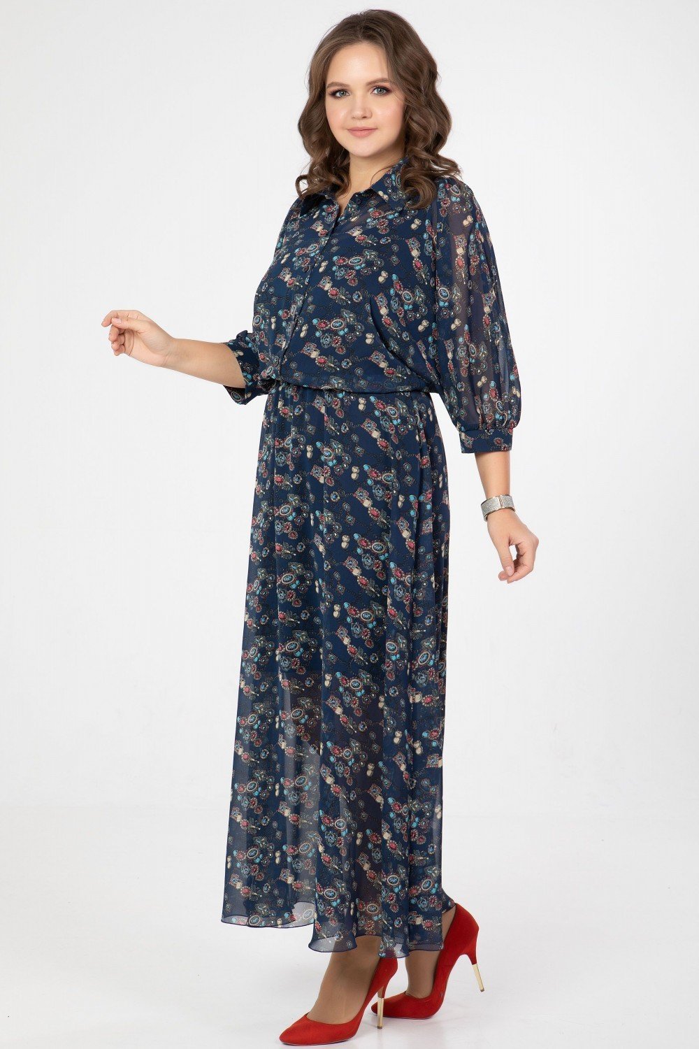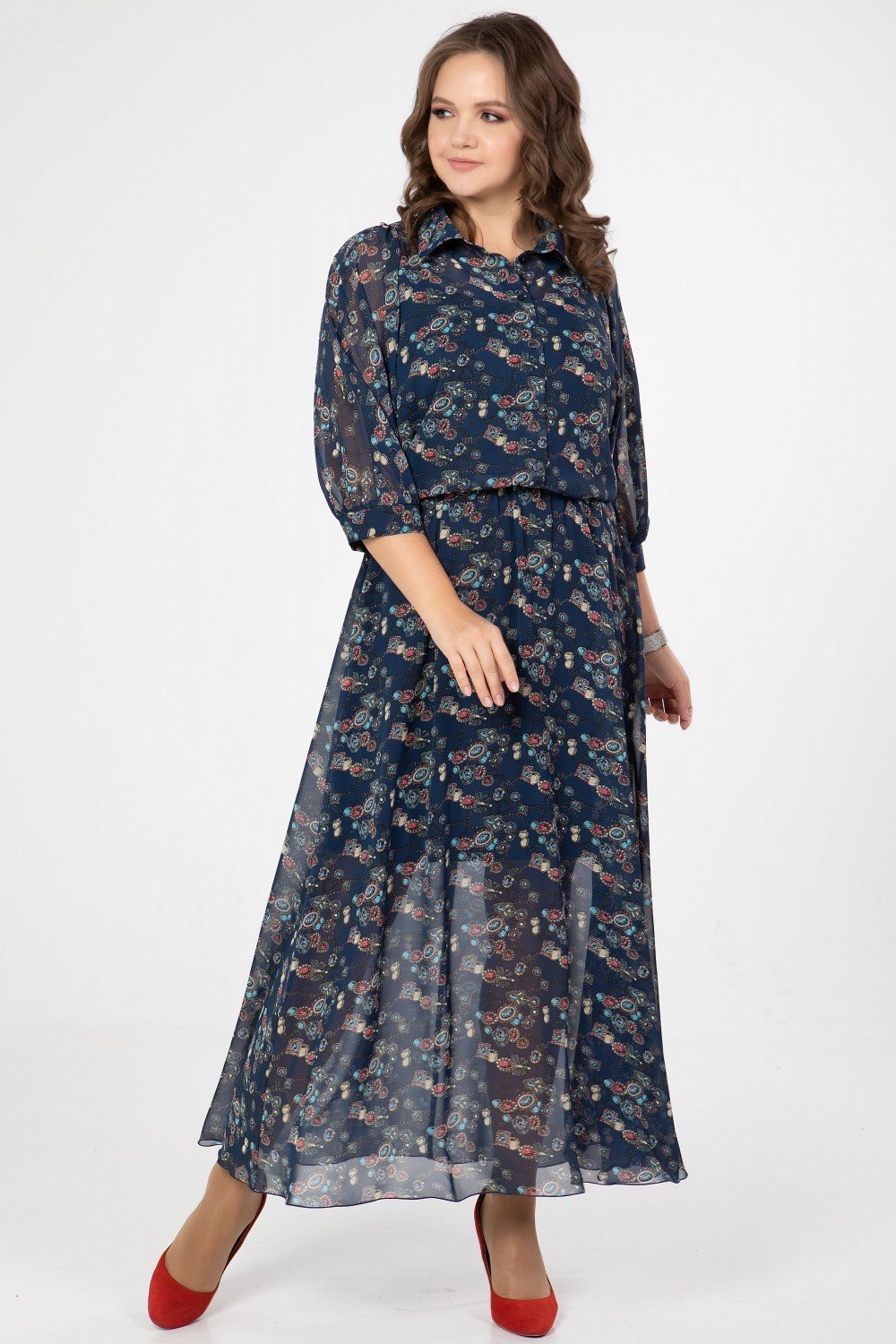 Платье полуприлегающего силуэта, отрезное по линии талии, с цельнокроеным рукавом и нежного шифона. Верхняя часть переда с центральной застежкой на петли и пуговицы. Нижняя часть переда и спинки - полусолнце. По низу рукава сборка и притачная манжета. Воротник с острыми концами на стойке, застегивающейся на петлю и пуговицу. По шву талии - эластичная тесьма. К платью прилагается футляр на тонких бретелях ( состав сырья 65% Полиэстер, 30% Вискоза, 5% Лайкра ).Характеристики: