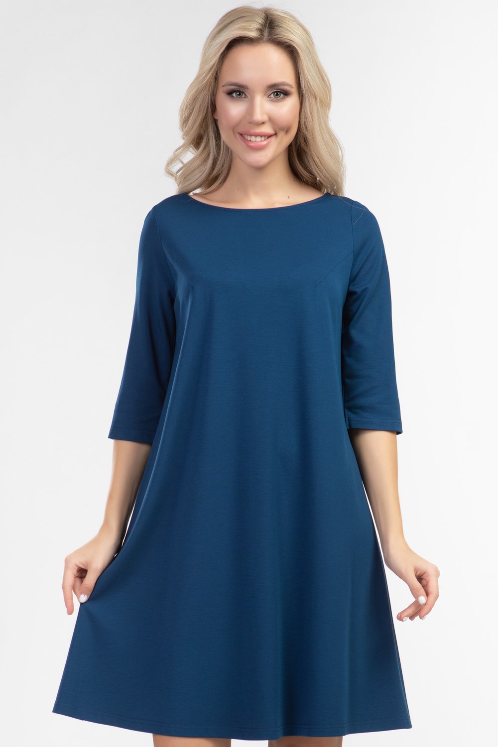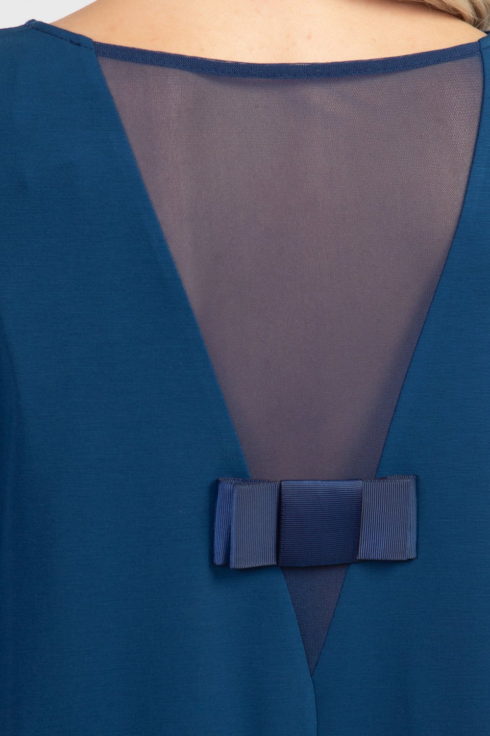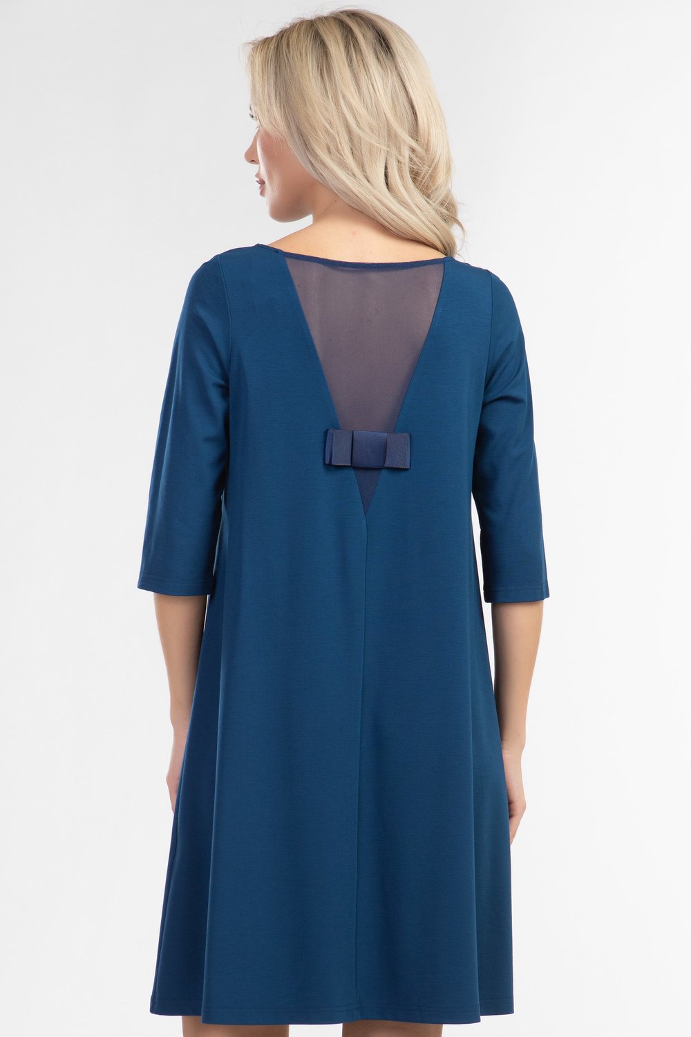 Платье А-образного силуэта из однотонного трикотажного полотна глубокого синего цвета, с большим содержанием вискозы со вставкой из сетки, в виде треугольника, и декоративного бантика по спинке! Круглая горловина, рукав 3/4, без застежки и подклада. Удобное и практичное платье - прекрасный наряд для торжественного случая. Уместно добавить по желанию аксессуар.Характеристики: