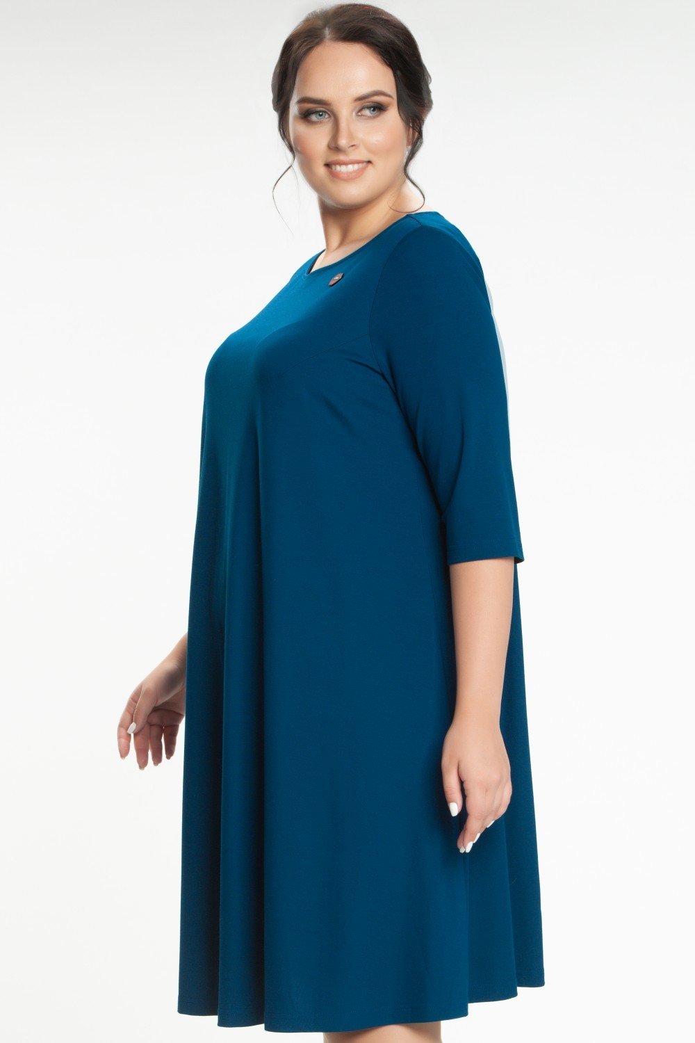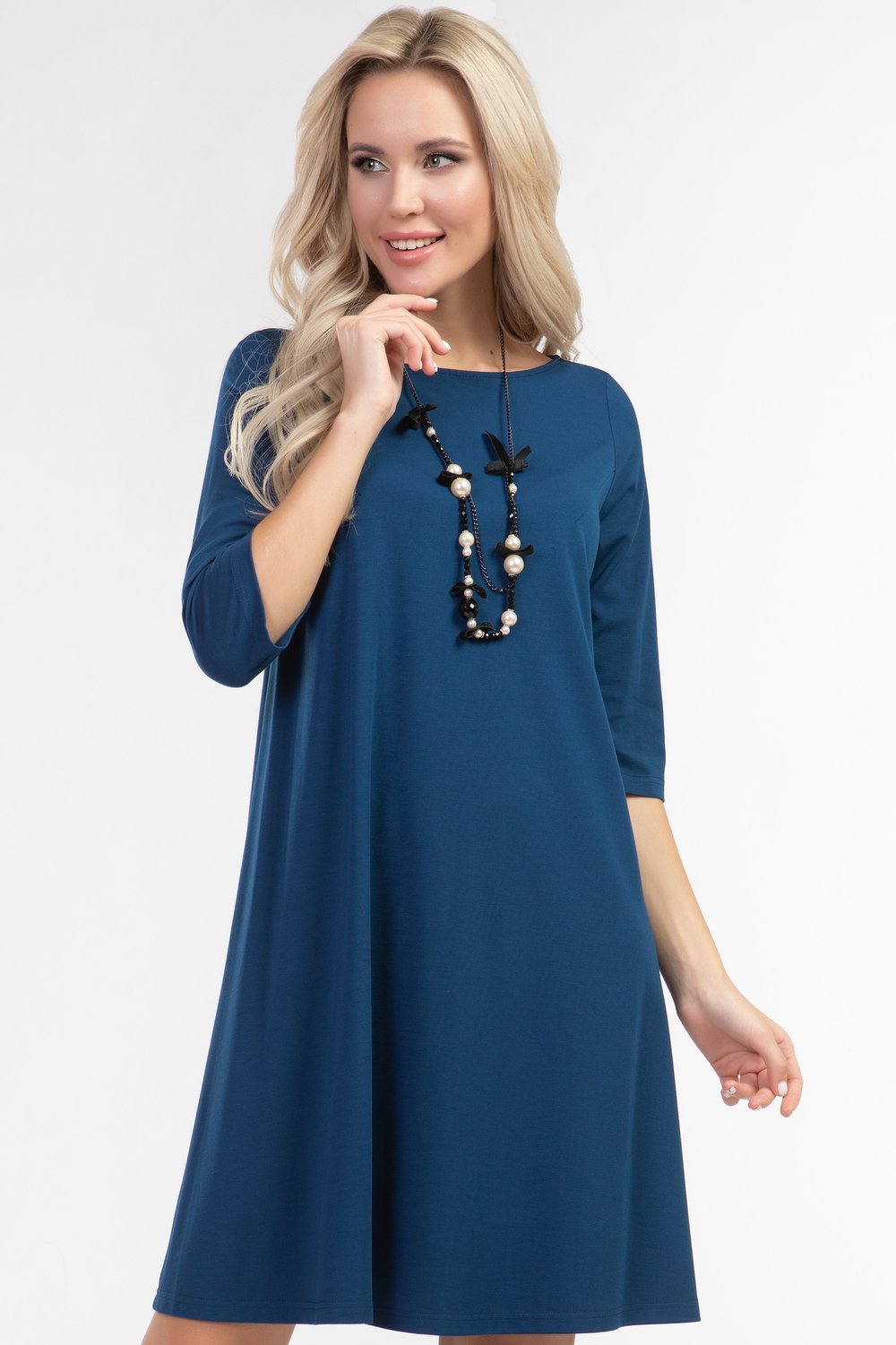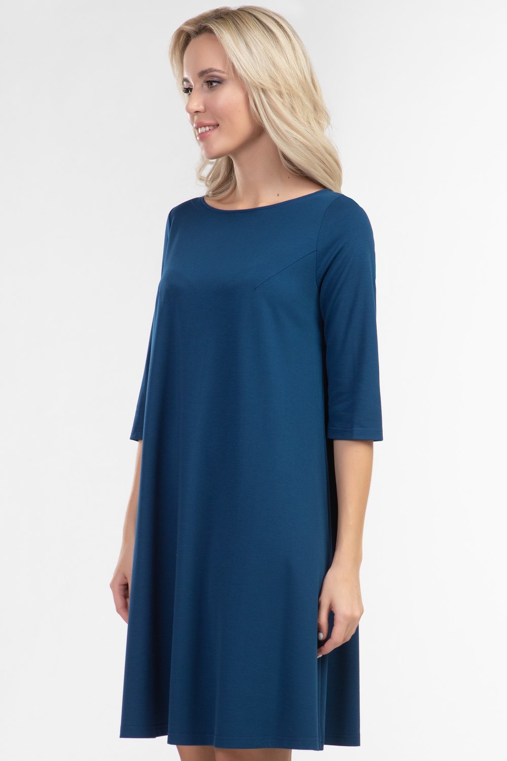 Платье А-образного силуэта из однотонного трикотажного полотна глубокого синего цвета, с большим содержанием вискозы со вставкой из сетки, в виде треугольника, и декоративного бантика по спинке! Круглая горловина, рукав 3/4, без застежки и подклада. Удобное и практичное платье - прекрасный наряд для торжественного случая. Уместно добавить по желанию аксессуар.Характеристики: