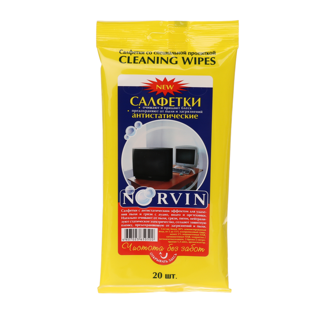 Салфетки с антистатическим эффектом для удаления пыли и грязи с аудио, видео и оргтехники. Они идеально очищают от пыли, грязи, пятен, нейтрализуют статическое электричество, так часто накапливающееся на этих предметах, и создают защитную пленку, препятствующую появлению отпечатков пальцев и пыли.