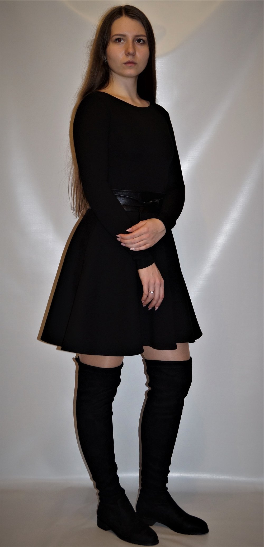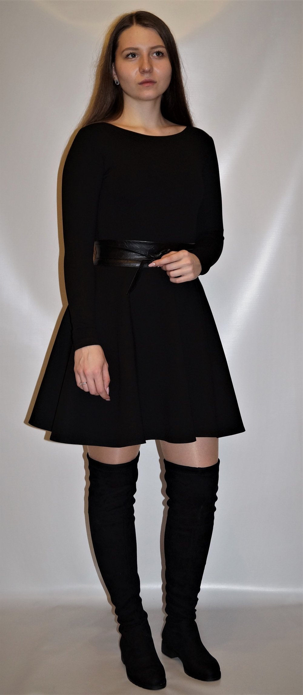 Платье трикотажное с длинным рукавом и карманами в боковом шве, юбка полусолнце, талию украшает кожаный пояс.Характеристики: