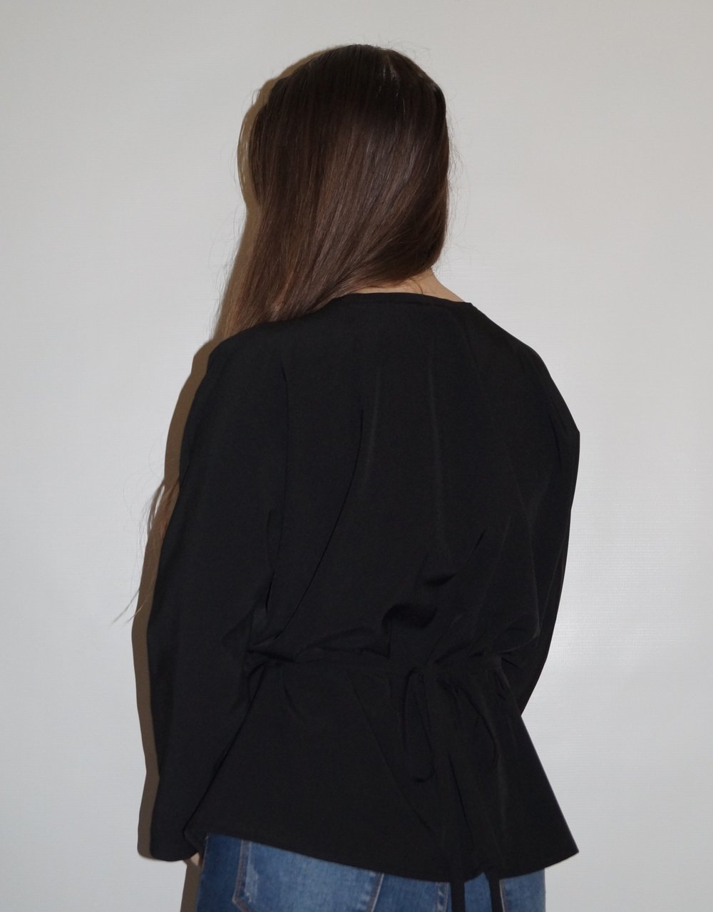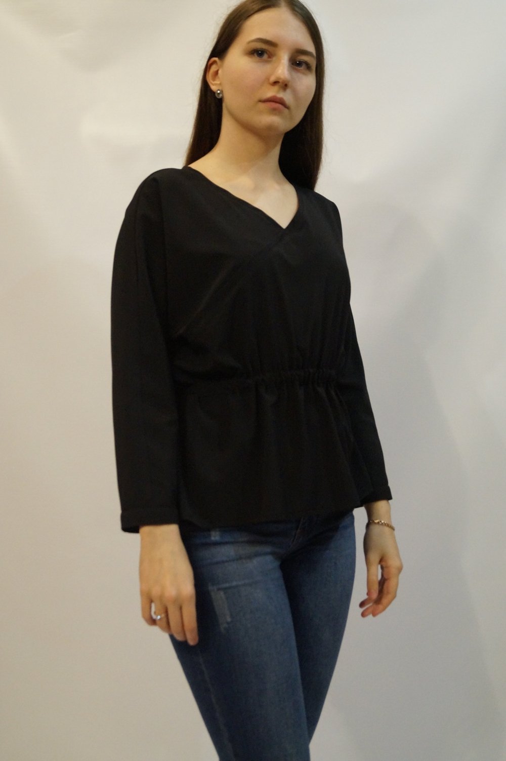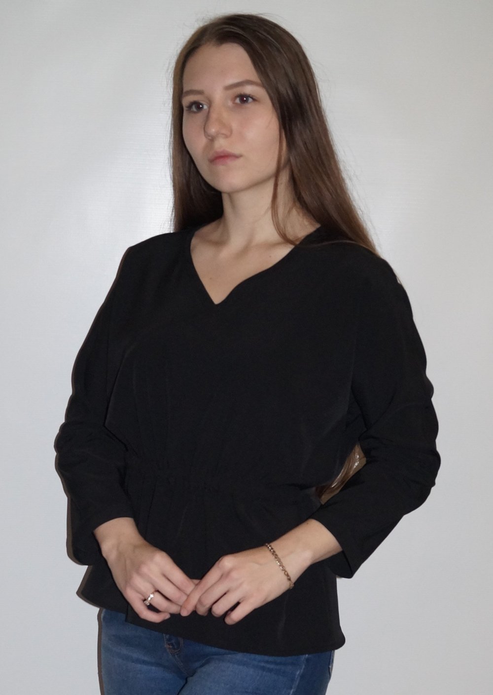 Блуза с цельнокройным рукавом, на талии кулиска, в которую вставлен поясок завязывающийся сзади.Характеристики: