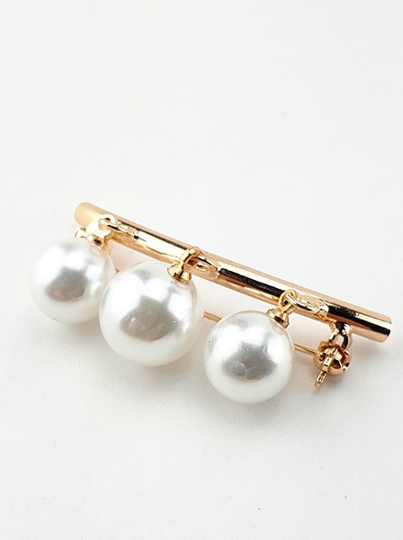 Брошь из металла под золото с тремя искусственными жемчужинами на булавке.