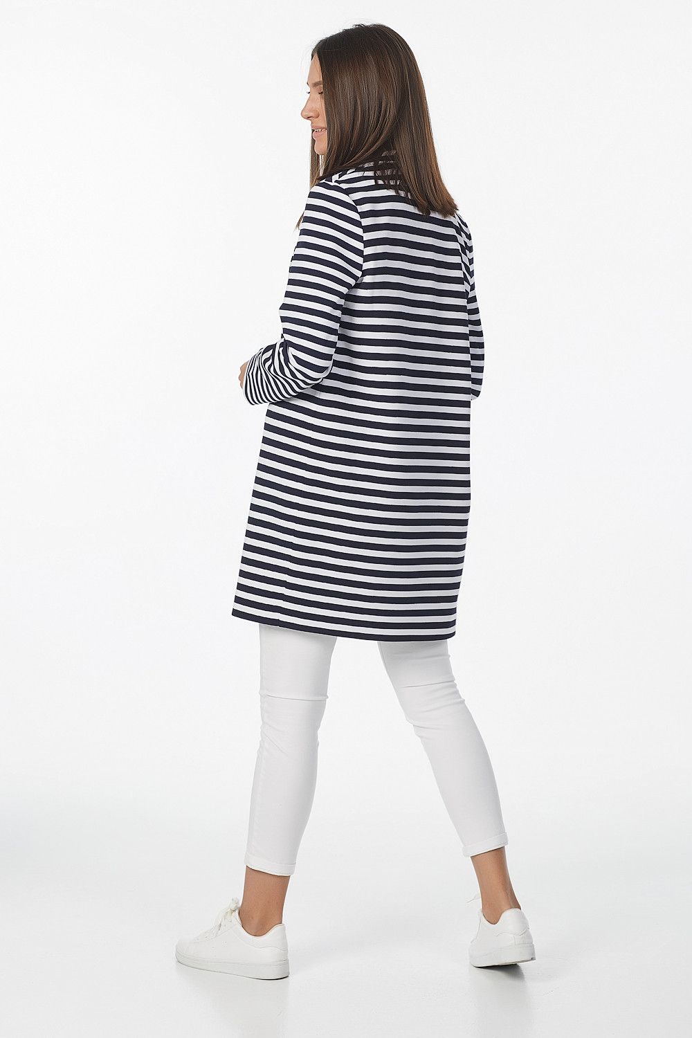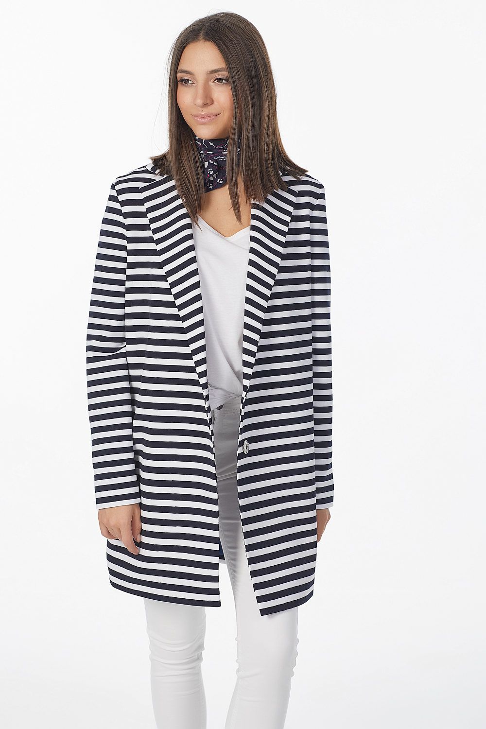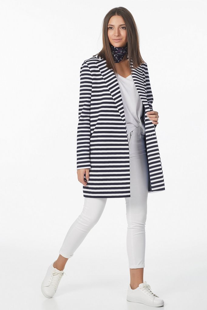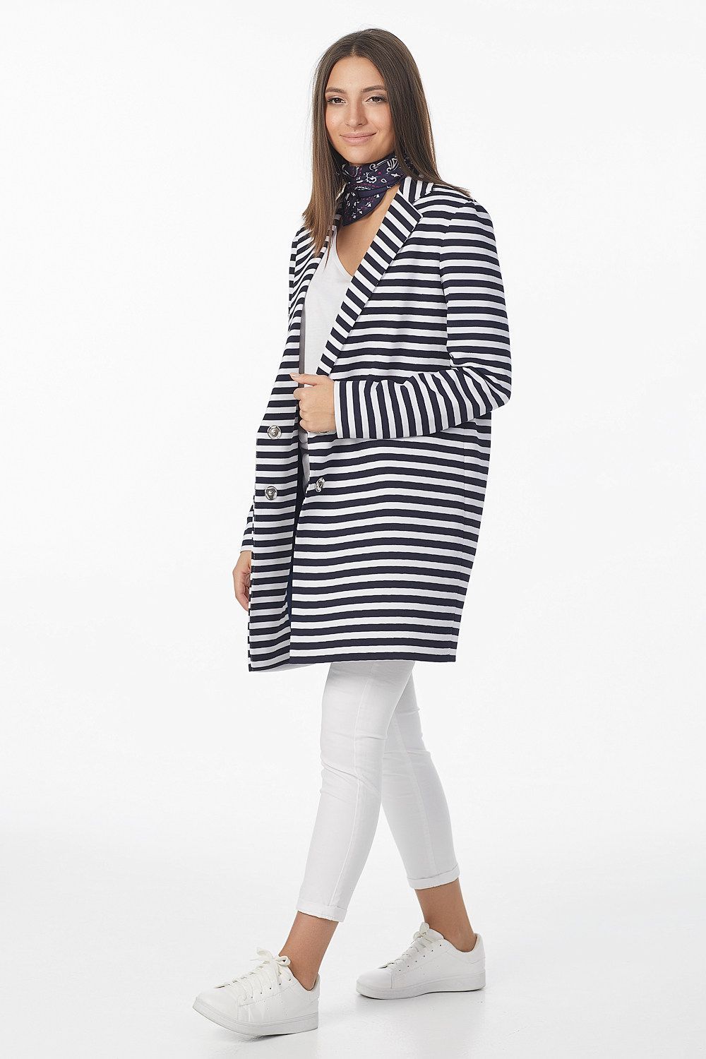 Стильный жакет прямого силуэта без подклада. Английский воротник пиджачного типа переходит в застежку на две кнопки. Рукав втачной удлиненный. Длина изделия по спинке около 85 см (44 р50 р).Характеристики: