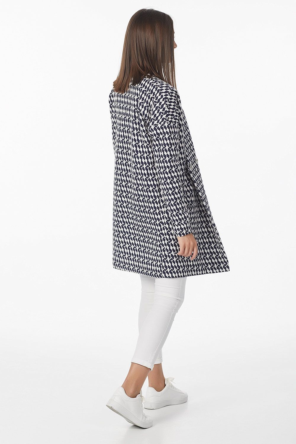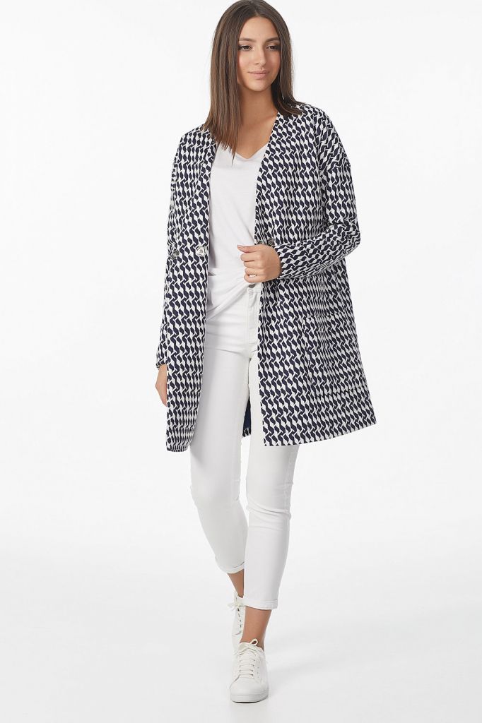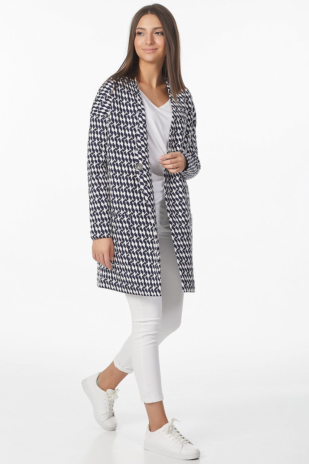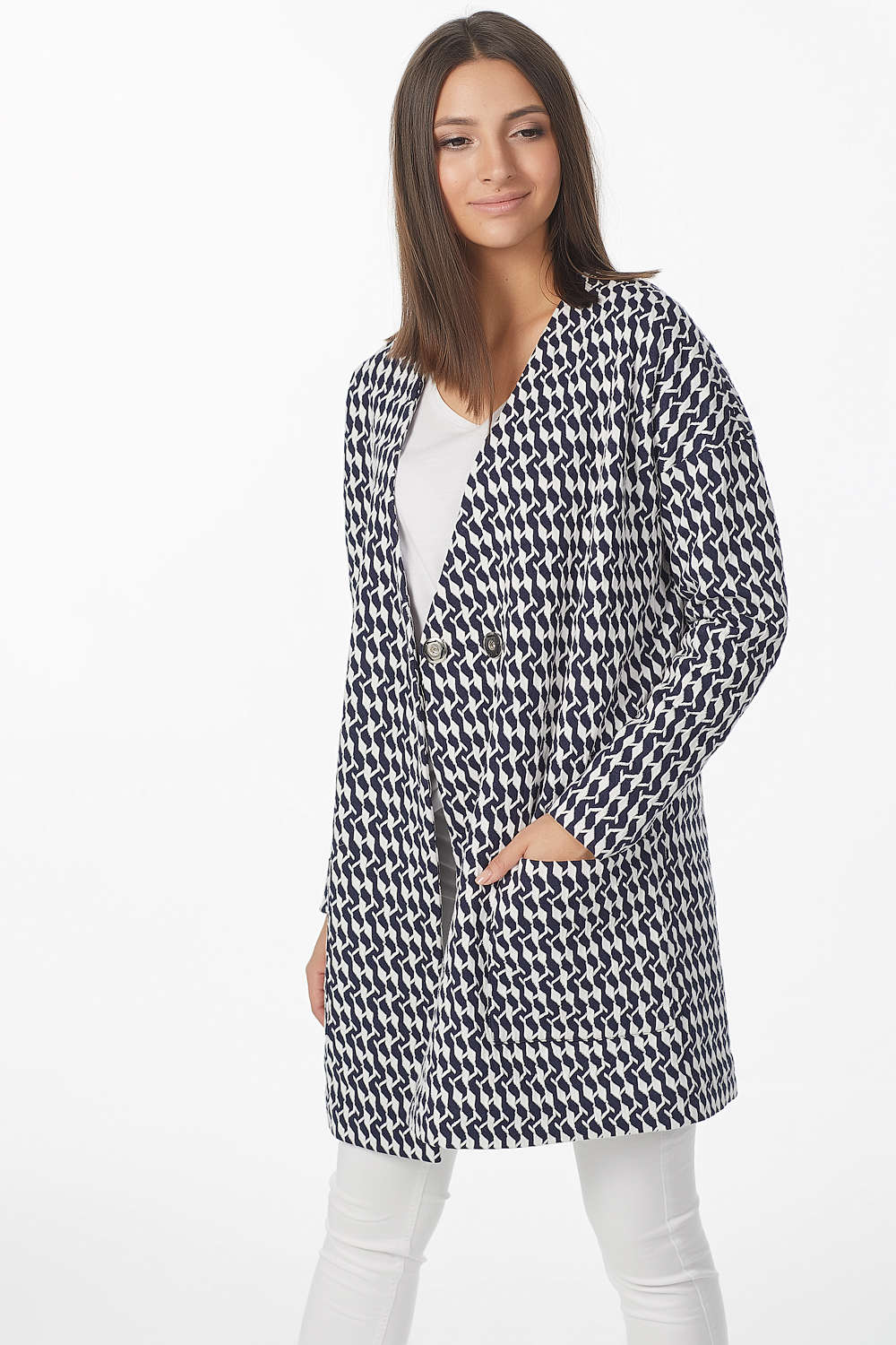 Стильный жакет прямого силуэта без подклада из качественного жаккардового трикотажа. Двубортная застежка на две кнопки. Линия борта и горловины обработаны обтачкой. Оформлен большими накладными карманами. Рукав втачной удлиненный со спущенной проймой. Длина изделия по спинке около 90 см (44 р) 92 см (50 р).Характеристики: