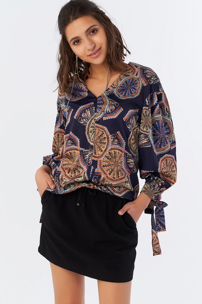 • Особенности: Шелковая блуза прямого силуэта посадка свободная! Детали: V-образный вырез горловины средний шов рукав расширенный с наборками по плечу и манжету завязки по низу рукава. Принт абстрактный не стыковка принта по центру намеренна не считается браком.