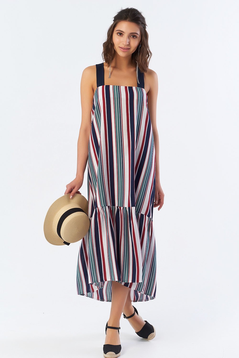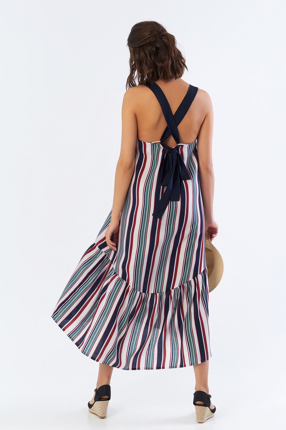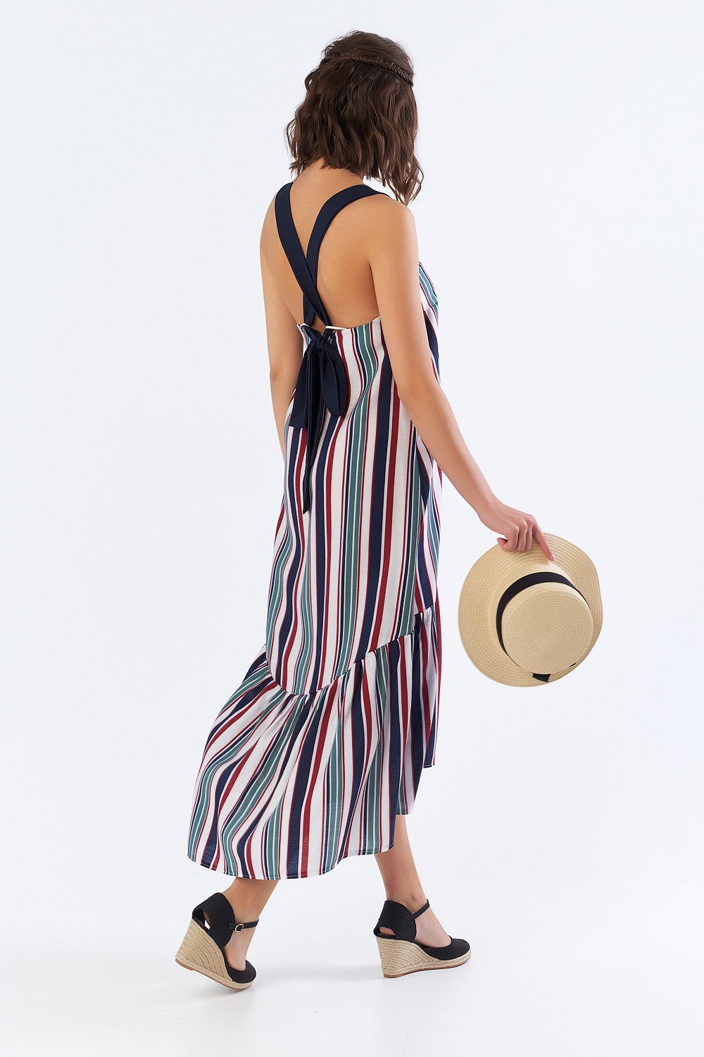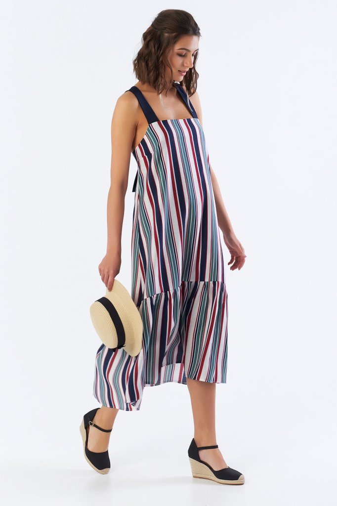 • Особенности: Платье-сарафан расклешенного силуэта. В верхней части - контрастные перекрестные завязки по спинке. По низу выполнен асимметричный волан с наборкой.