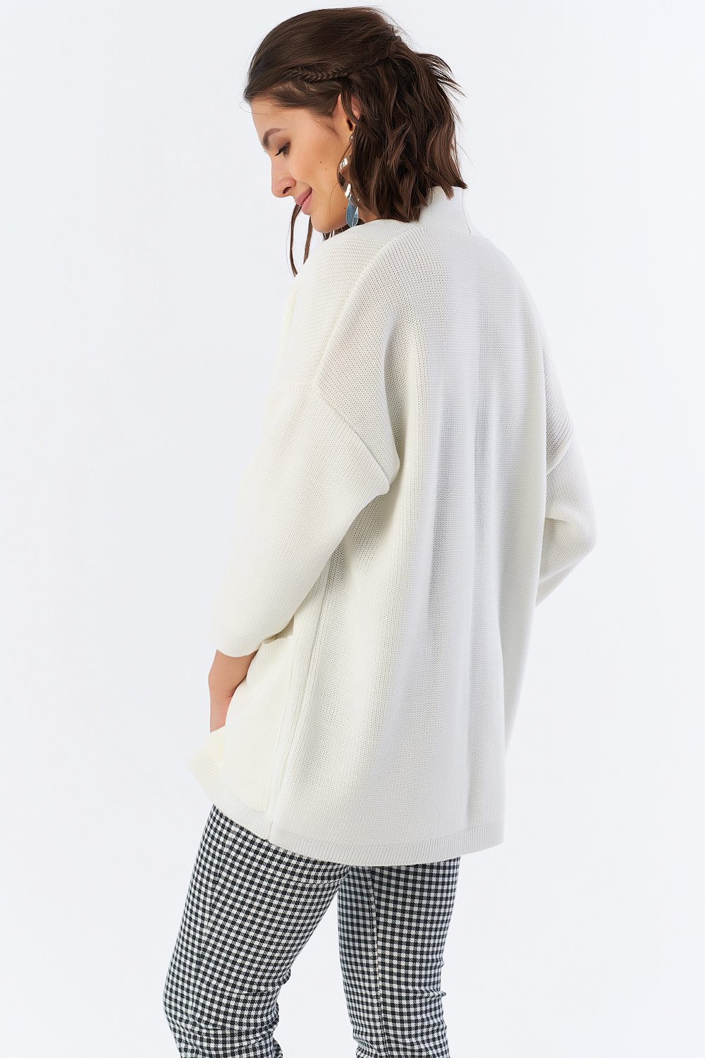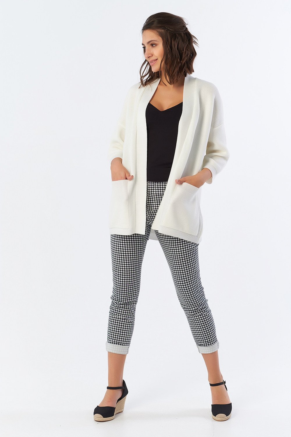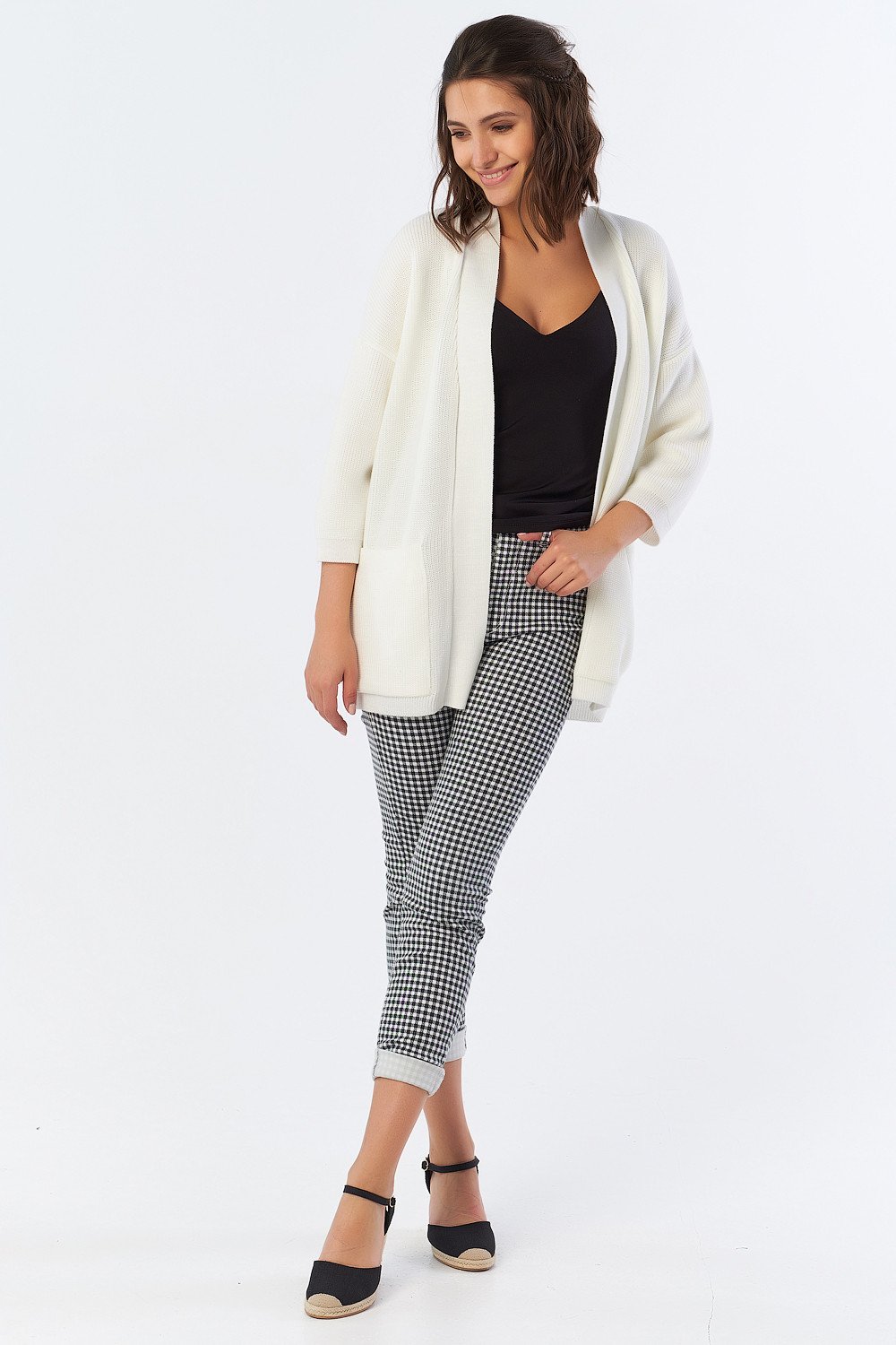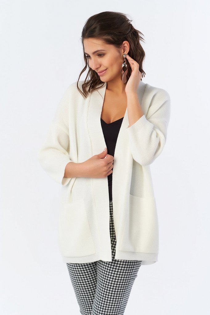 • Карманы: на переде большие накладные Особенности: Вязаный кардиган из фактурной пряжи. Перед кардигана оформлены широкой бейкой.