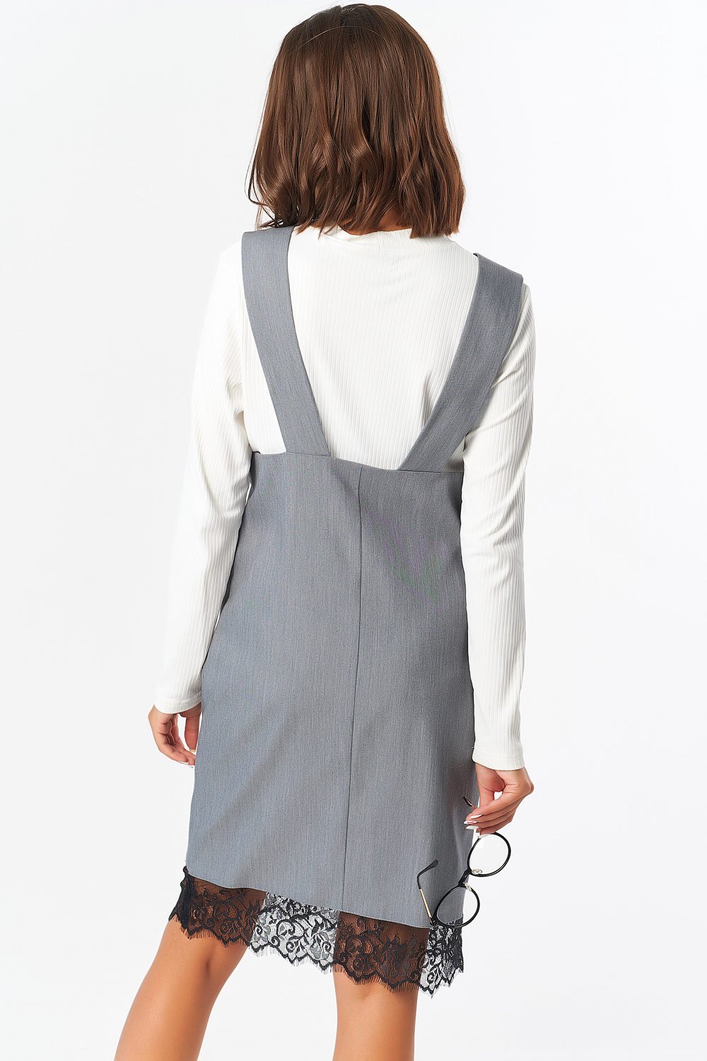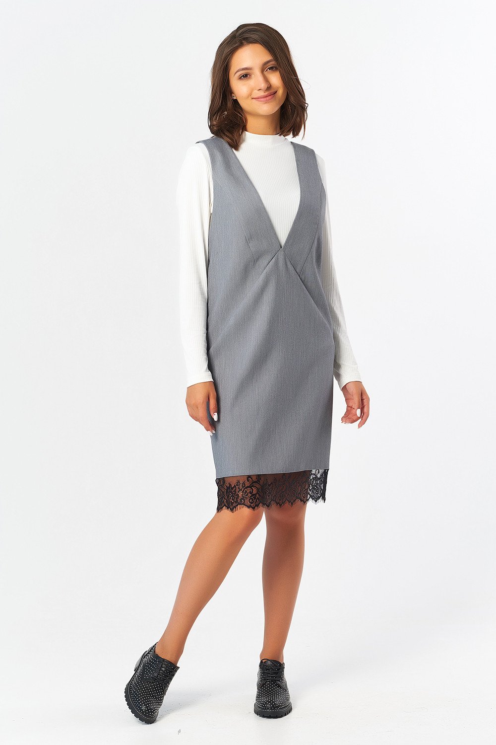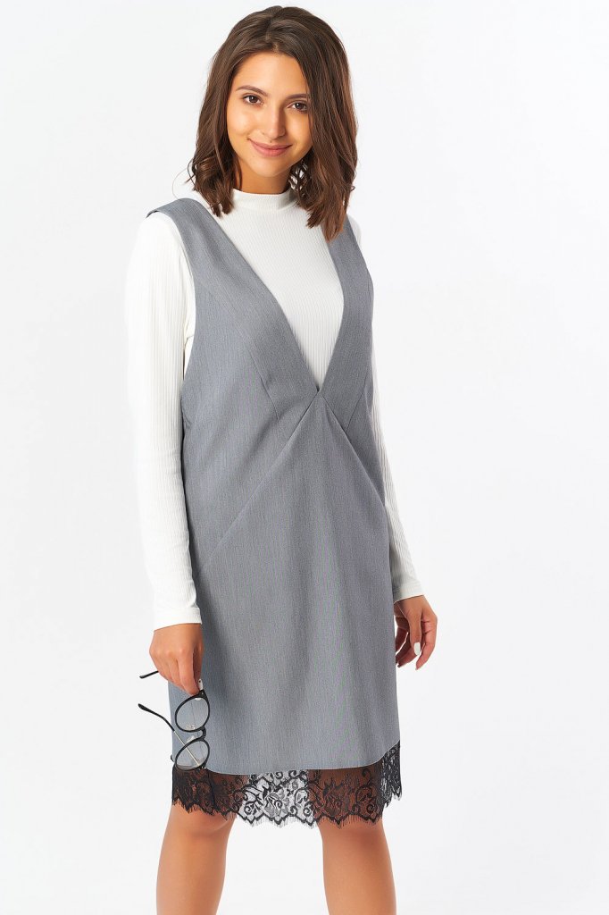 • Особенности: Сарафан прямого силуэта из костюмной ткани. Детали: V-образный вырез горловины широкие бретели кружевная отделка по низу изделия.