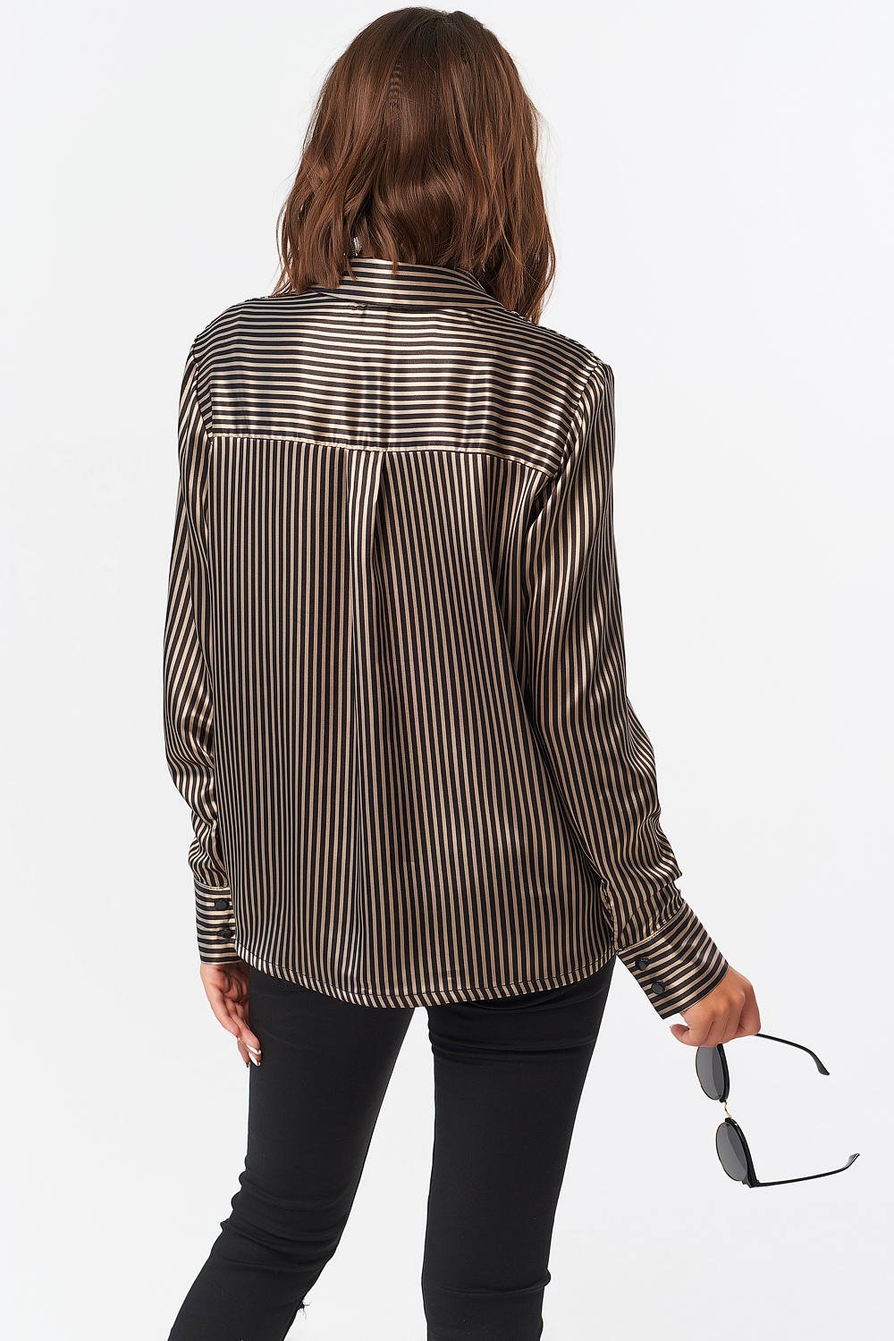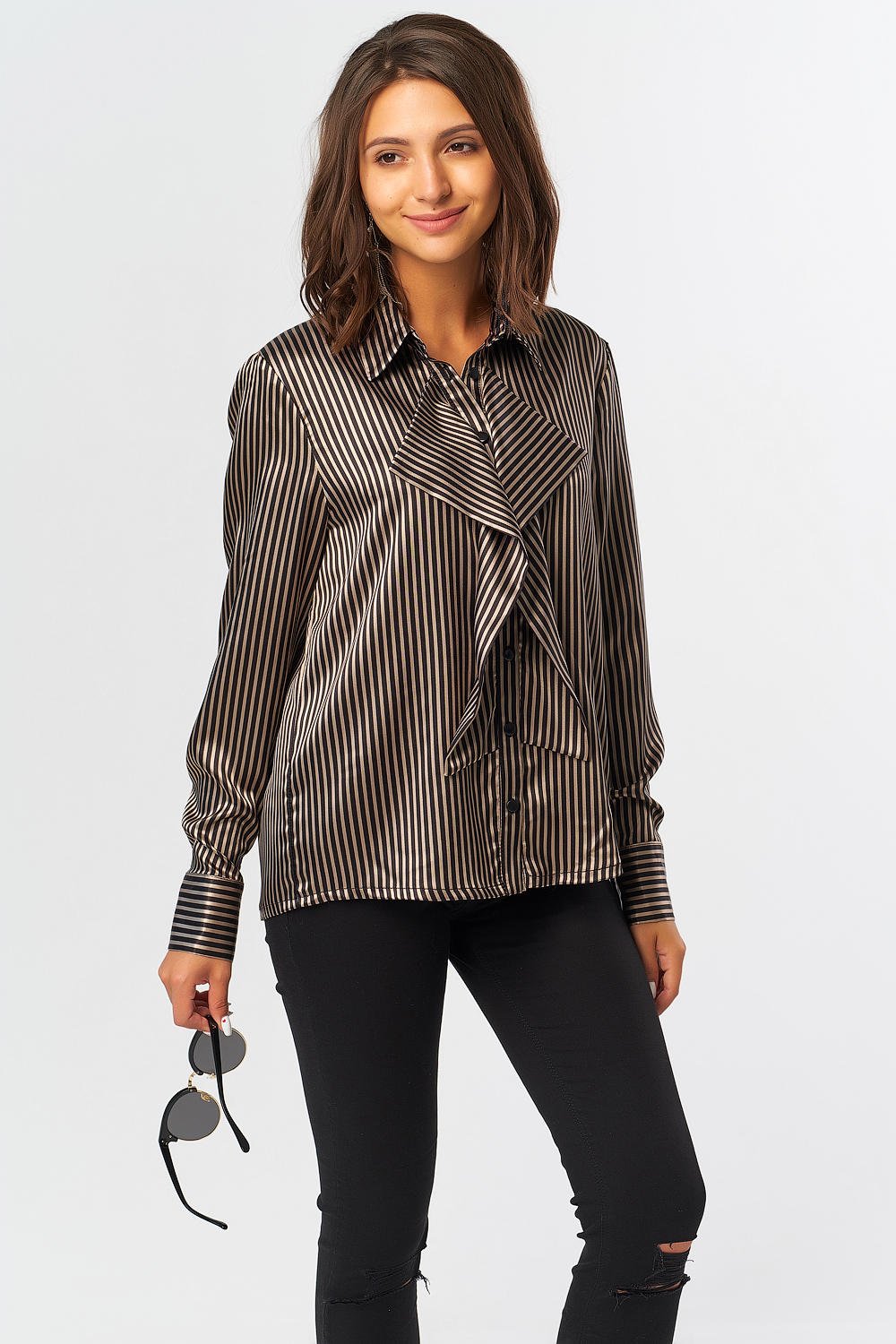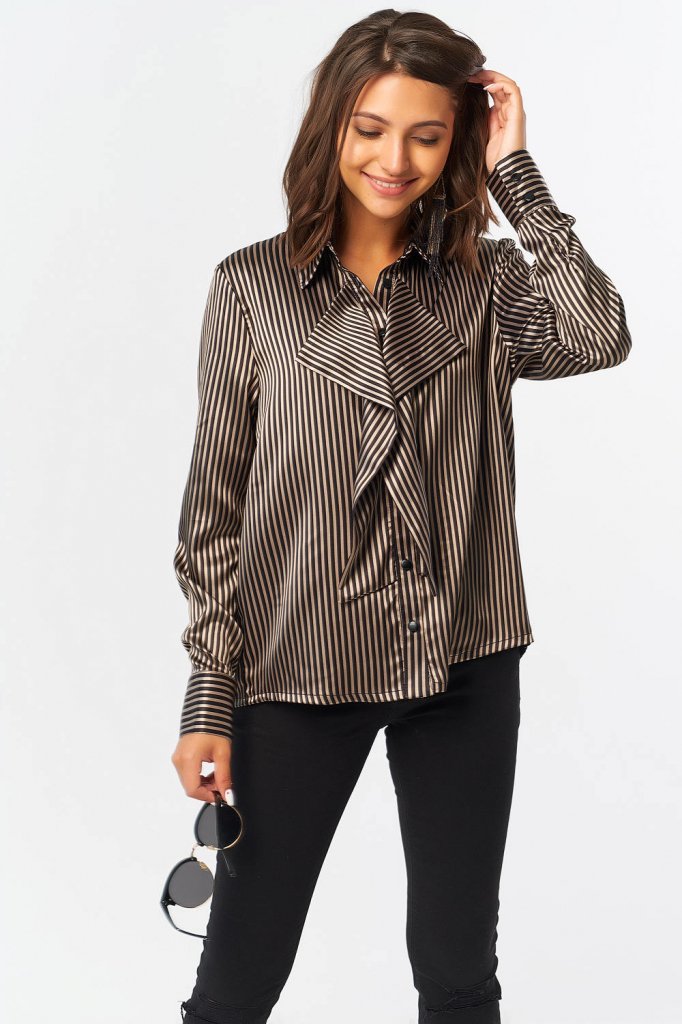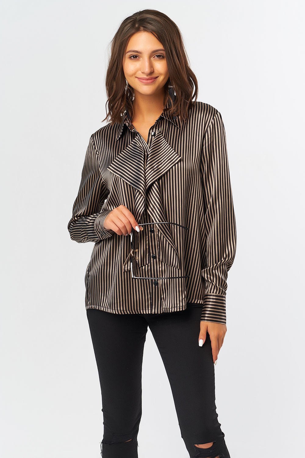 • Особенности: Блуза прямого силуэта из атласной ткани в полоску. Детали: отложной воротник планка с застежкой на петли и пуговицы декоративная деталь по переду рукав втачной длинный на манжете.