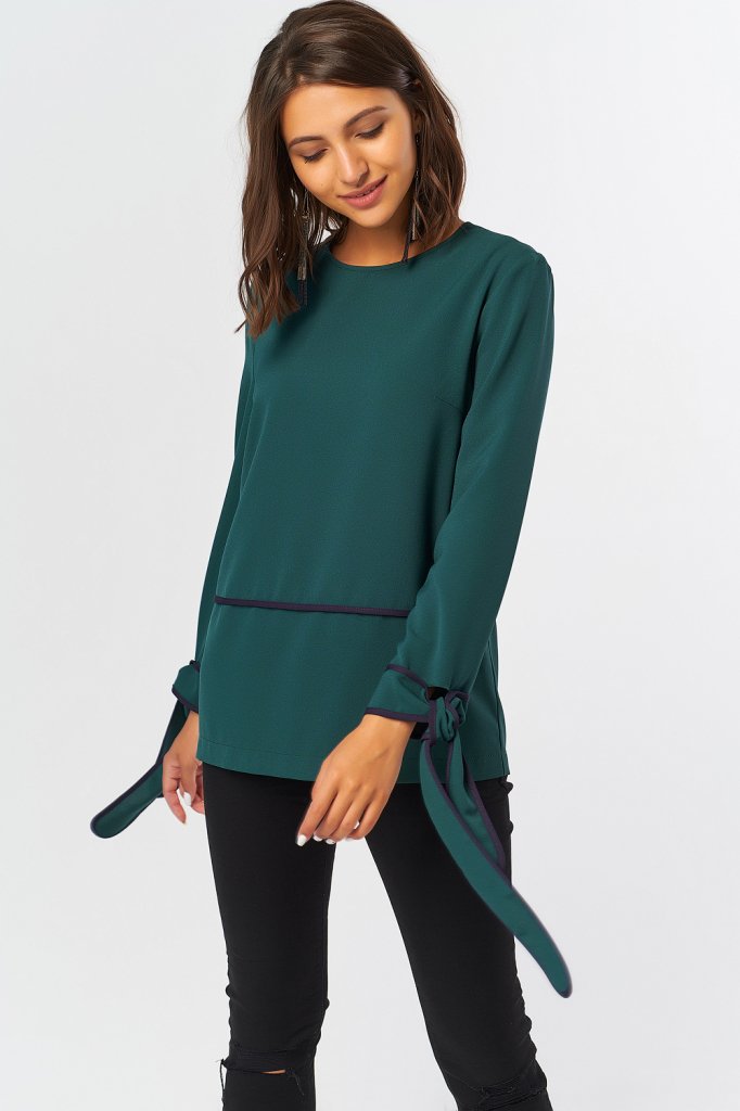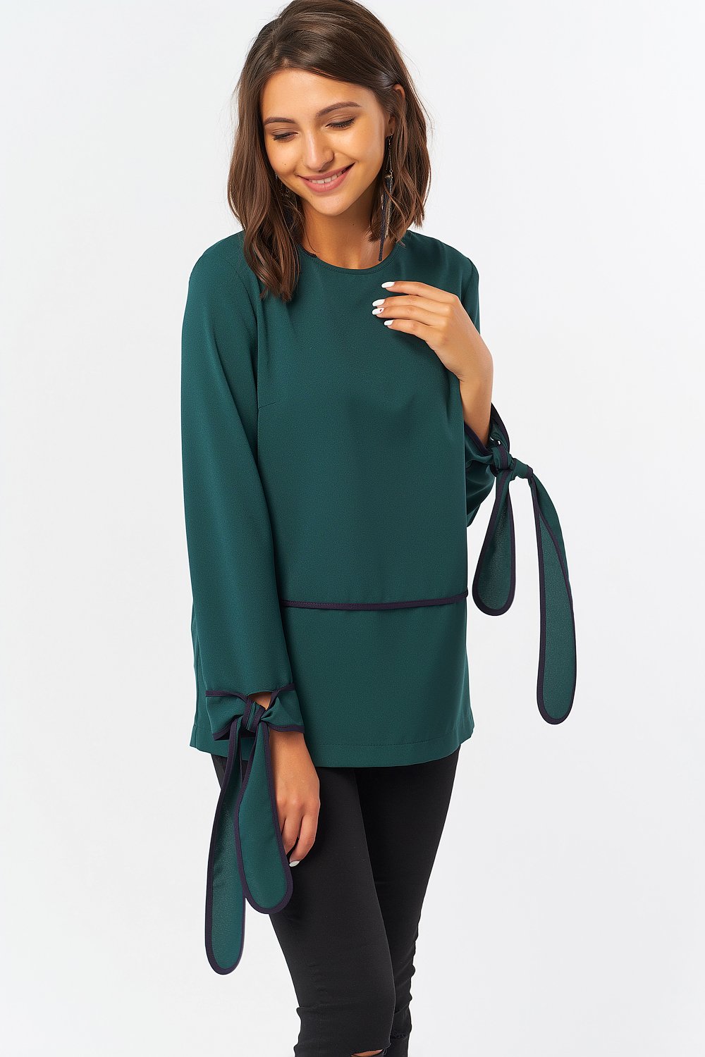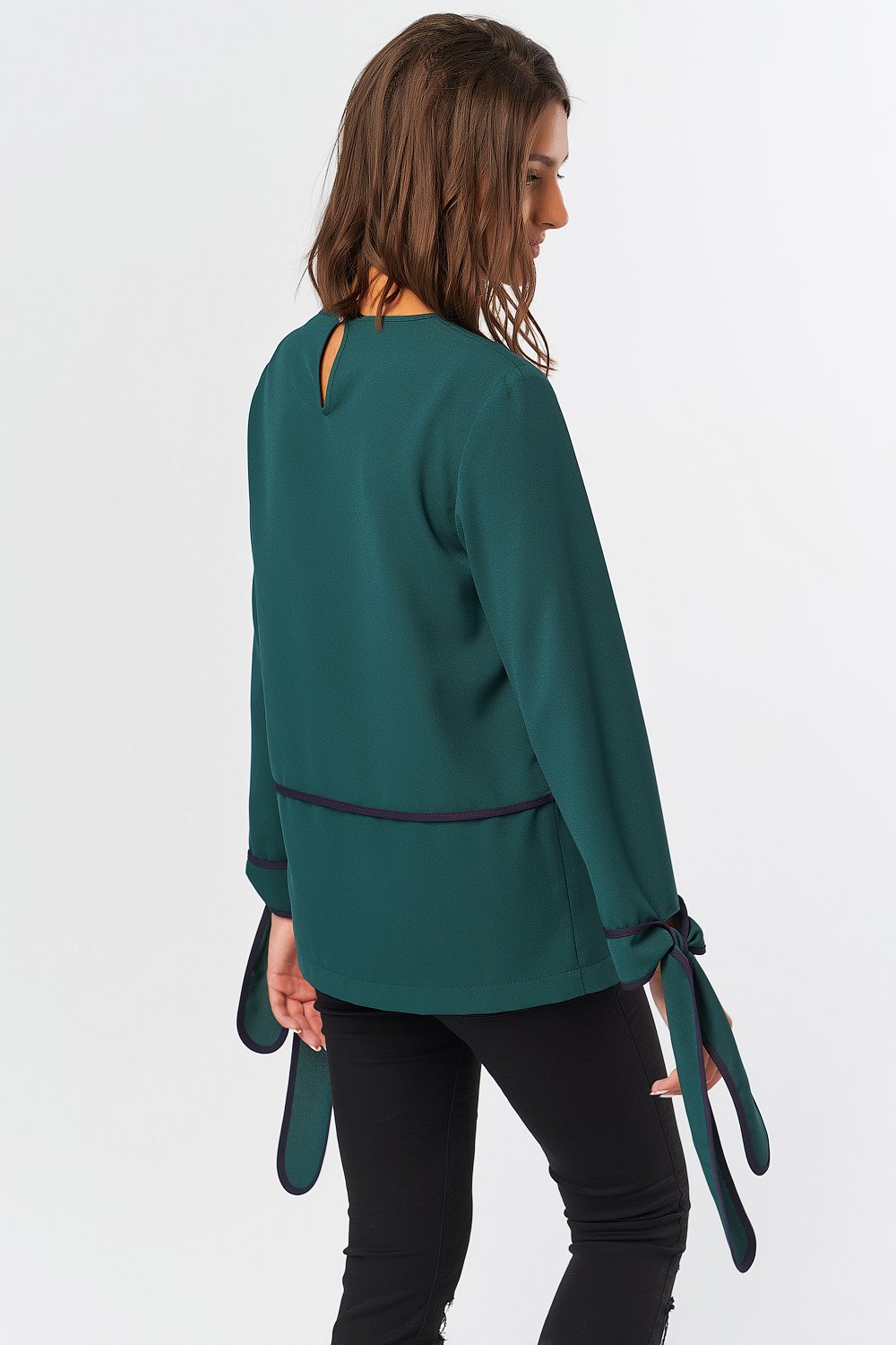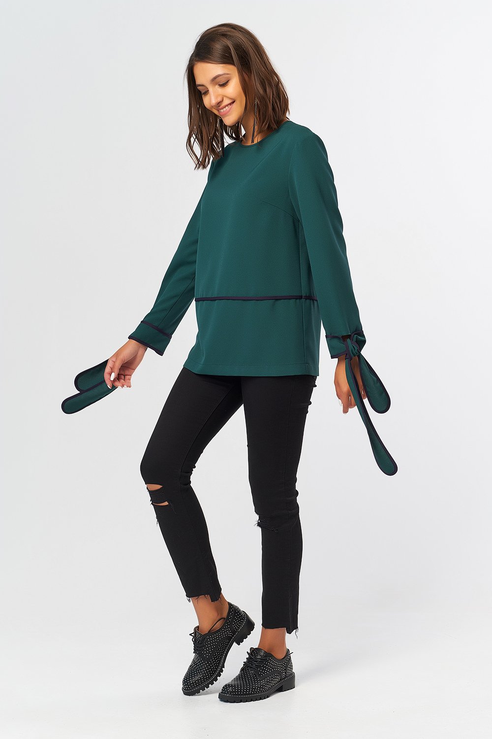 • Особенности: Блуза прямого силуэта из плотного крепа с контрастной отделкой. Детали: горловина обработана окантовкой в цвет основного материала по переду и спинке выполнены поперечные подрезы отделанные контрастной окантовкой. по низу рукава выполнены манжеты-завязки окантованные по периметру контрастной отделкой. Застежка на петлю-пуговицу в среднем шве спинки.