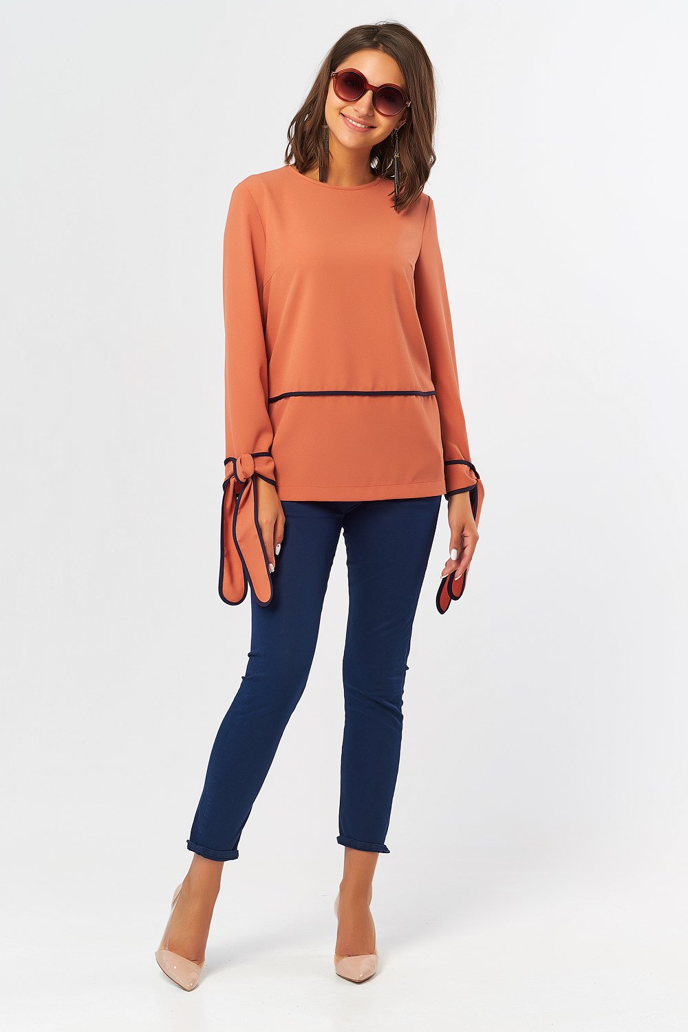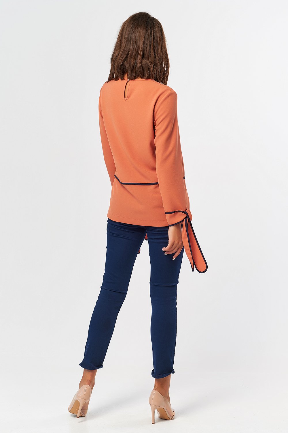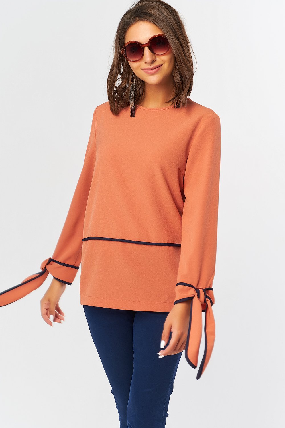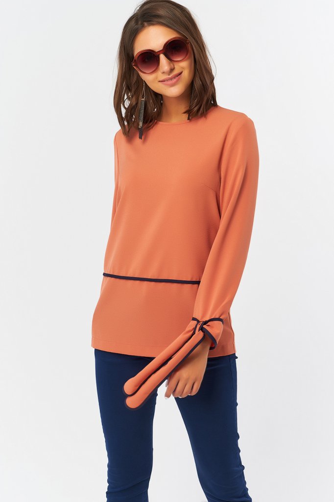 • Особенности: Блуза прямого силуэта из плотного крепа с контрастной отделкой. Детали: горловина обработана окантовкой в цвет основного материала по переду и спинке выполнены поперечные подрезы отделанные контрастной окантовкой. по низу рукава выполнены манжеты-завязки окантованные по периметру контрастной отделкой. Застежка на петлю-пуговицу в среднем шве спинки.