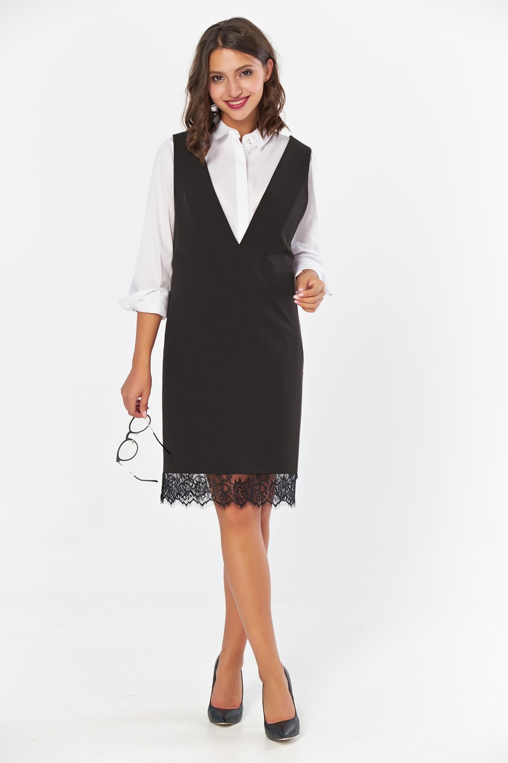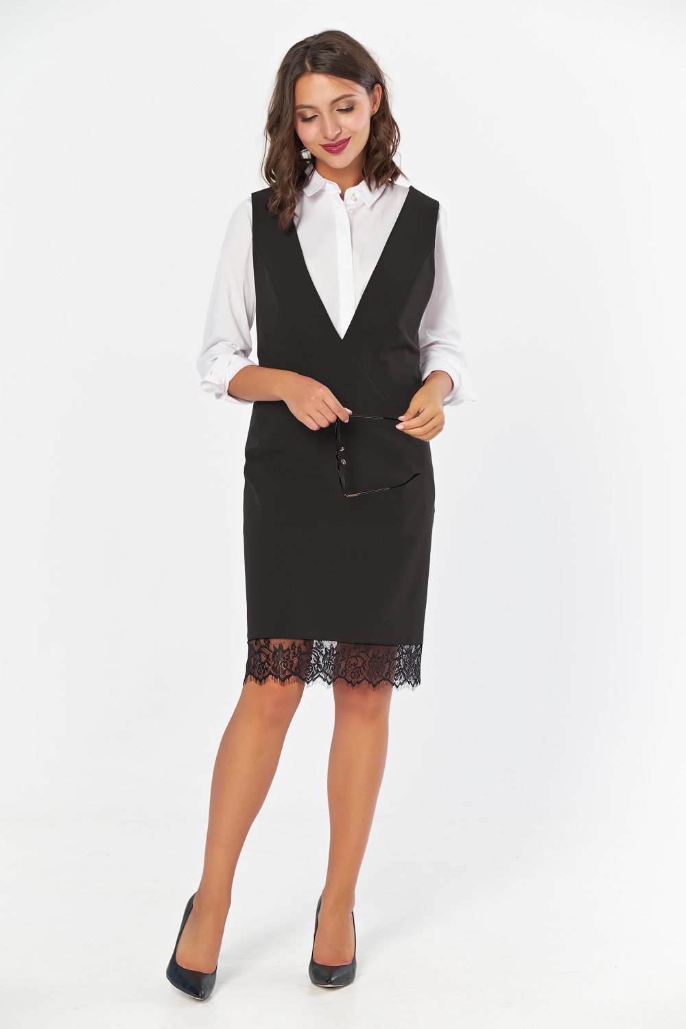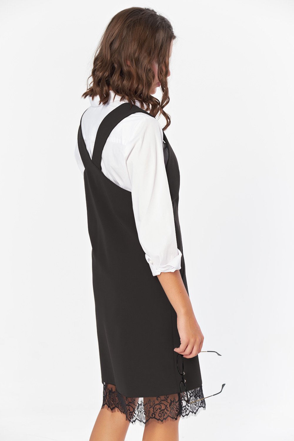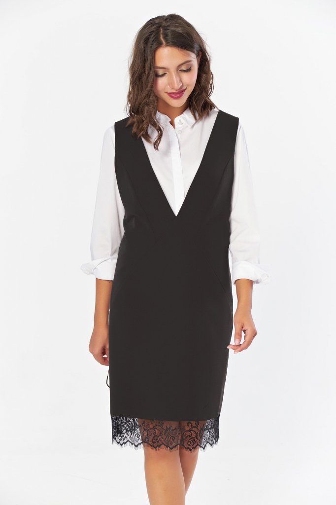 • Особенности: Сарафан прямого силуэта из костюмной ткани. Детали: глубокийV-образный вырез горловины широкие бретели кружевная отделка по низу изделия. Без застежки.