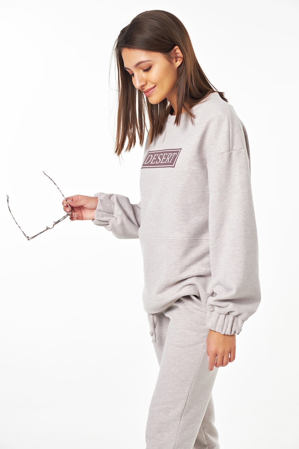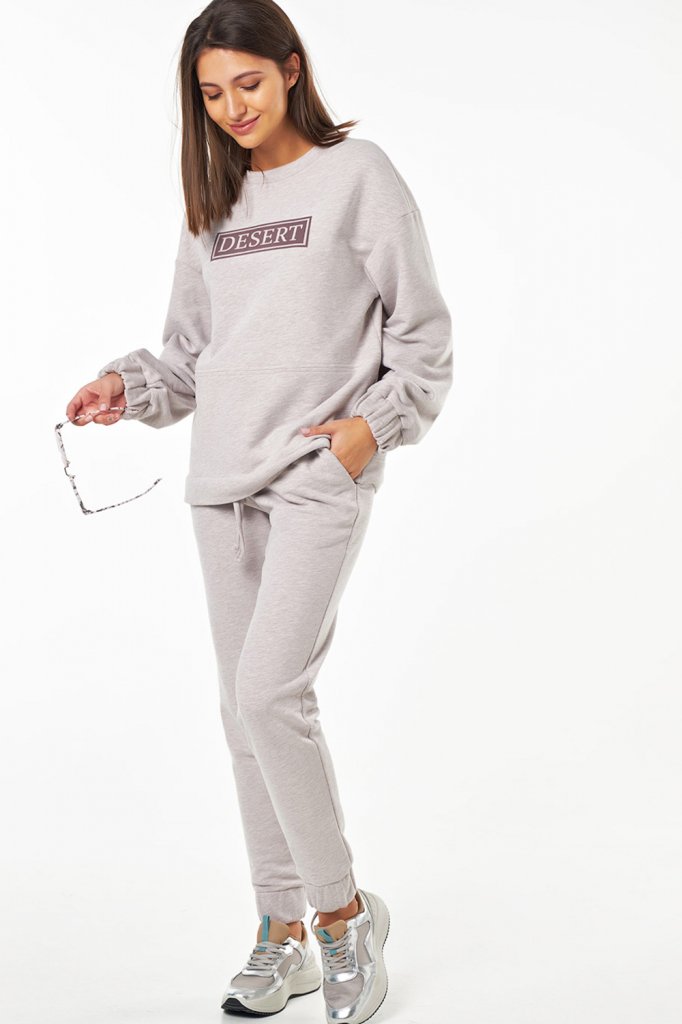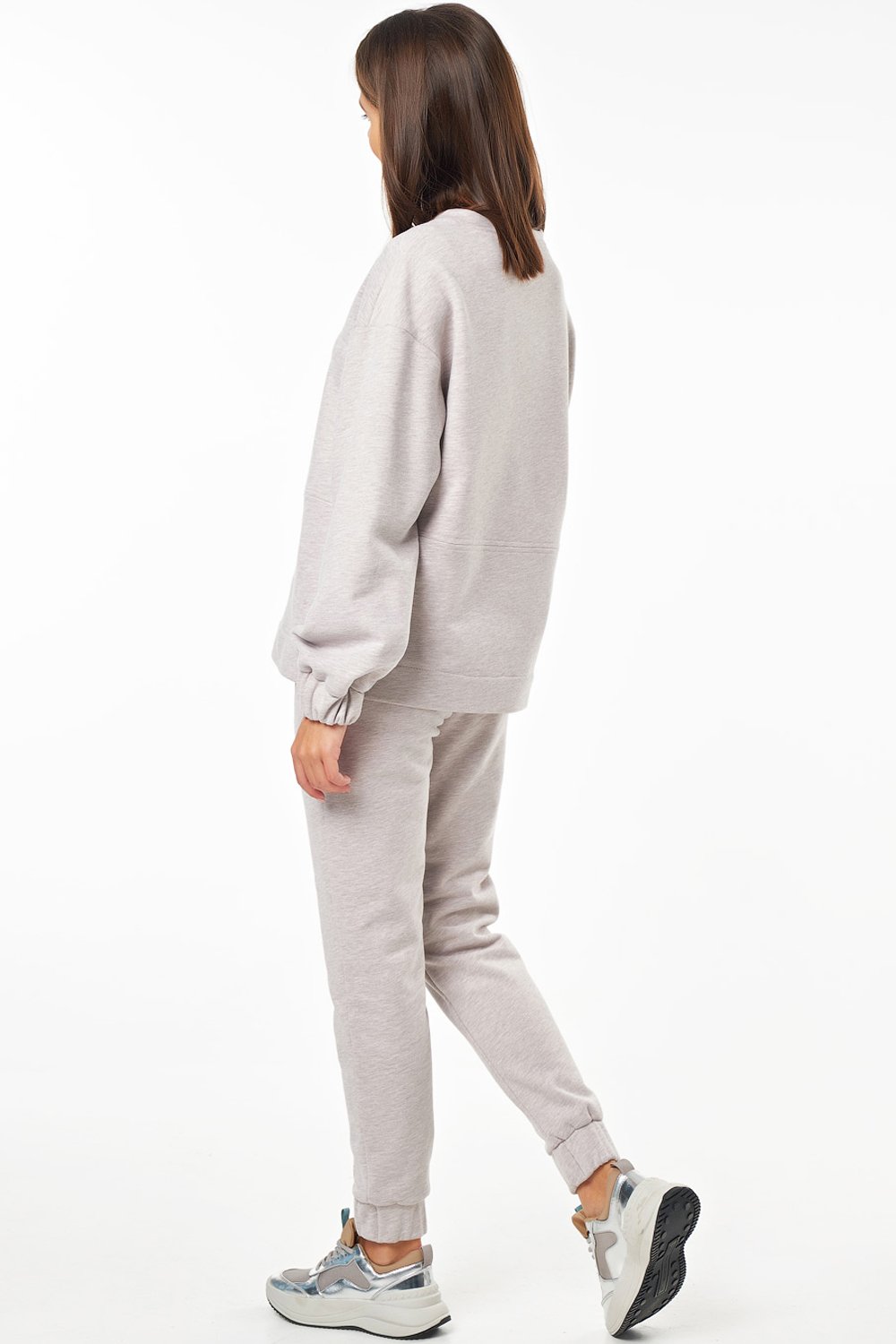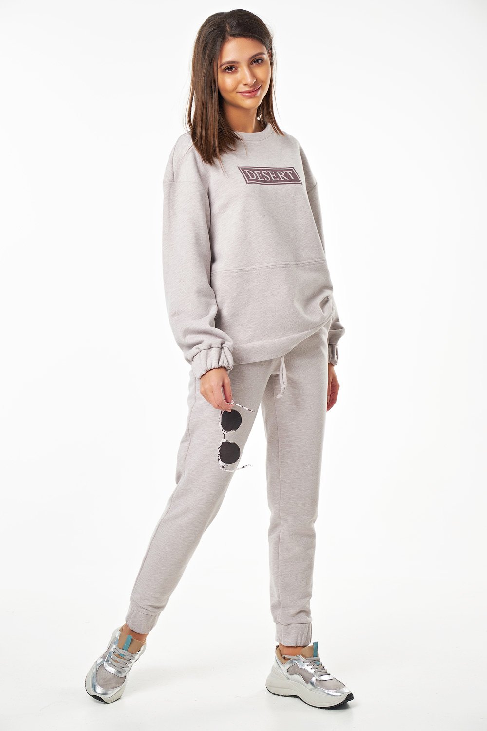 • Особенности: Костюм из футера. Свитшот прямого силуэта объемный. Детали: горловина обработана бейкой по переду и спинке выполнены горизонтальные членения на верхней части переда выполнена печать рукав объемный со сборкой на манжету подгибка низа с широкой настрочкой. Брюки со средней посадкой прилегающего силуэта. Детали: в поясе выполнена кулиса со шнурком брючные карманы по среднему шву выполнена настрочка с имитацией гульфика.