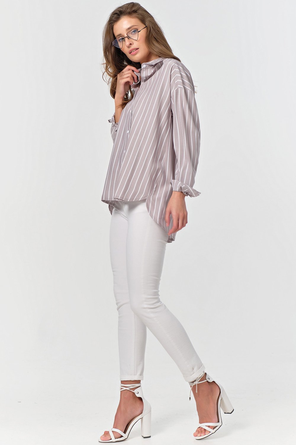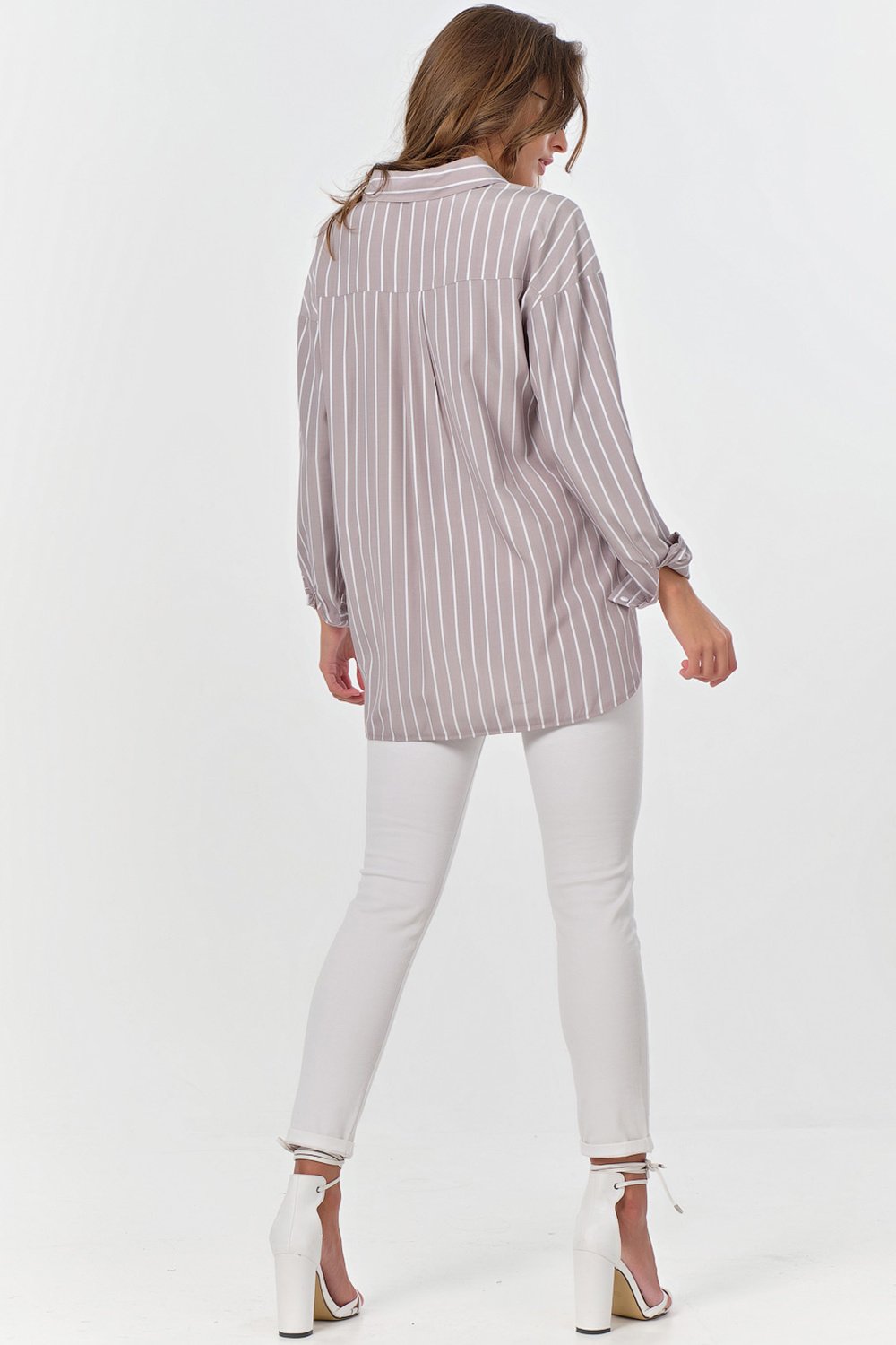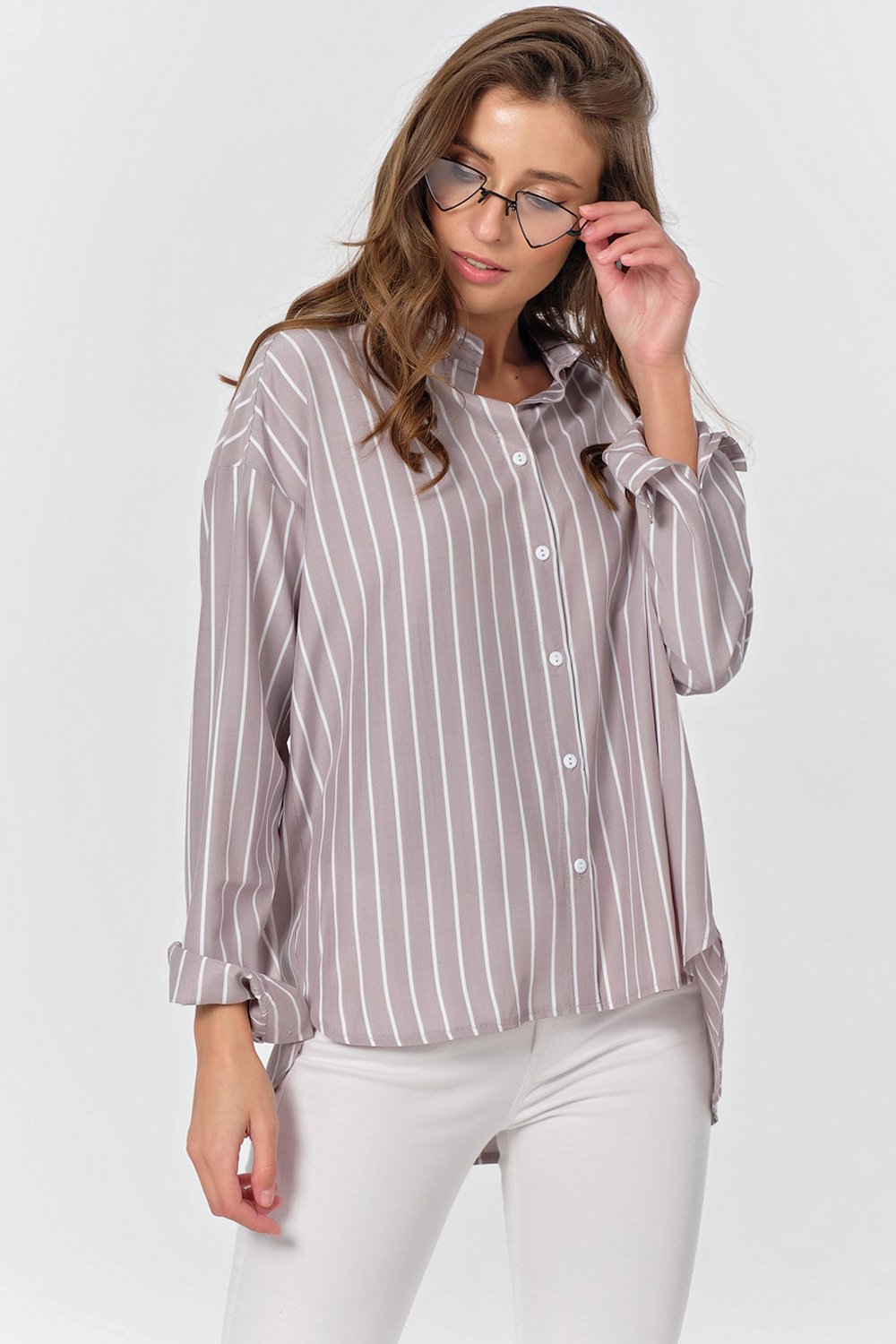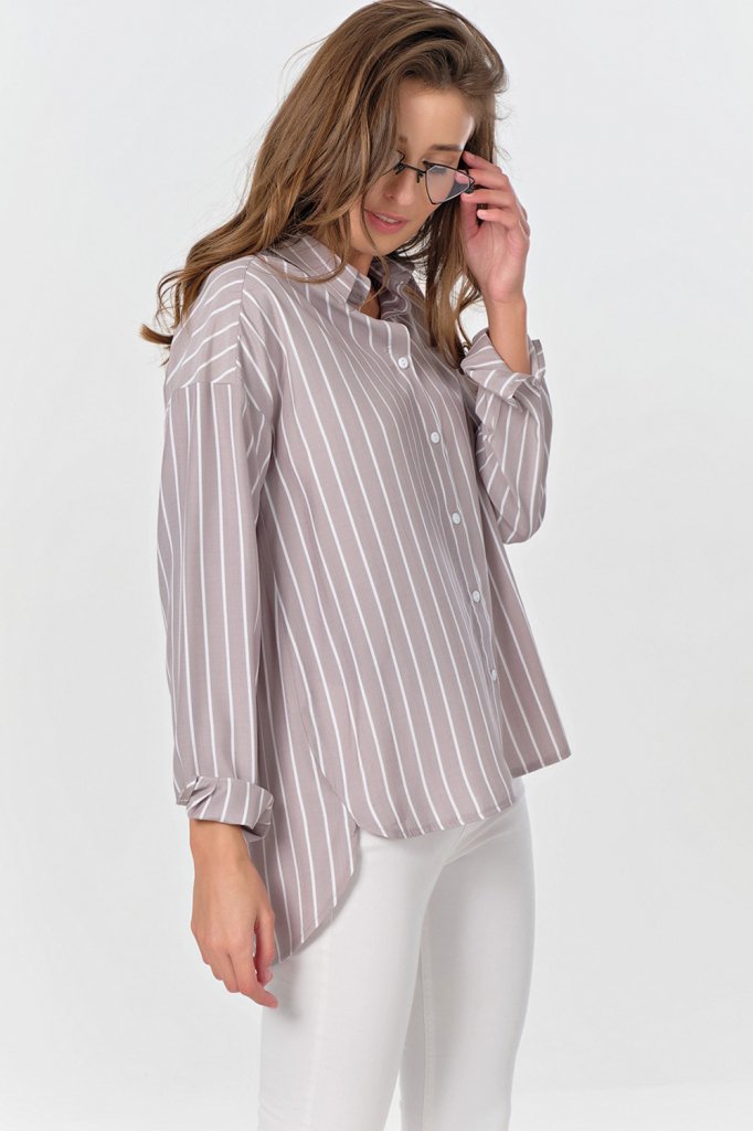 • Особенности: Рубашка свободного силуэта из сорочечной ткани. Детали: спущенная линия плеча по спинке кокетка переходящая на перед отложной воротник на стойке боковые швы с небольшим смещением на перед по низу блузы низ переда и спинки имеют скругленную форму по низу рукава притачная манжета с застежкой на петлю-пуговицу. Застежка по переду на петли-пуговицы.