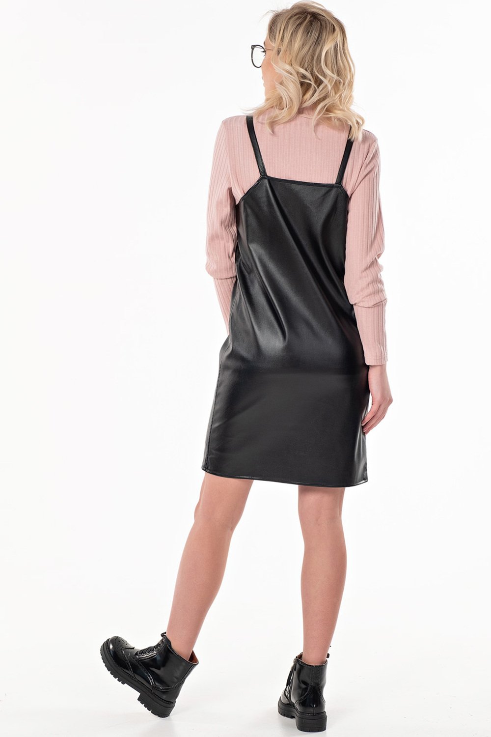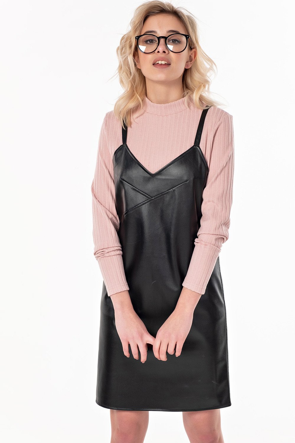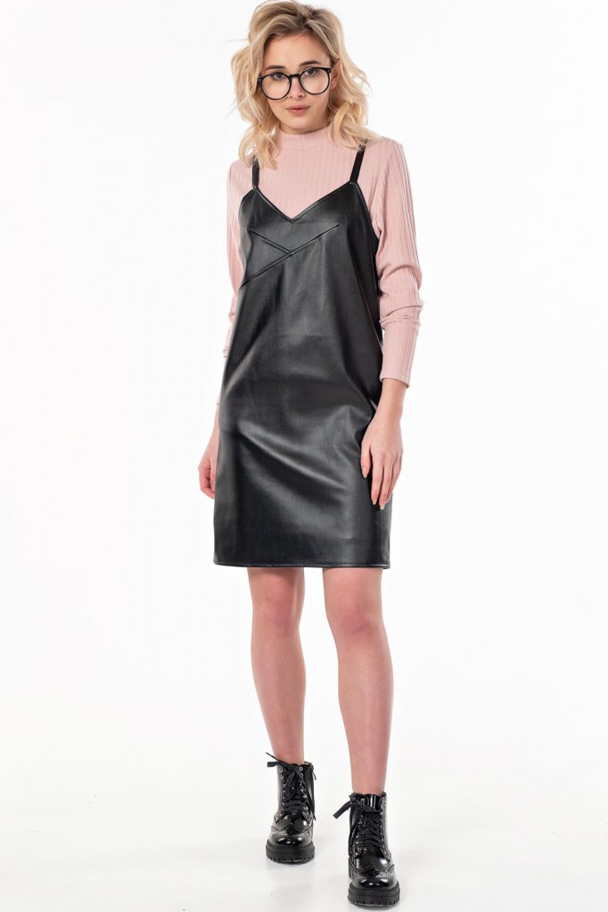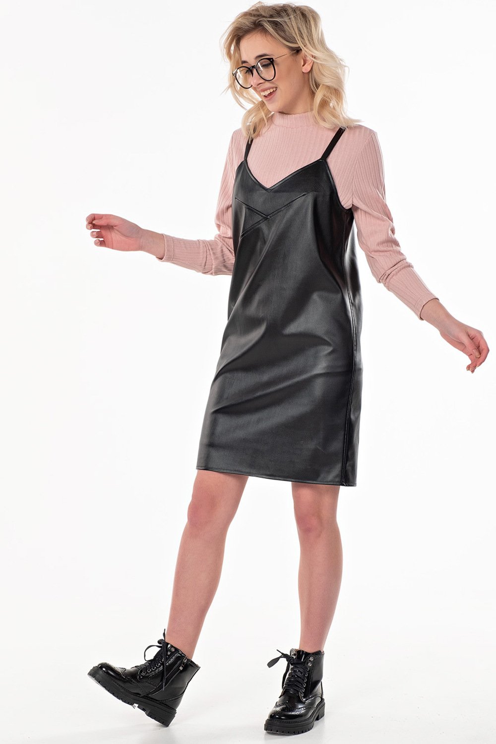 • Особенности: Сарафан прямого силуэта из искусственной кожи. Детали: перекрестные швы с острочкой фигурная форма вырезу по переду бретели из основного материала.