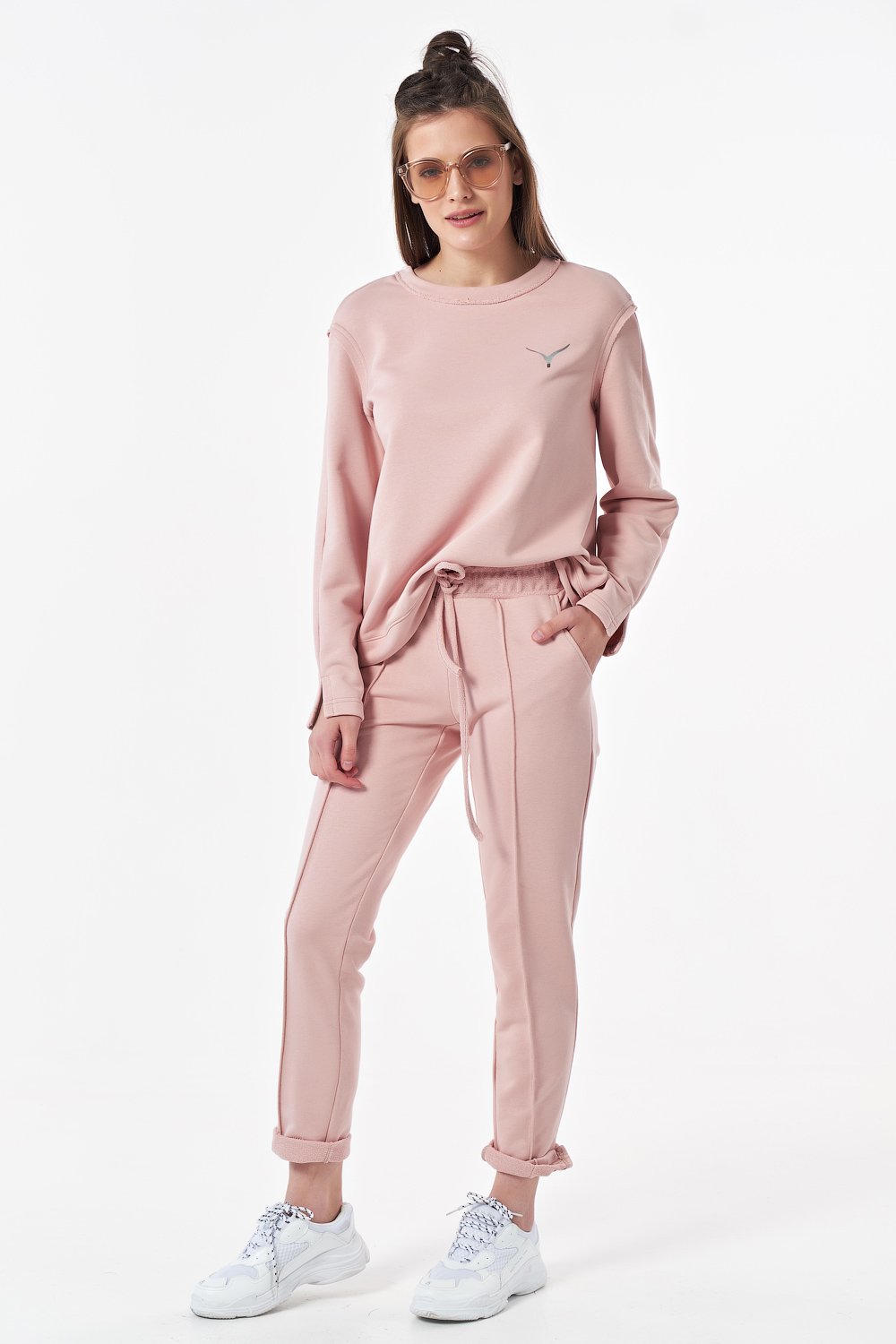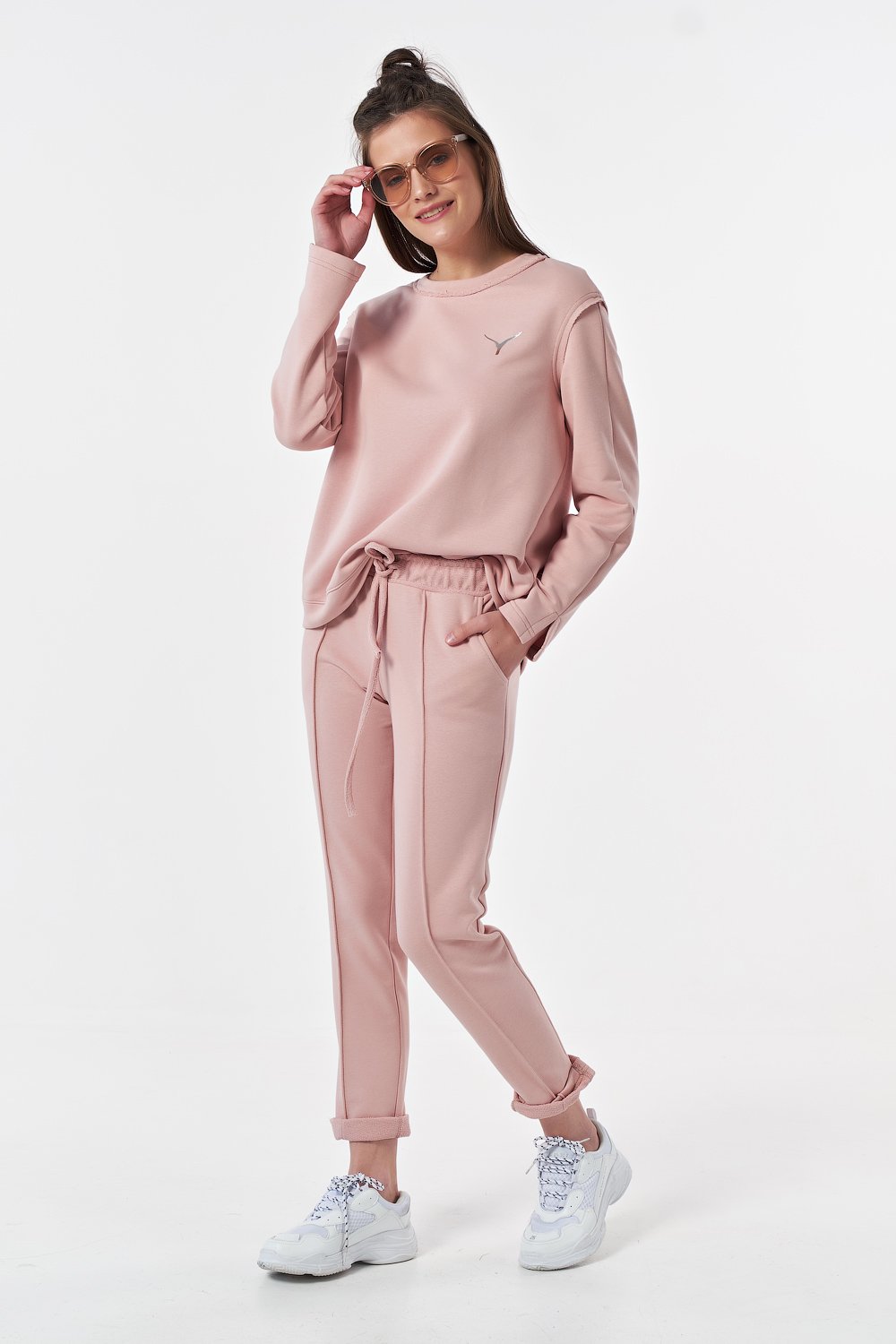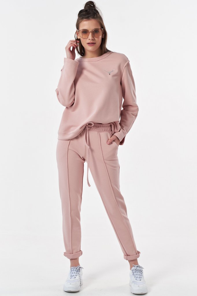 • Особенности: Костюм состоит из свитшота и брюк. Свитшот: свободного силуэта с необработанными краями разрезами по рукавам и по спинке с нанесенным серебристым логотипом по переду. Брюки: прилегающего силуэта с застроченными стрелками и карманами в боковых швах без застежки пояс-резинка с завязками.