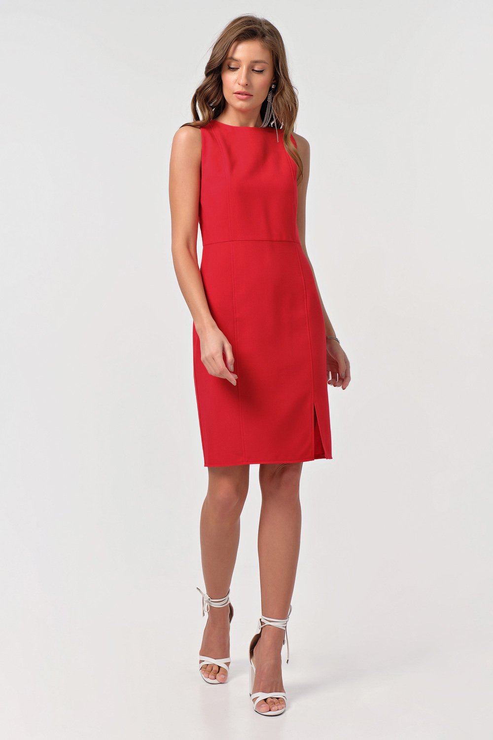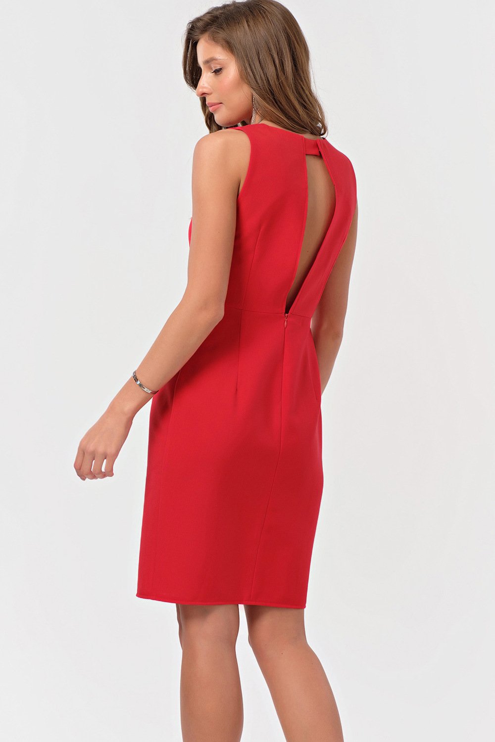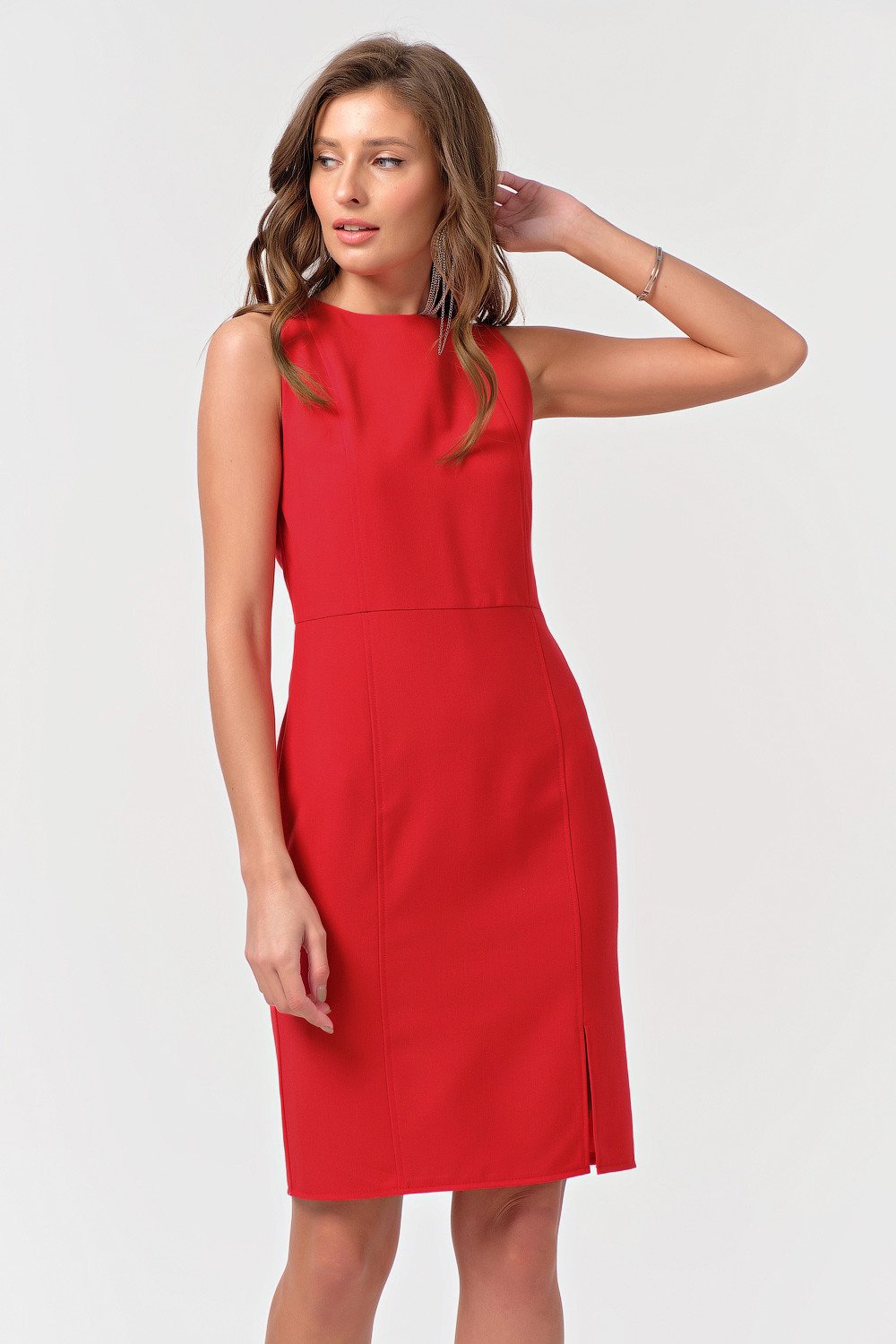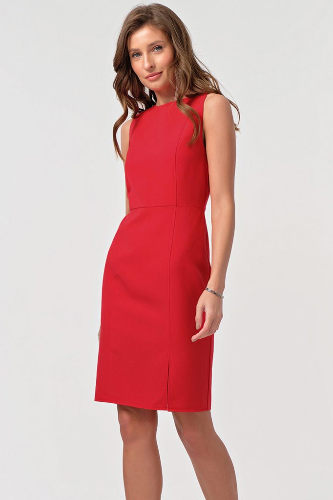 • Особенности: Платье из эластичной плательной ткани. Вертикальные рельефы по переду с настрочкой разрез по переду глубокий вырез по спинке с перемычкой по горловине.
