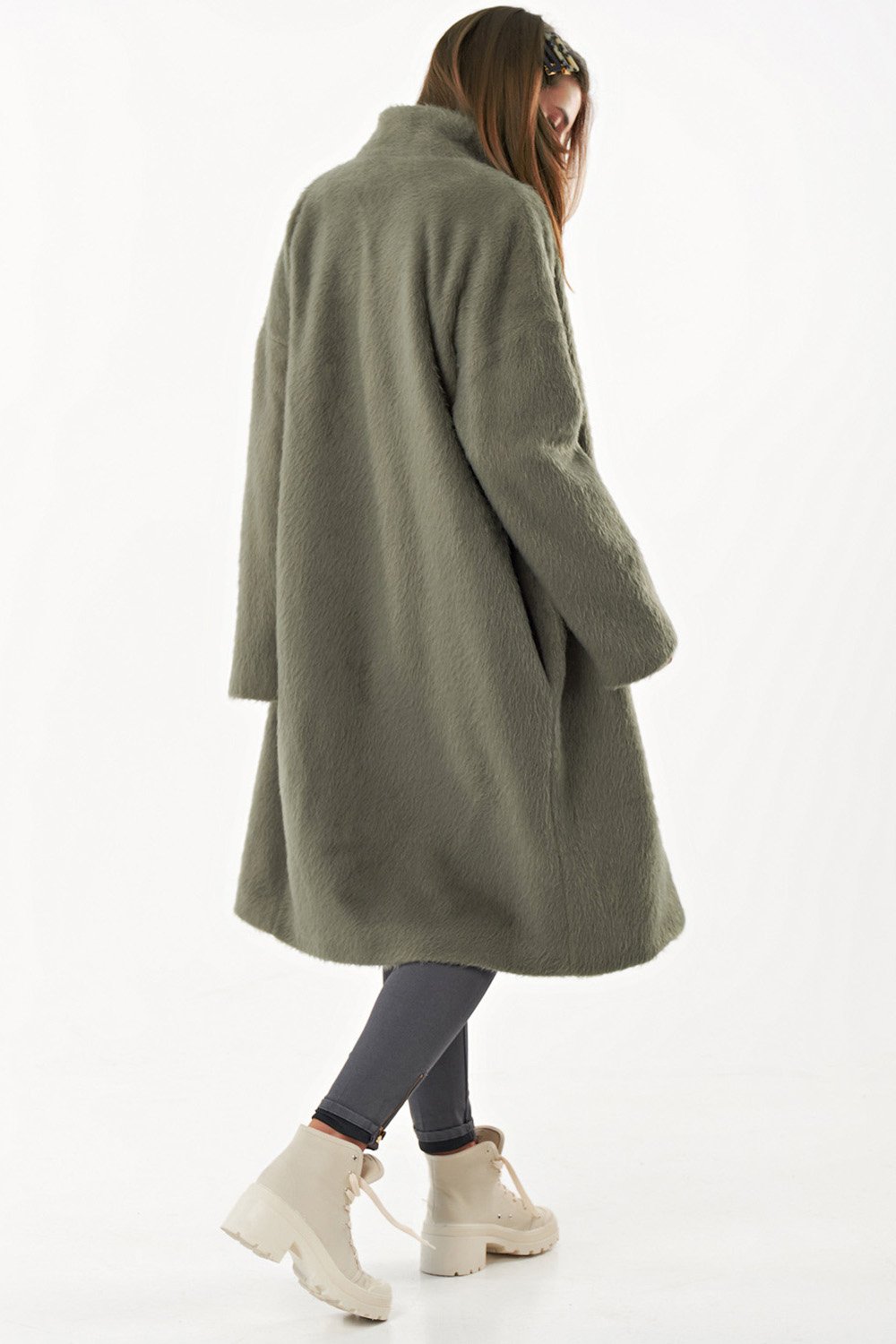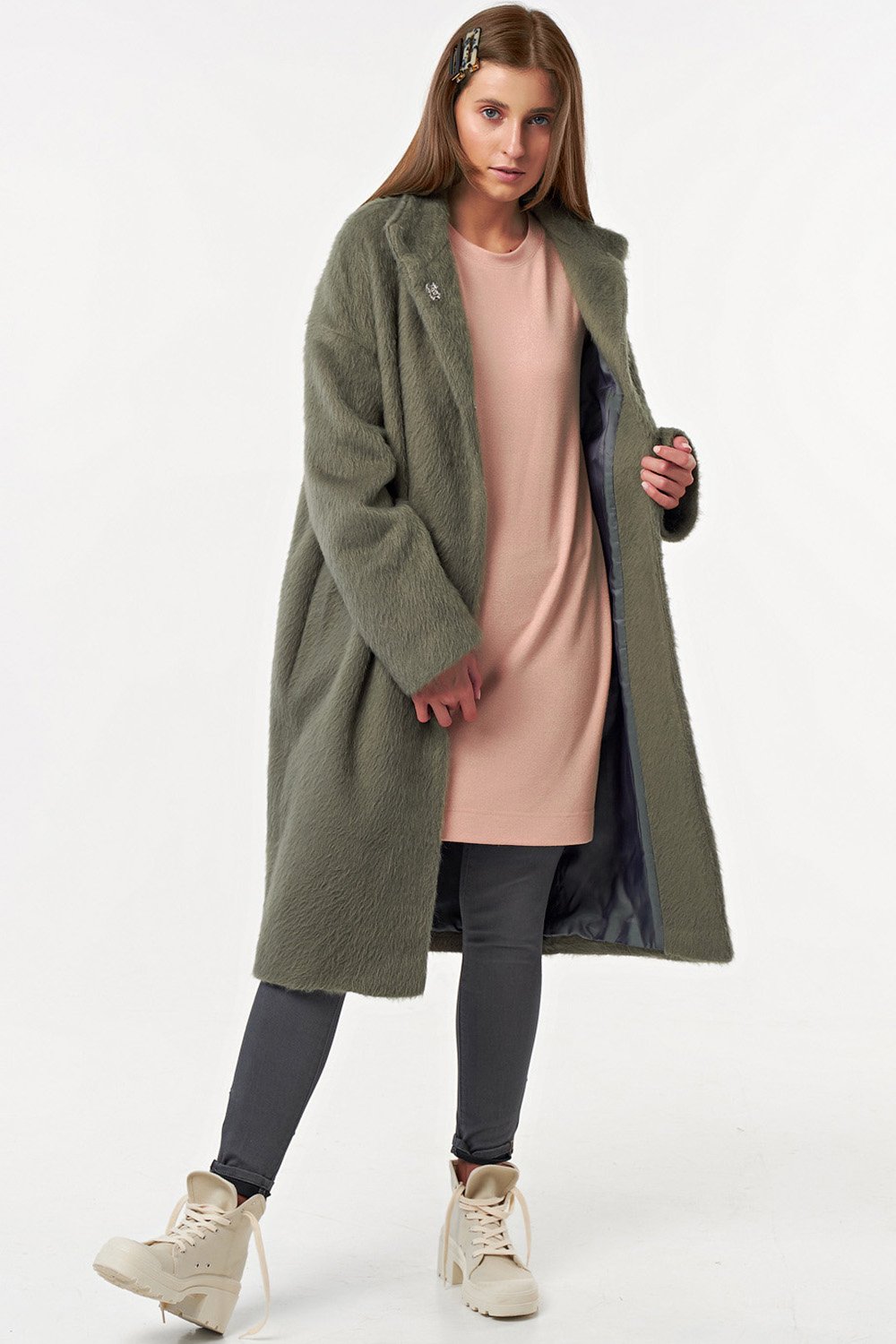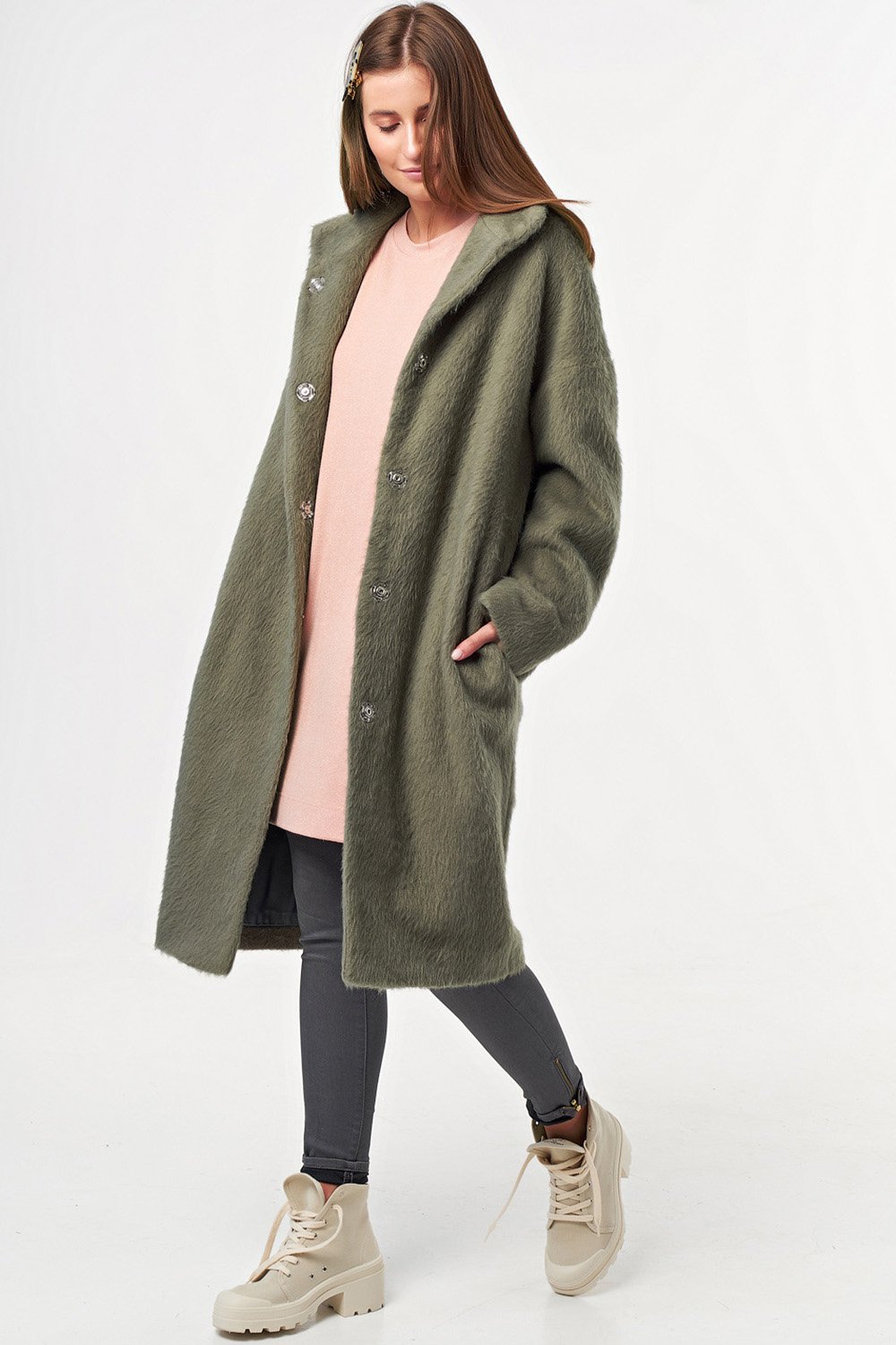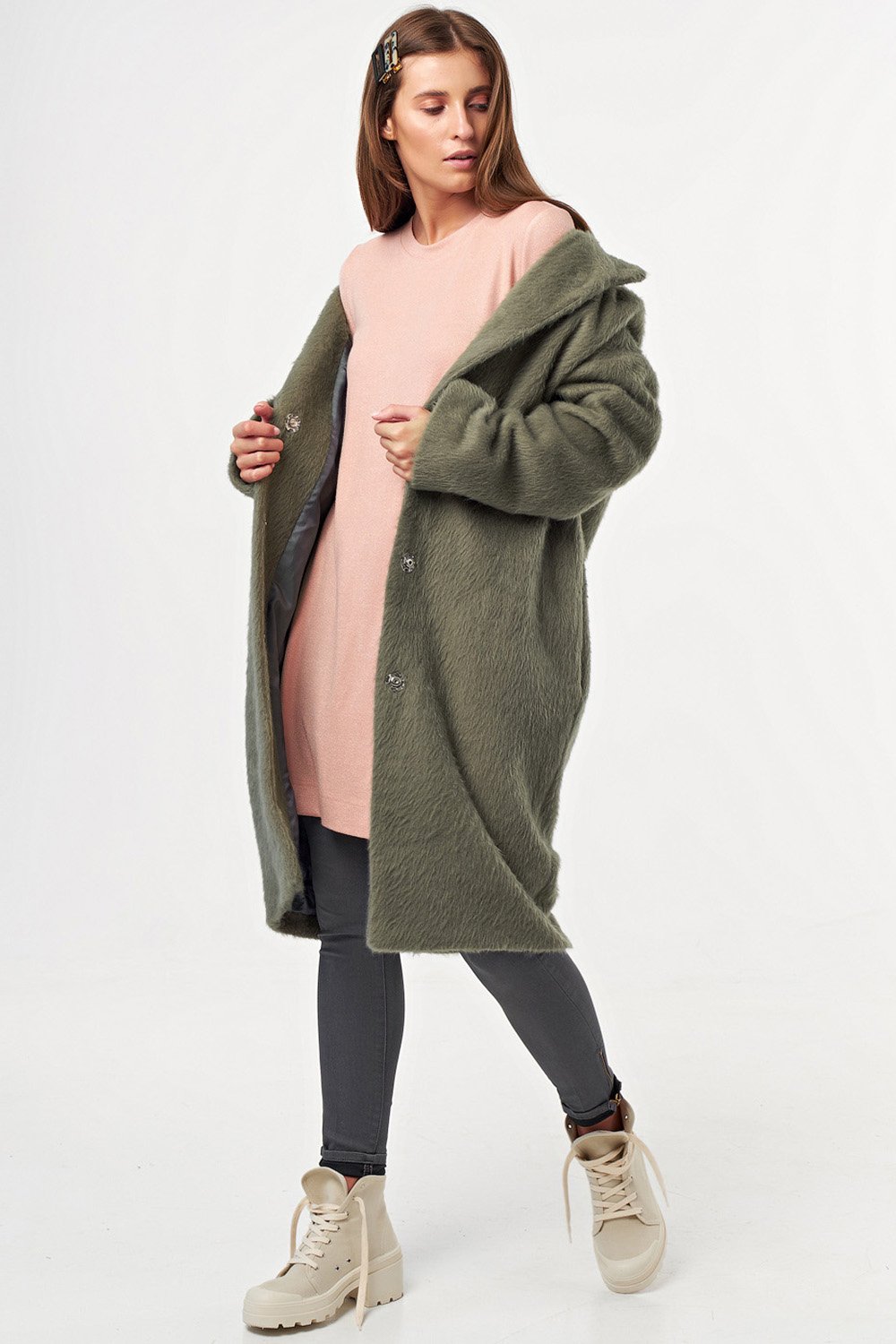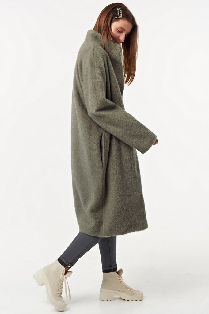 • Особенности: Пальто свободного силуэта oversize слегка заужено книзу. Ткань пальтовая с длинным ворсом. Детали: воротник стойка втачной рукав со спущенной проймой застежка на кнопки. Изделие на подкладке.
