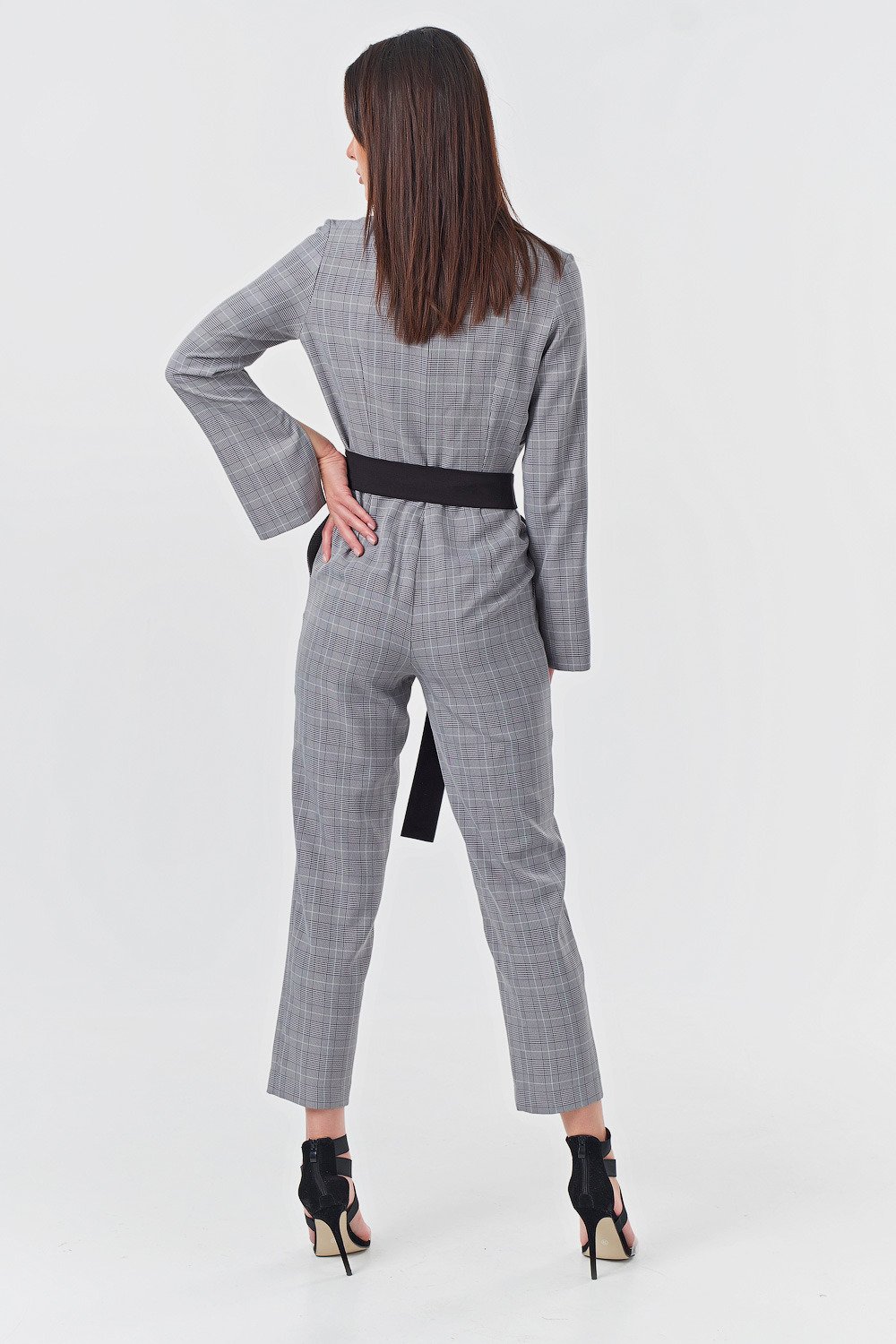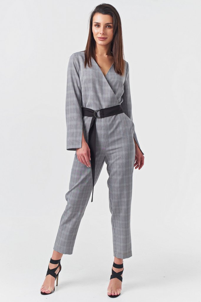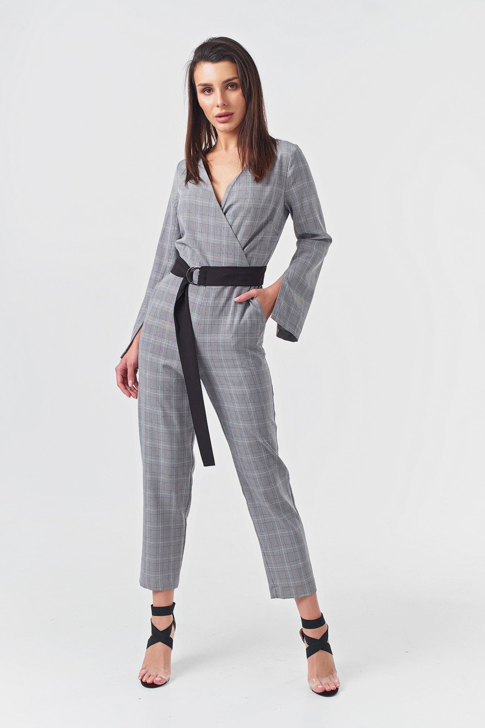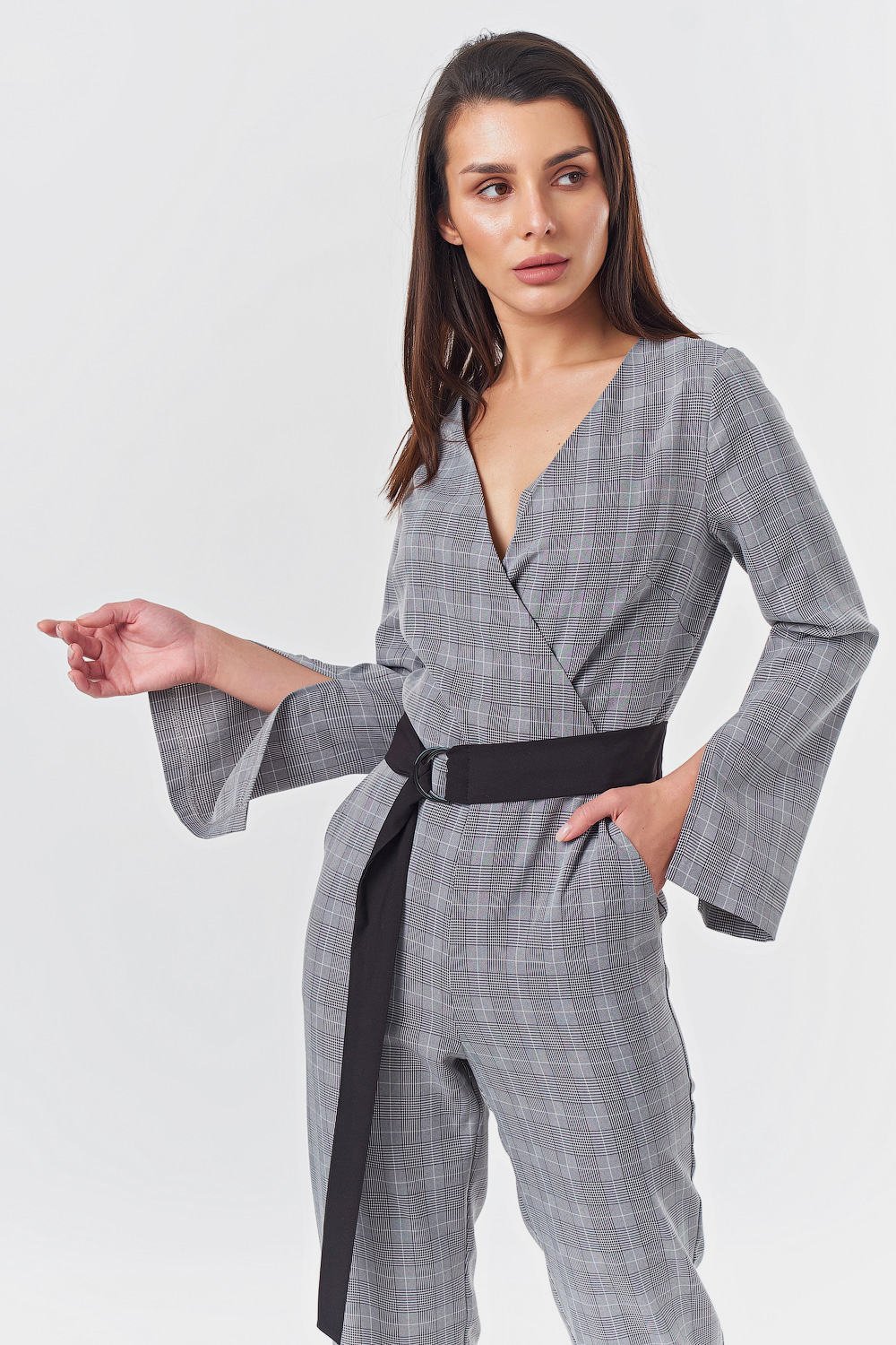 • Особенности: Комбинезон из костюмной ткани в клетку. Детали: V-образный вырез горловины запах вытачки втачной расклешенный рукав с разрезом по низу. Отрезной по талии брючные карманы застежка на потайную молнию пояс контрастного цвета с металлической пряжкой в комплекте.