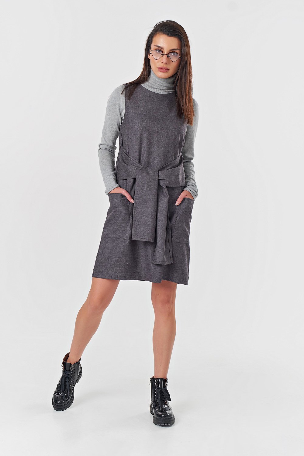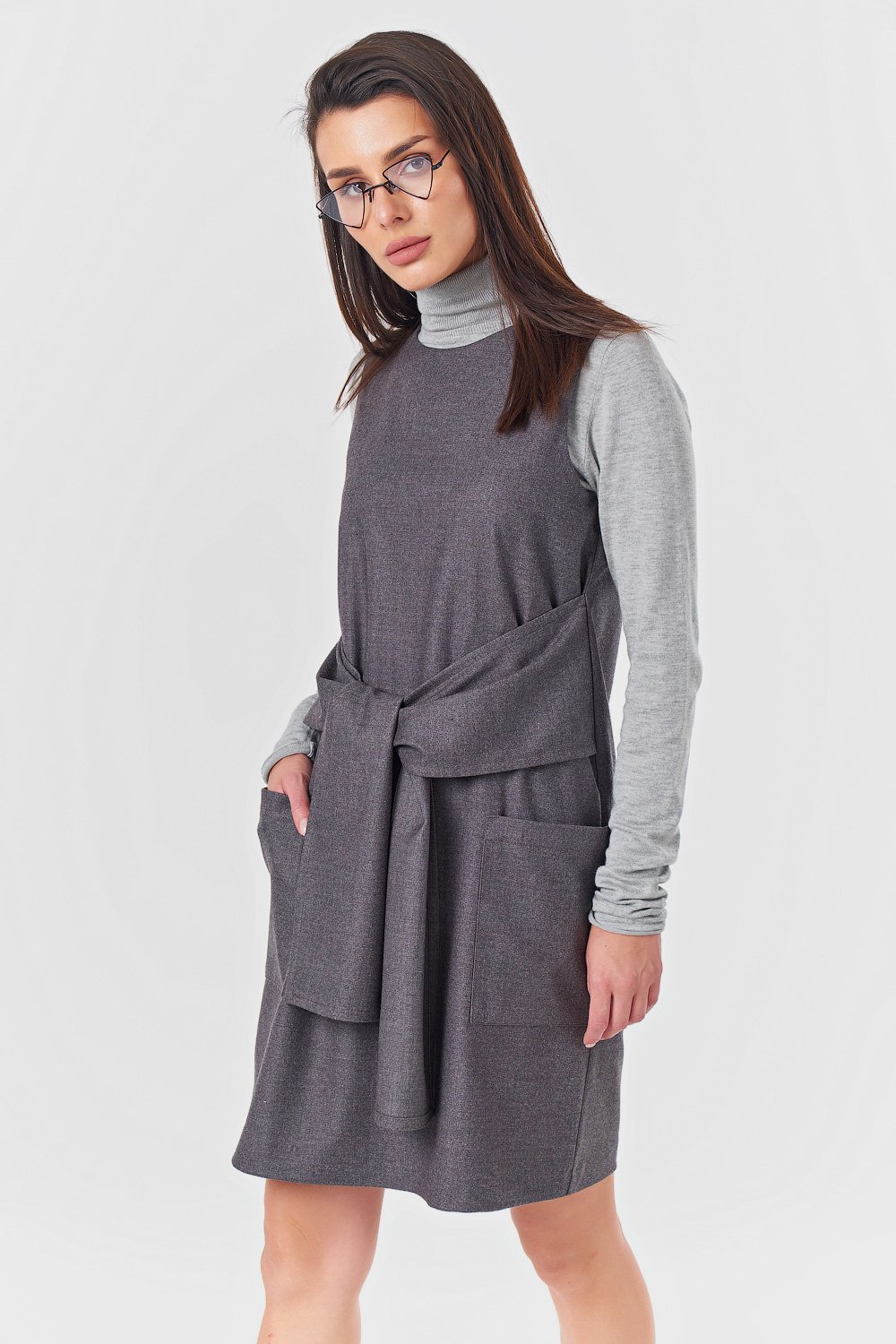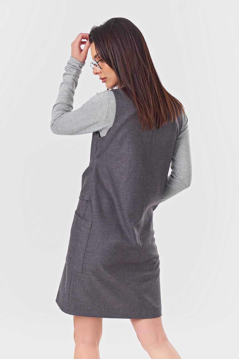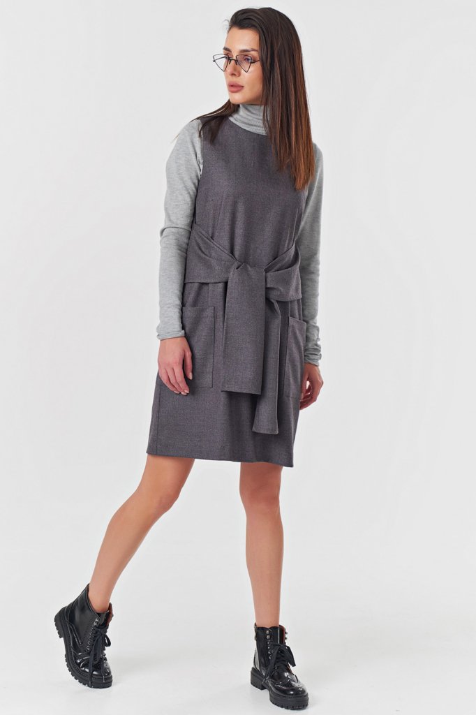 • Особенности: Сарафан из плотной костюмной ткани. Детали: горловина округлой формы широкий притачной пояс накладные карманы.