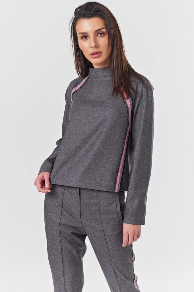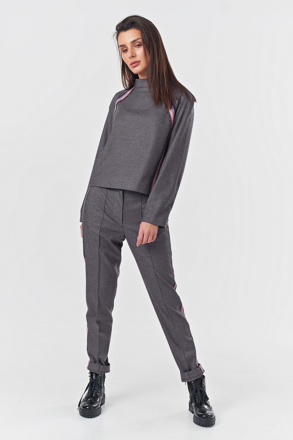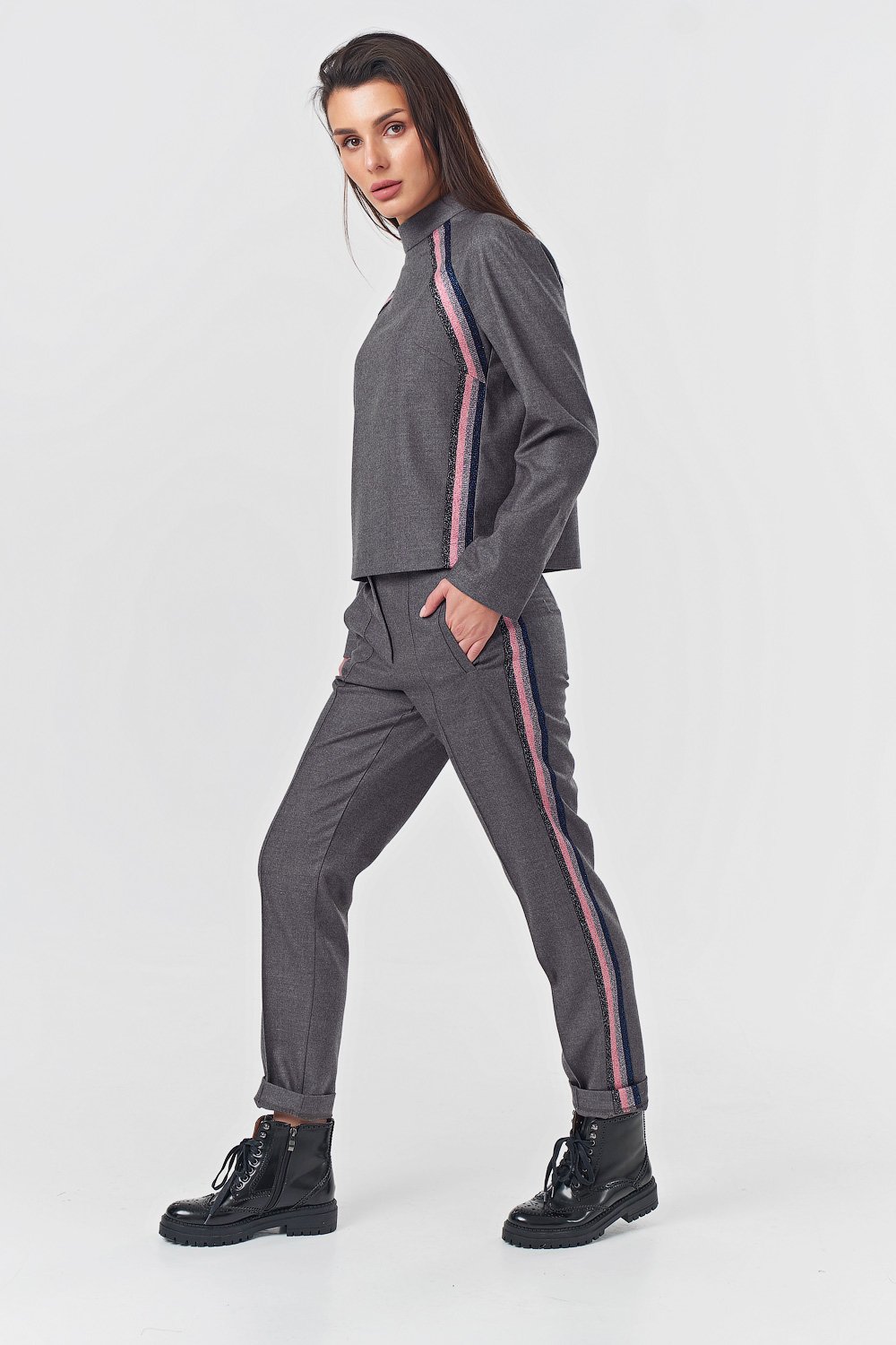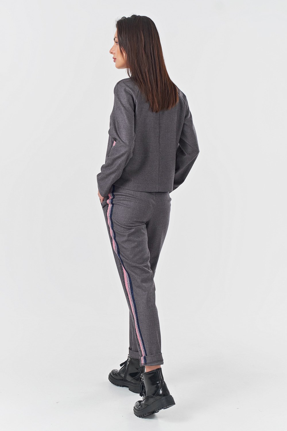 • Особенности: Костюм из плотной костюмной ткани с лампасами. Детали верха: воротник-стойка рукав реглан настроченный лампас вытачки по спинке - потайная молния. Детали брюк: прорезные карманы с листочкой лампасы застроченные стрелки молния.