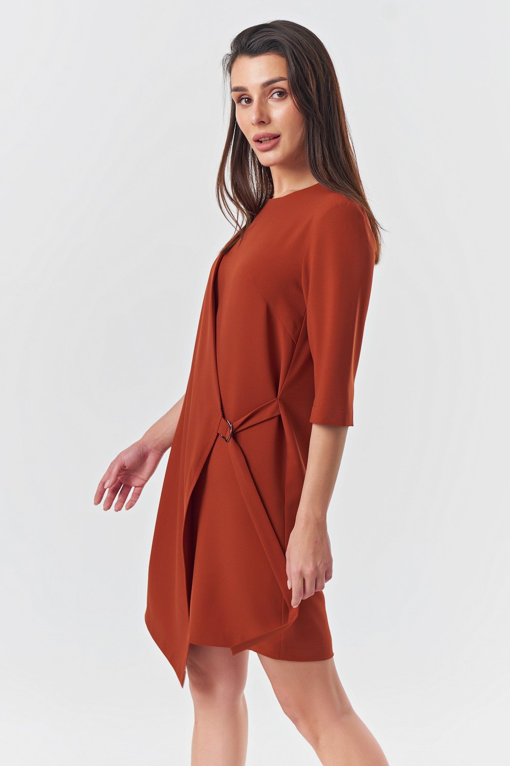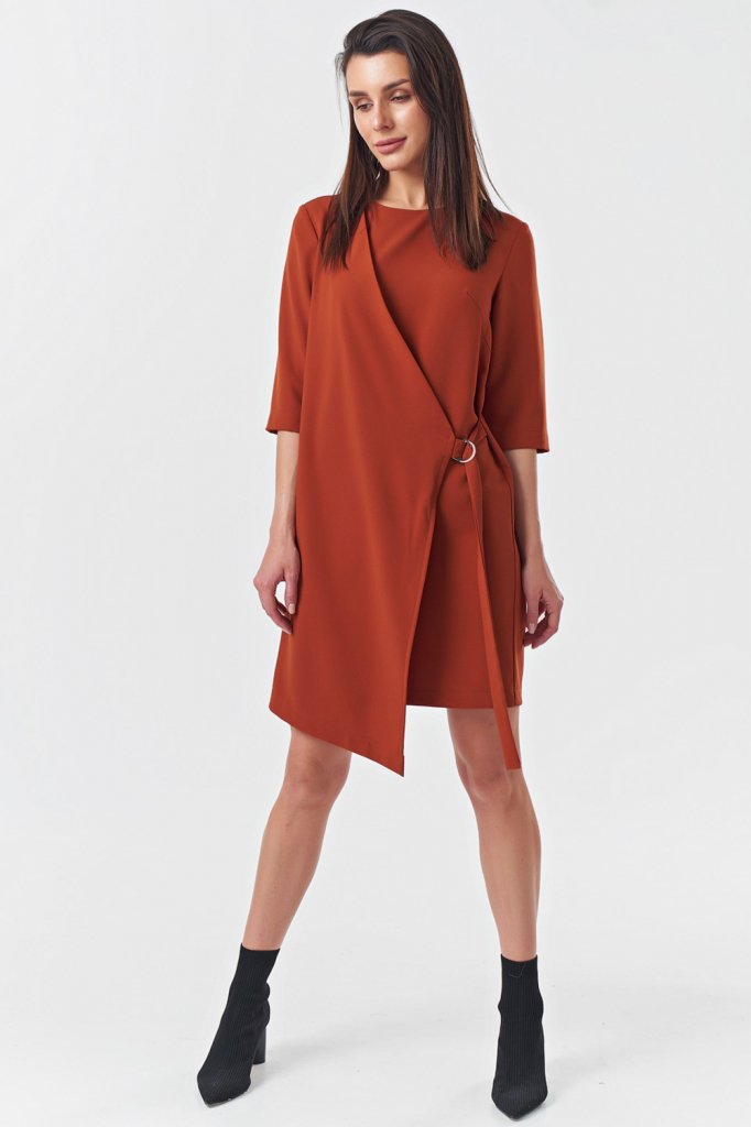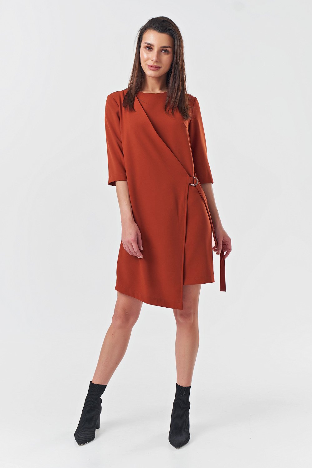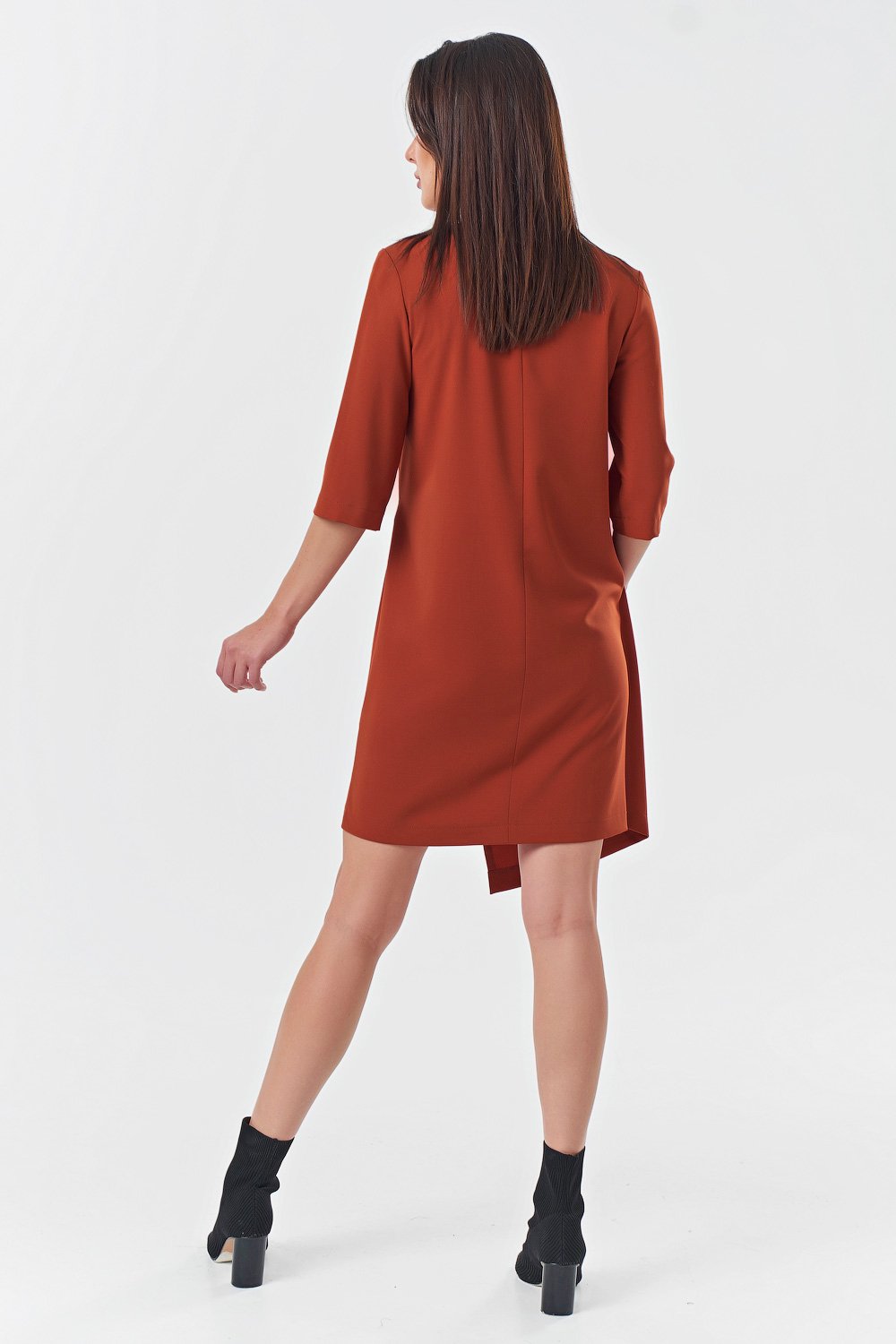 • Особенности: Платье прямого силуэта из плательной ткани. Детали: горловина обработана обтачкой по переду асимметричная отлетная деталь которая крепится к боковому шву с помощью полупояса и полукольца. Застежка на молнию в среднем шве спинки.