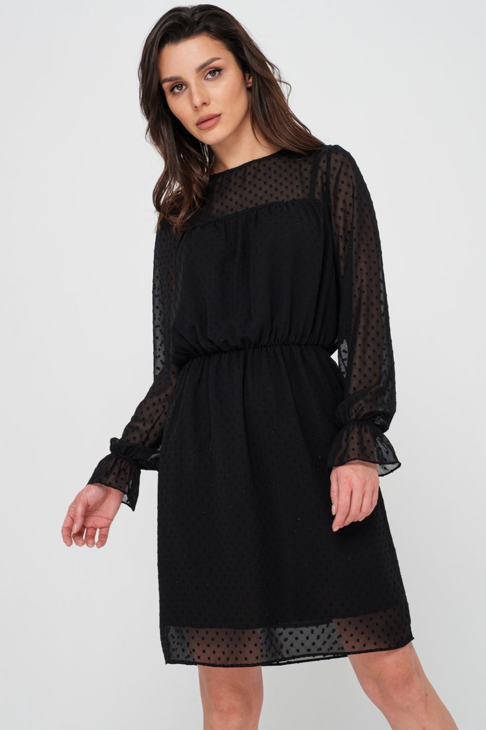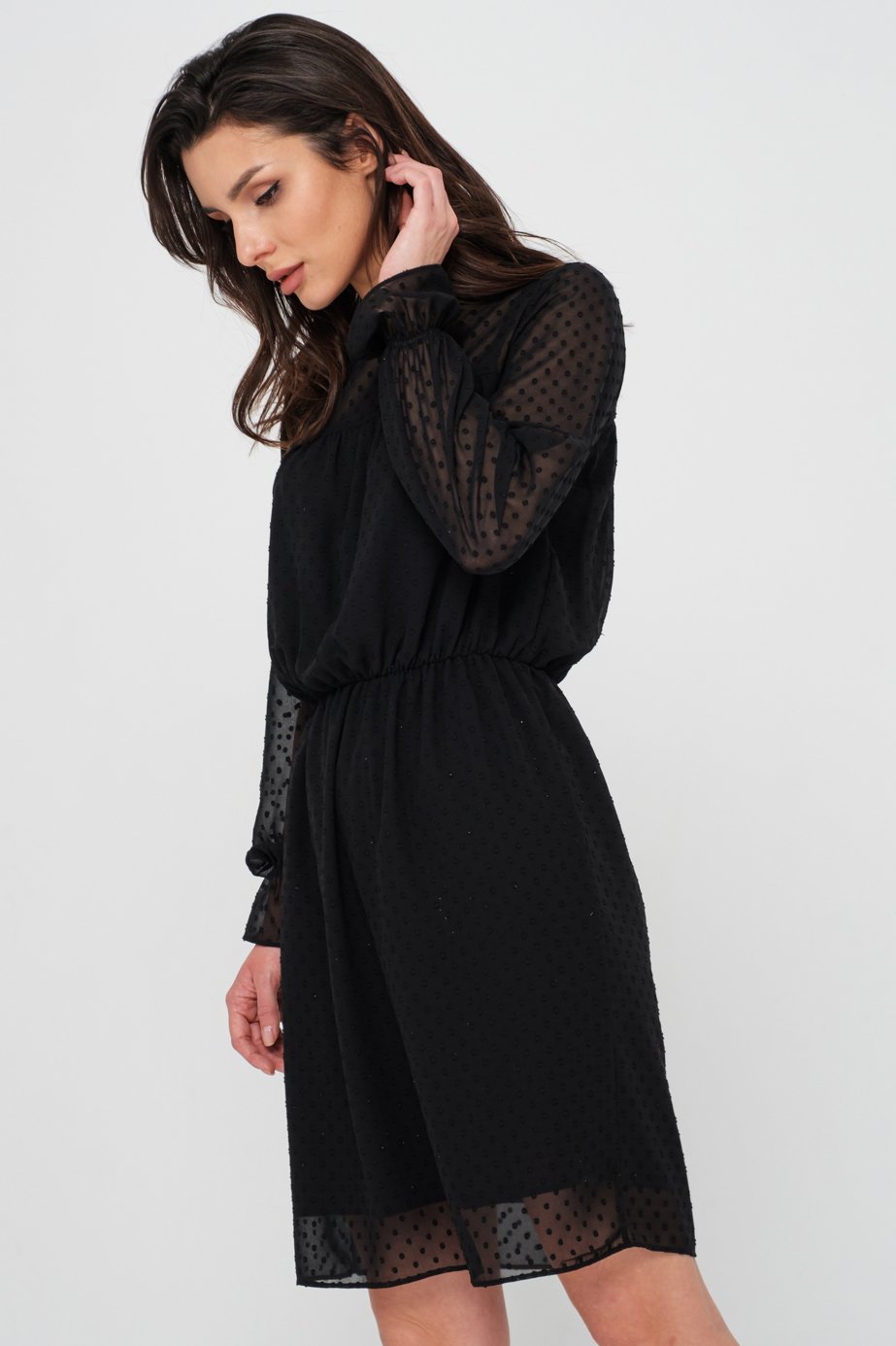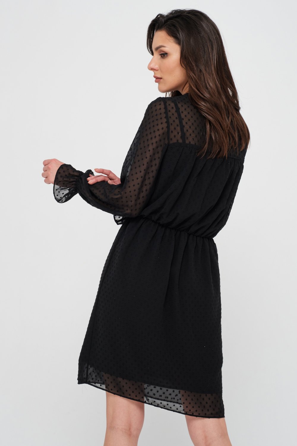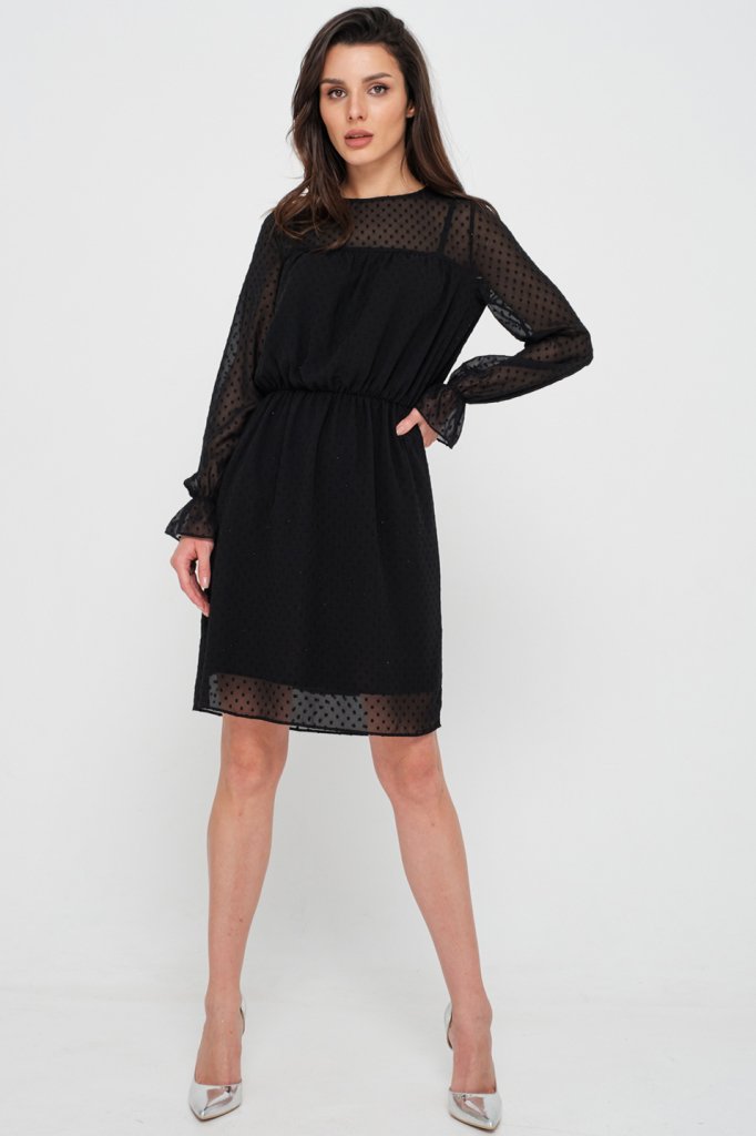 • Особенности: Платье из шифона плюмети на подкладке. Детали: Горловина округлой формы втачной рукав со сборкой по низу. Платье отрезное по талии со сборкой на резинку.