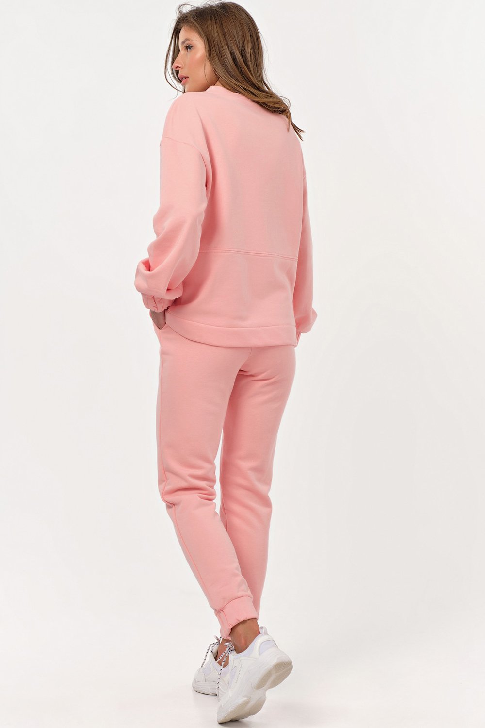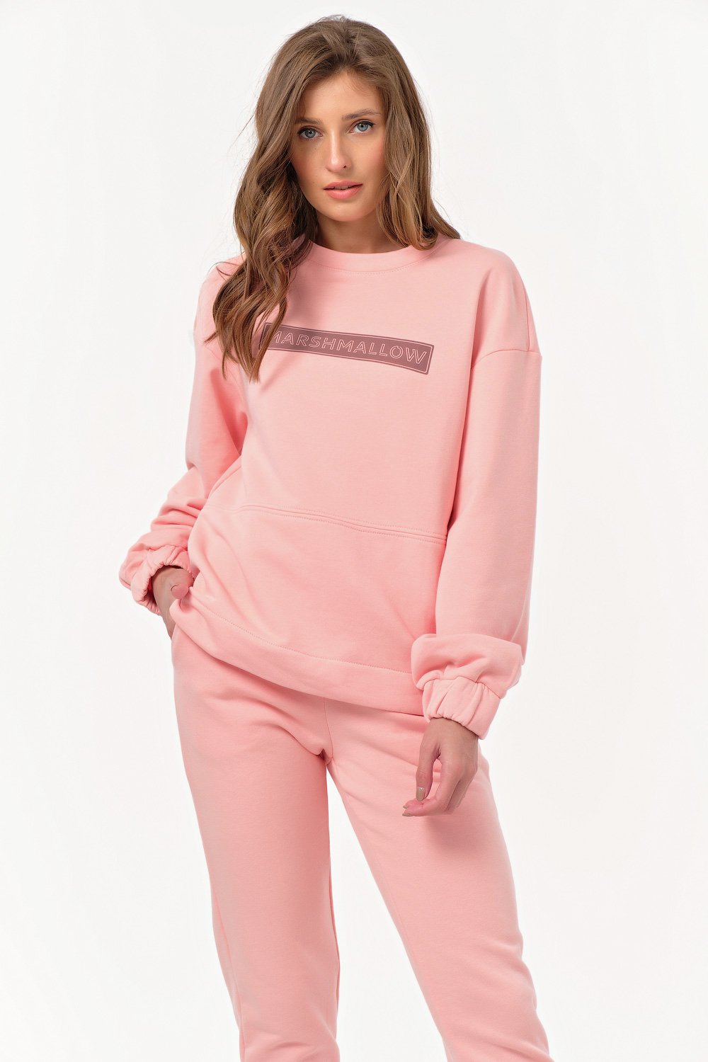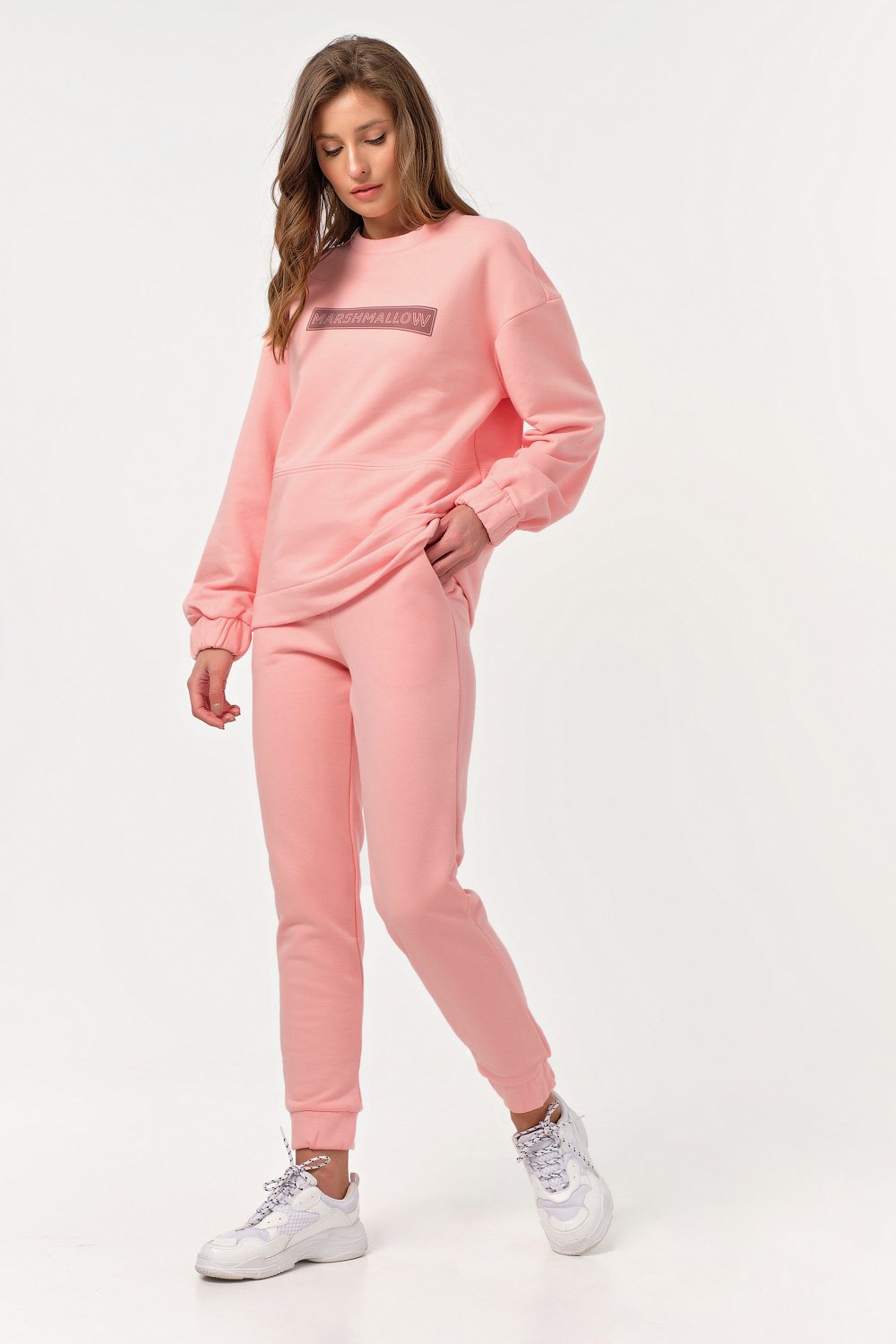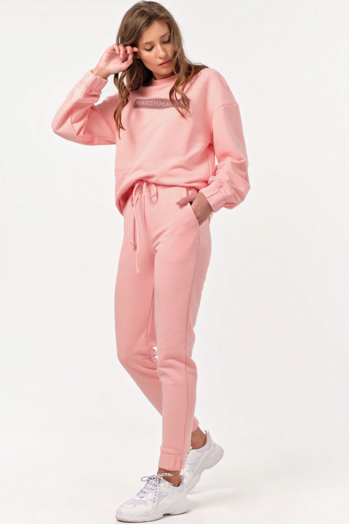 • Особенности: Костюм из трикотажа-футера. Свитшот прямого силуэта объемный. Детали: горловина обработана бейкой по переду и спинке выполнены горизонтальные членения на верхней части переда выполнена печать рукав объемный со сборкой на манжету подгибка низа с широкой настрочкой. Брюки со средней посадкой прилегающего силуэта. Детали: в поясе выполнена кулиса со шнурком брючные карманы по среднему шву выполнена настрочка с имитацией гульфика.