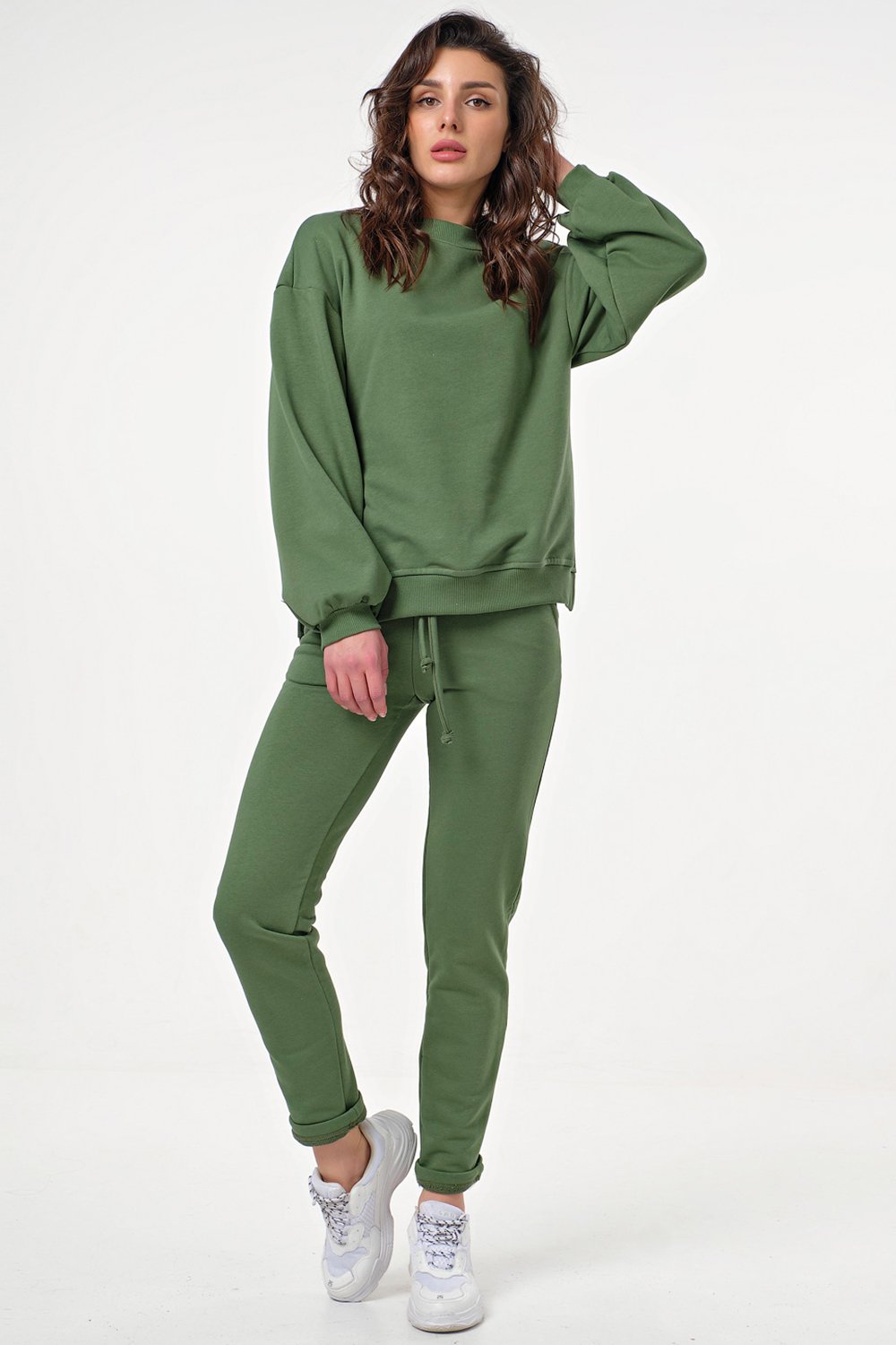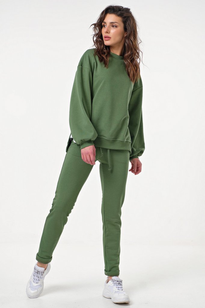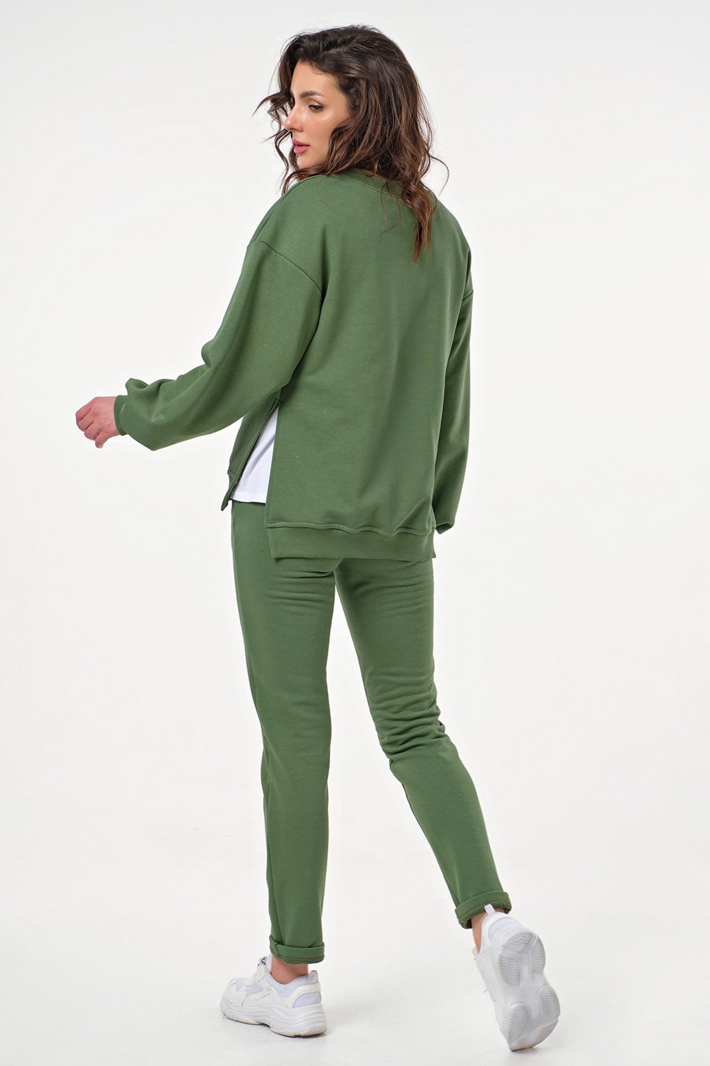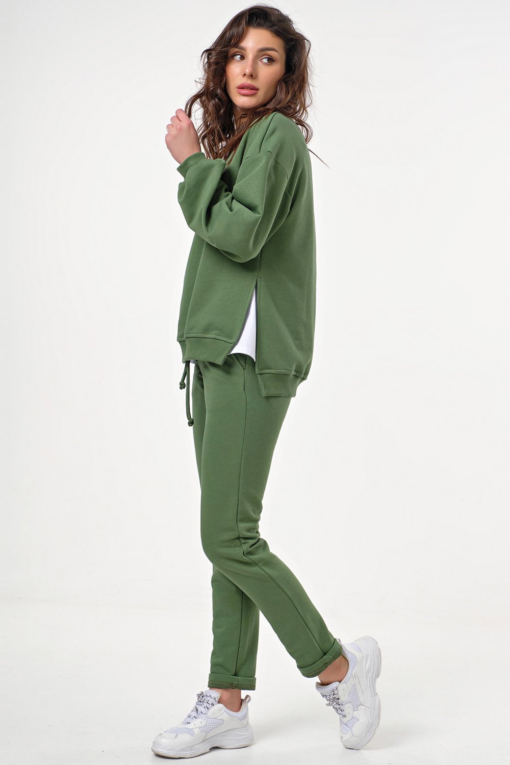 • Особенности: Костюм состоит из свитшота и брюк. Свитшот: свободного силуэта объемный рукав на манжете прилегающий воротник-стойка разрезы в боковых швах. Брюки: полуприлегающего силуэта с брючными карманами и притачным поясом.