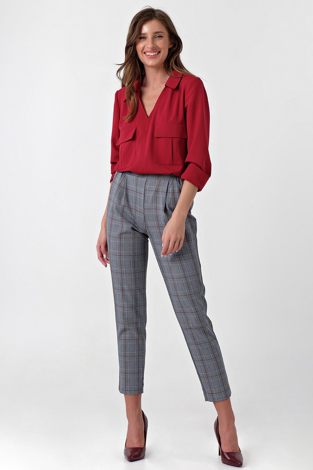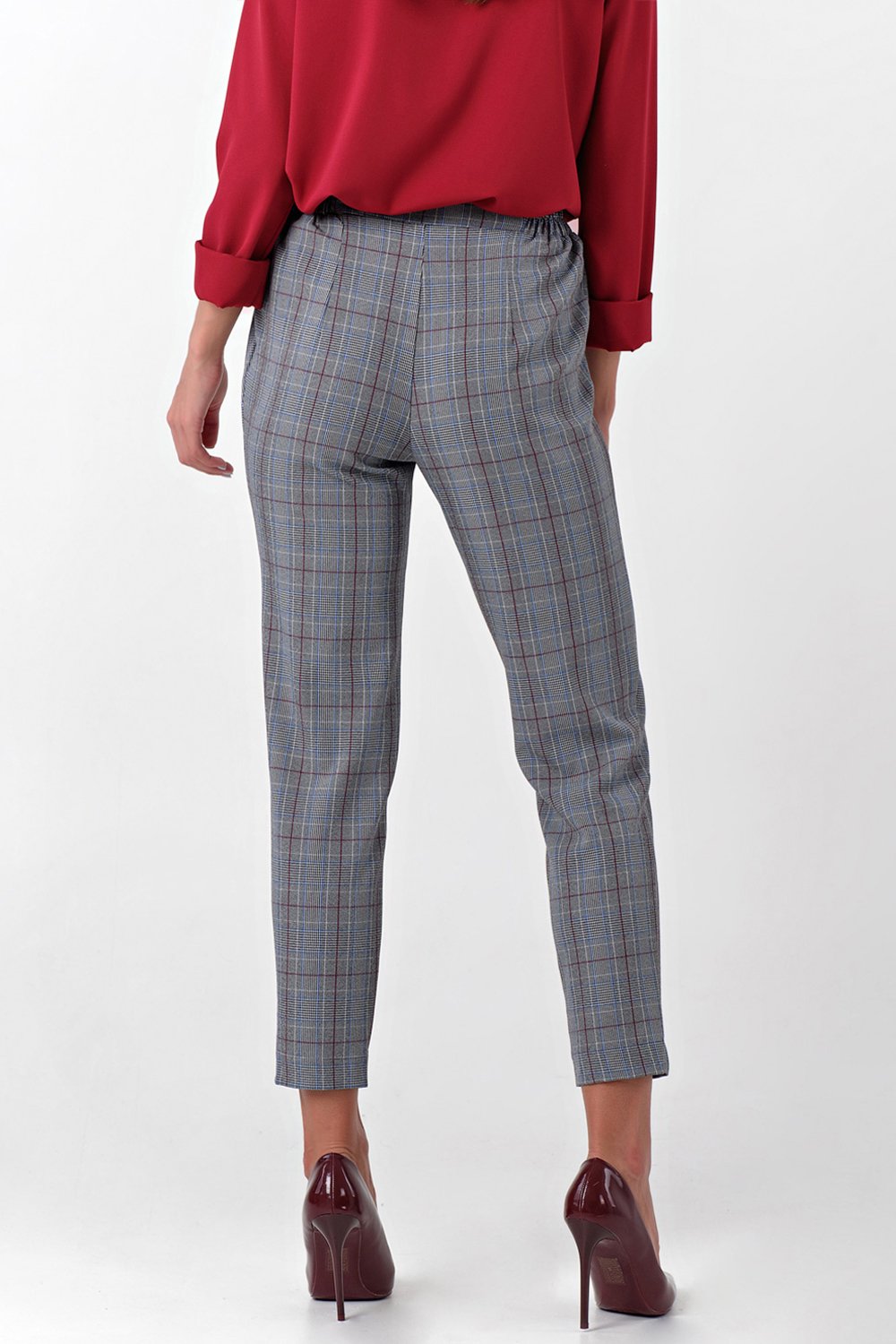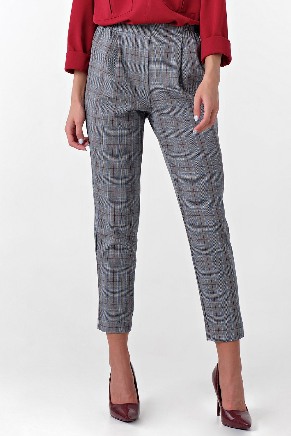 • Особенности: Брюки полуприлегающего силуэта из костюмной ткани в клетку. Детали: притачной пояс с резинкой в боковых вставках защипы зауженный книзу силуэт. Не совпадение рапорта клетки не является производственным браком.